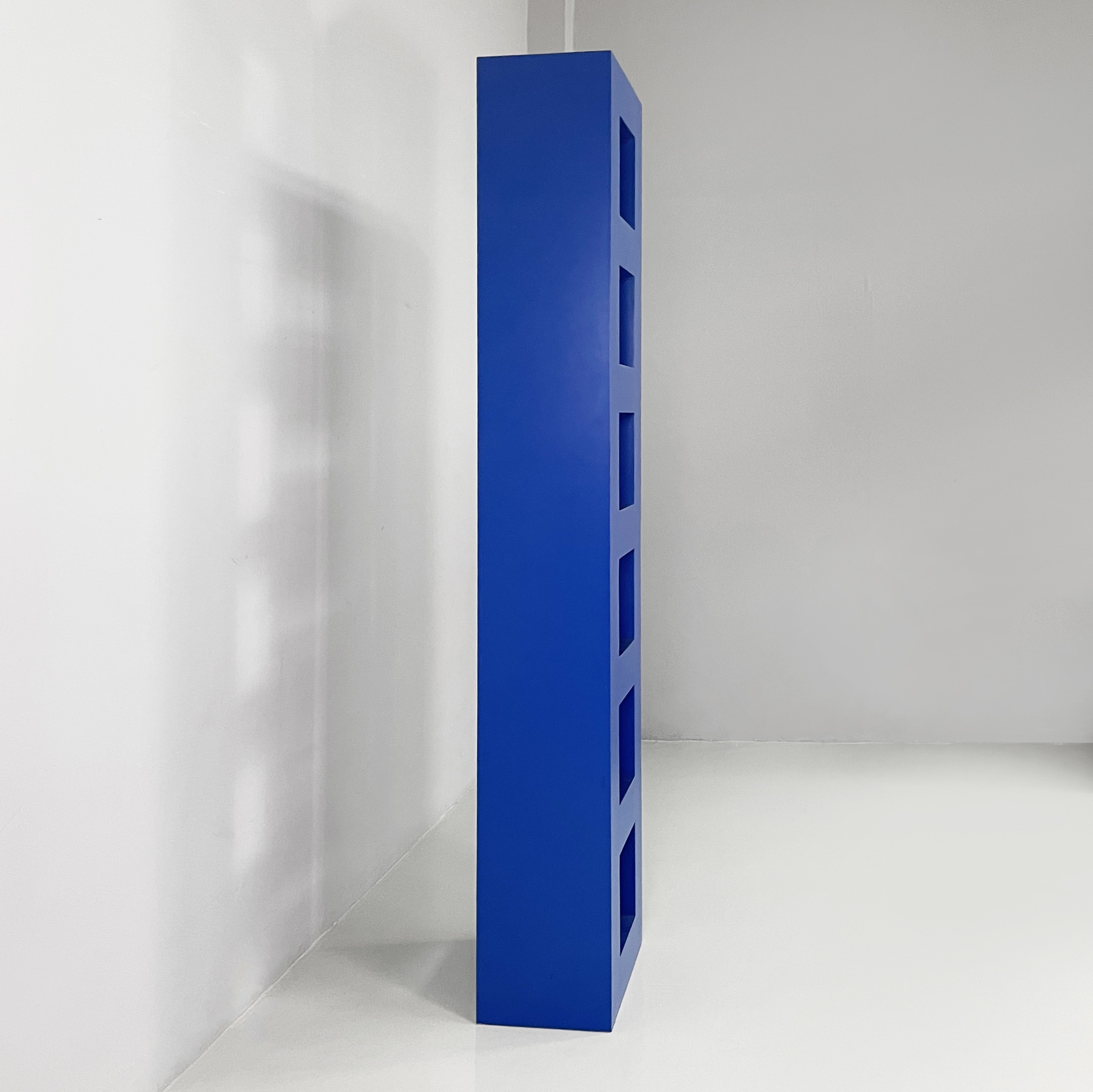 Libreria a base rettangolare interamente in legno rivestito in laminato blu. È composta da una singola colonna con sei vani squadrati.