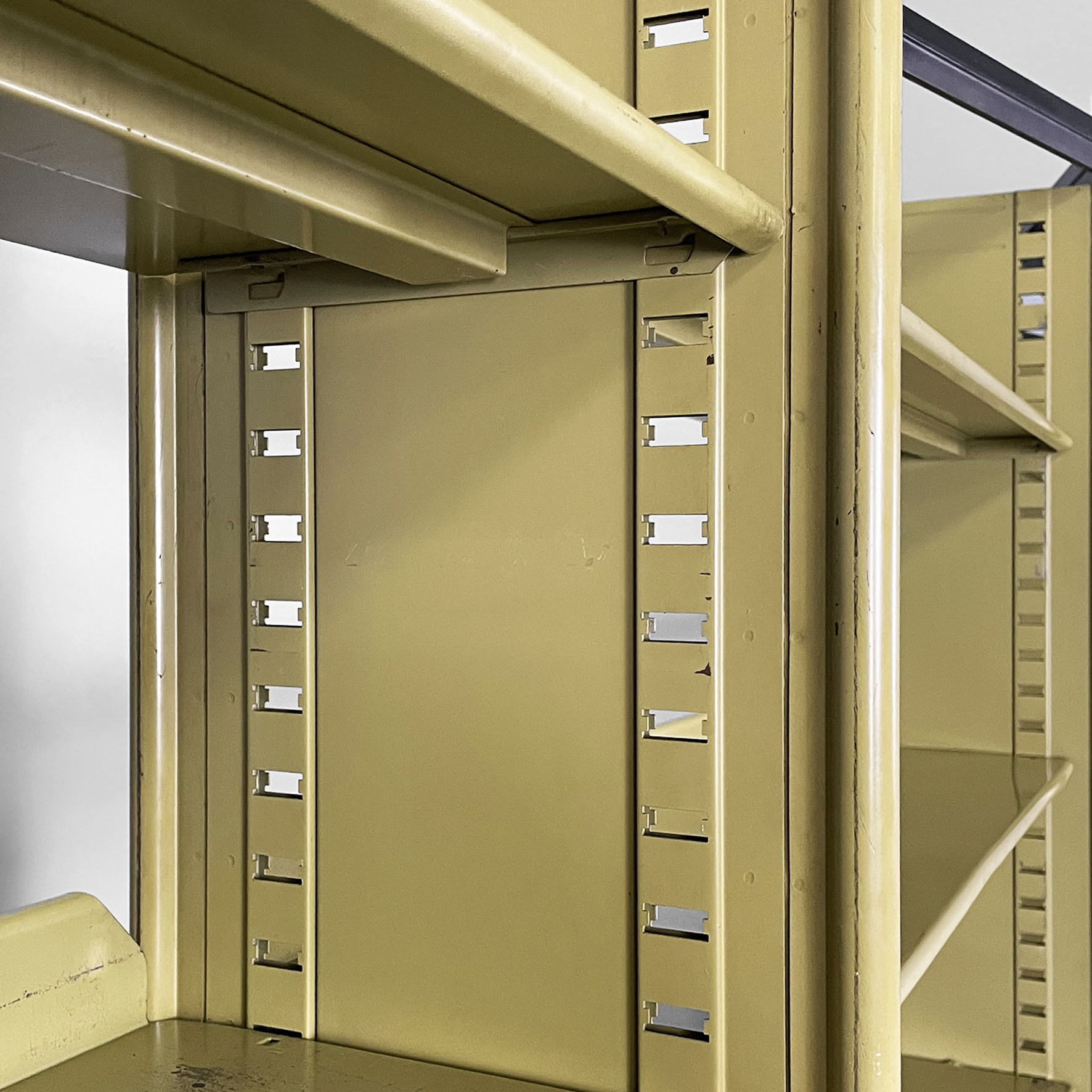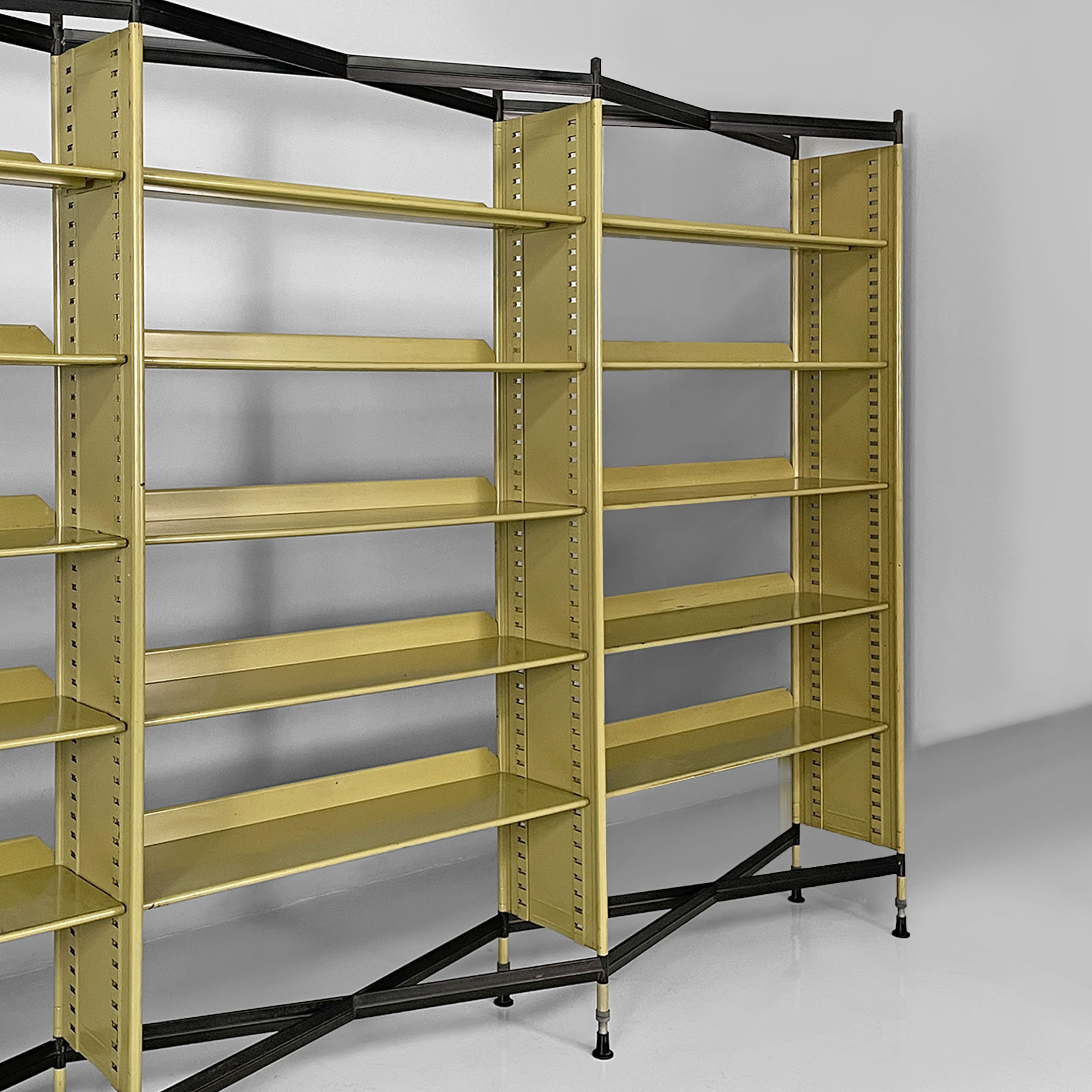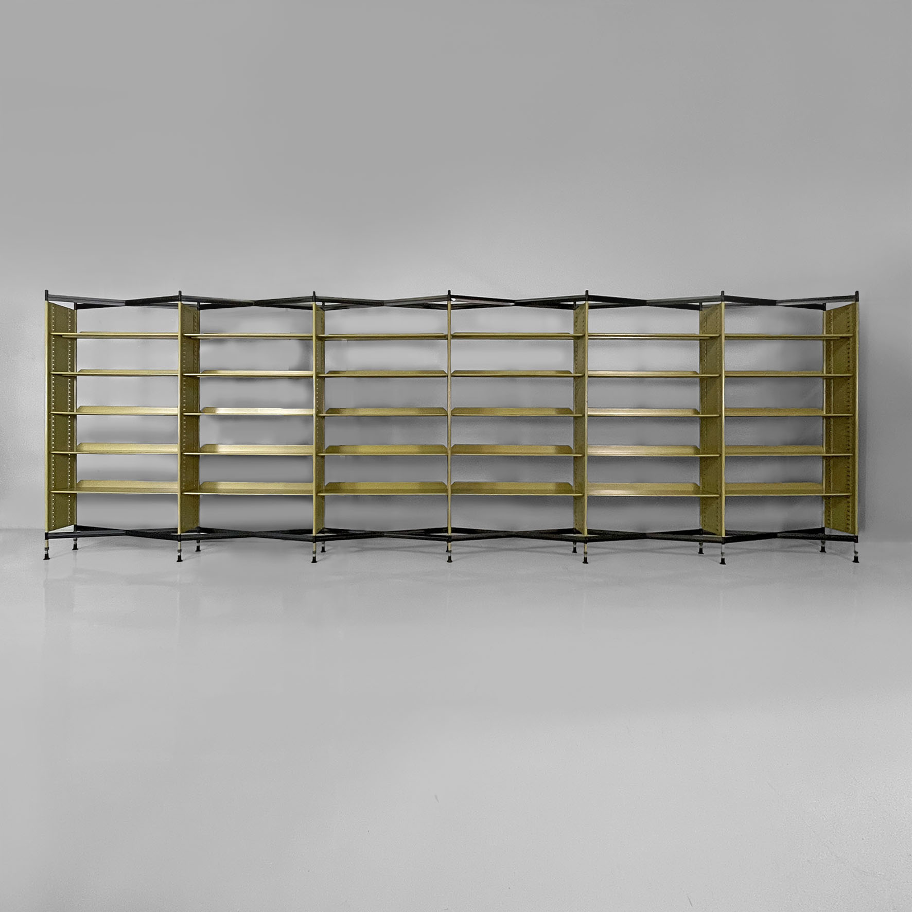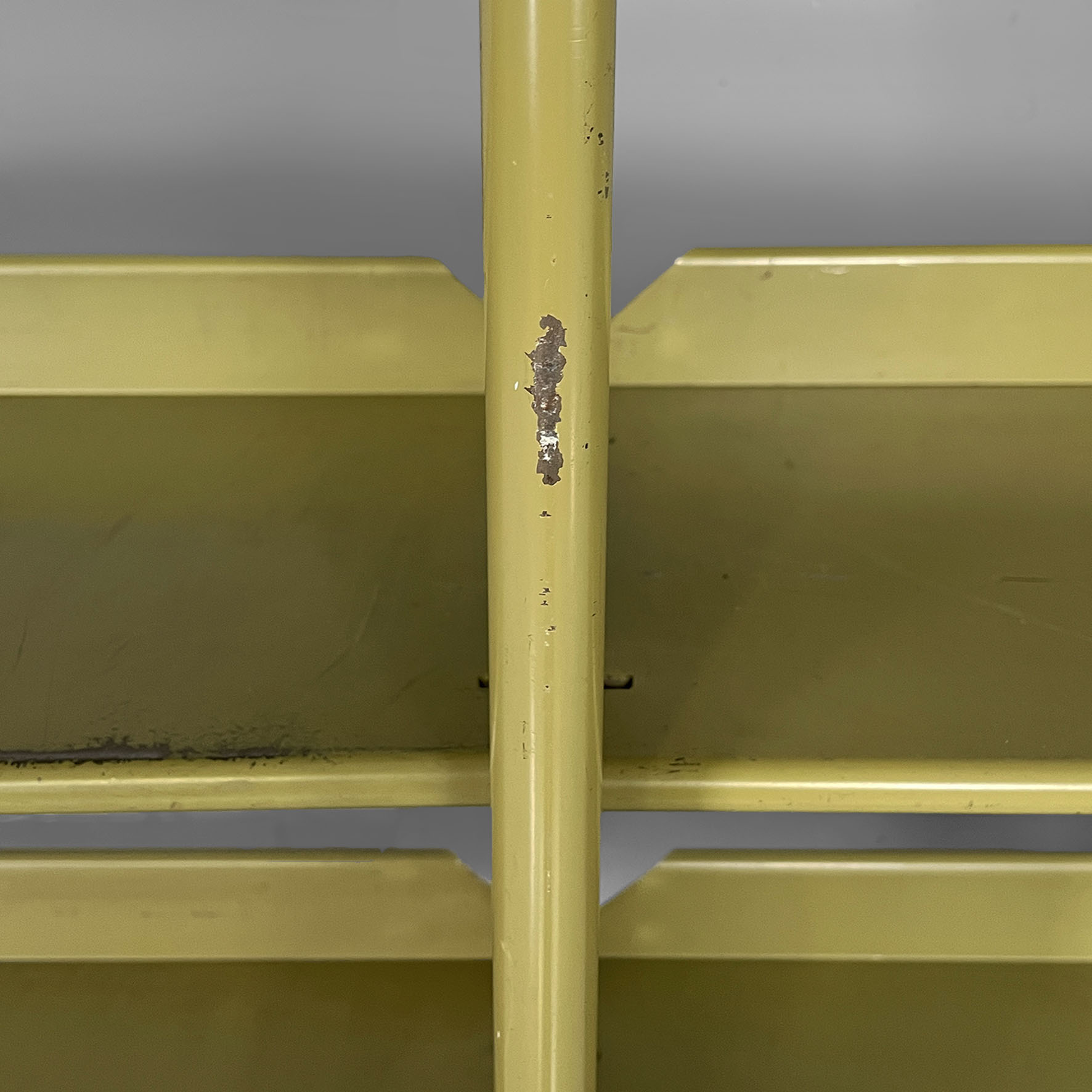 Libreria o scaffale modulare interamente in metallo colore verde pistacchio a sei campate. Presenta ripiani rettangolari che si agganciano ai montanti verticali e possono essere posizionati a piacere. I piedini sono regolabili. Può essere usato anche come espositore.