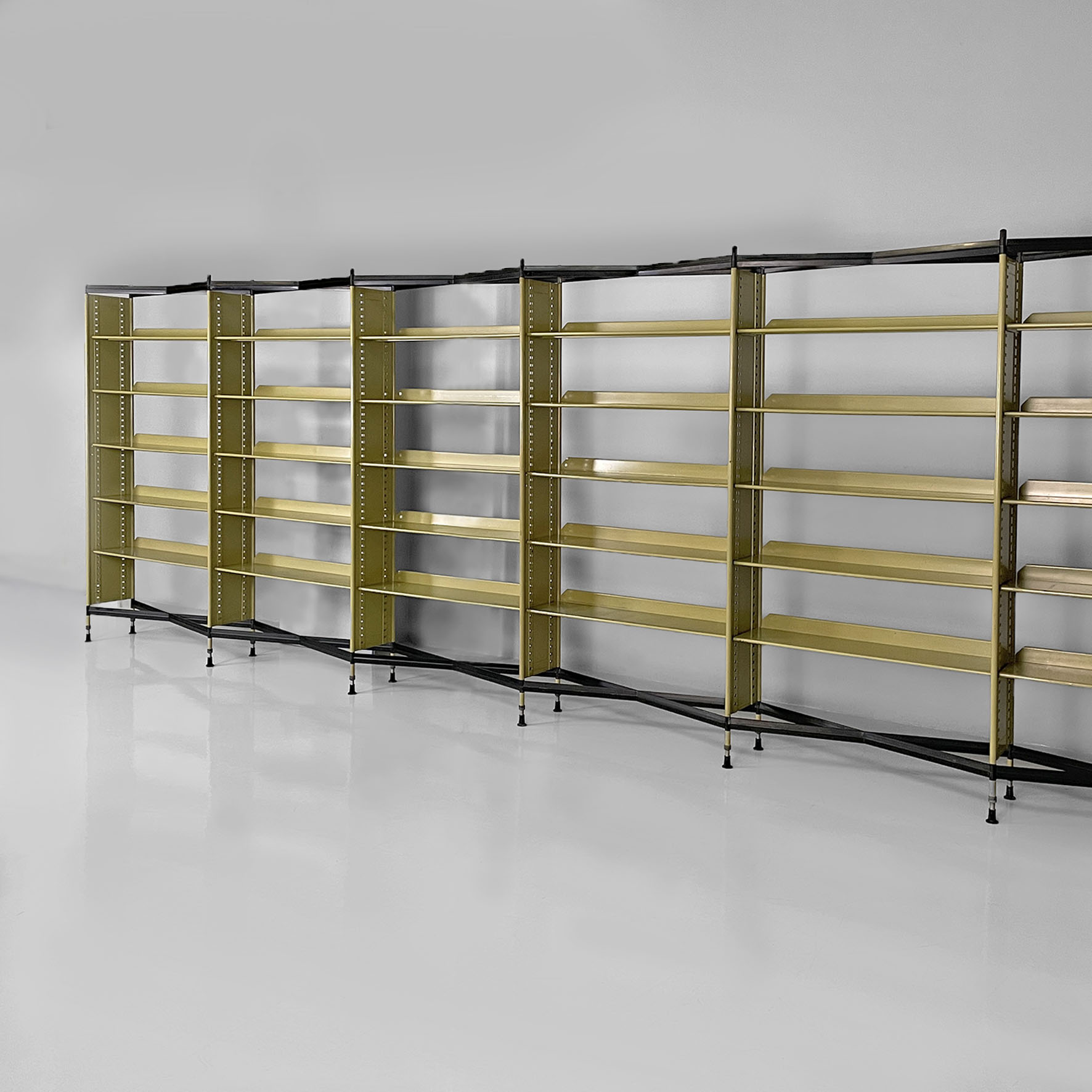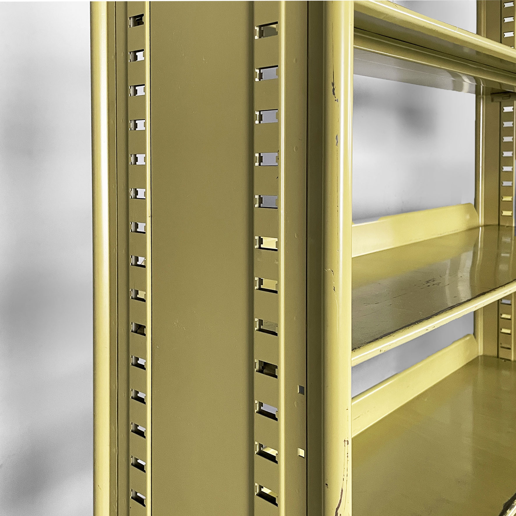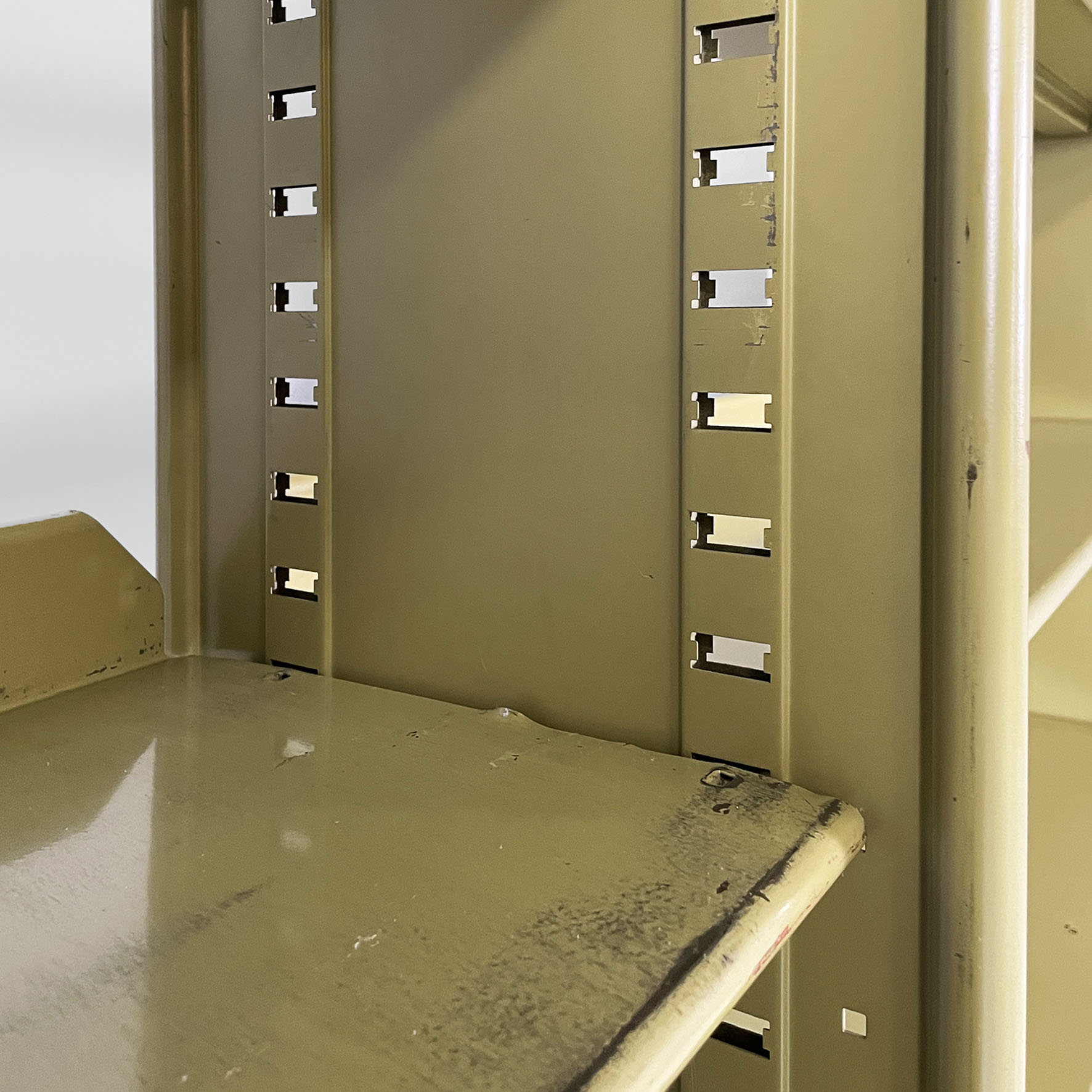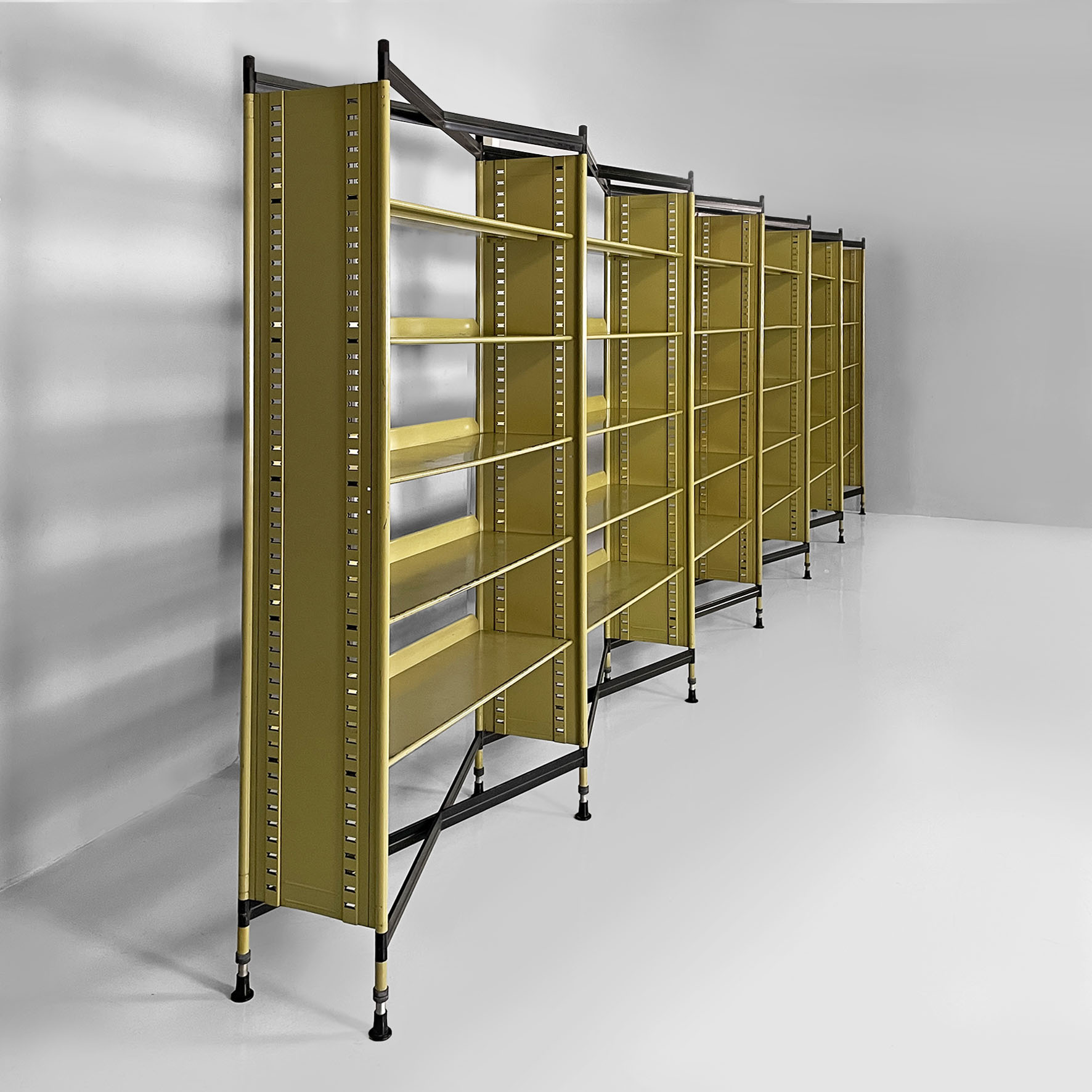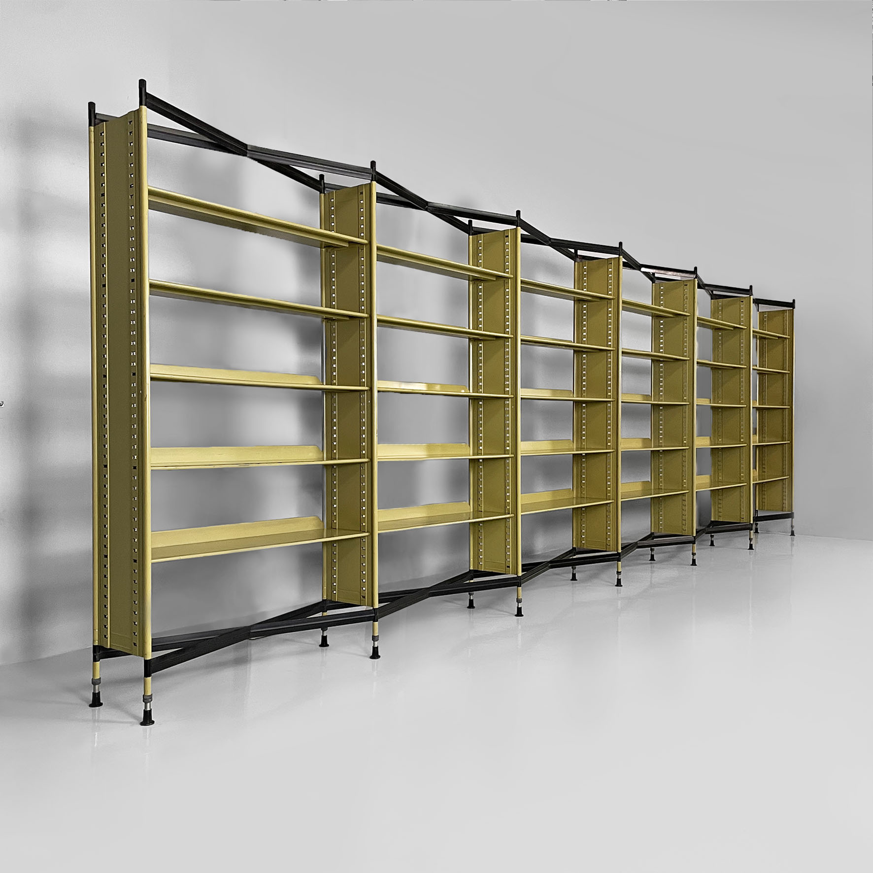 Libreria o scaffale modulare interamente in metallo colore verde pistacchio a sei campate. Presenta ripiani rettangolari che si agganciano ai montanti verticali e possono essere posizionati a piacere. I piedini sono regolabili. Può essere usato anche come espositore.