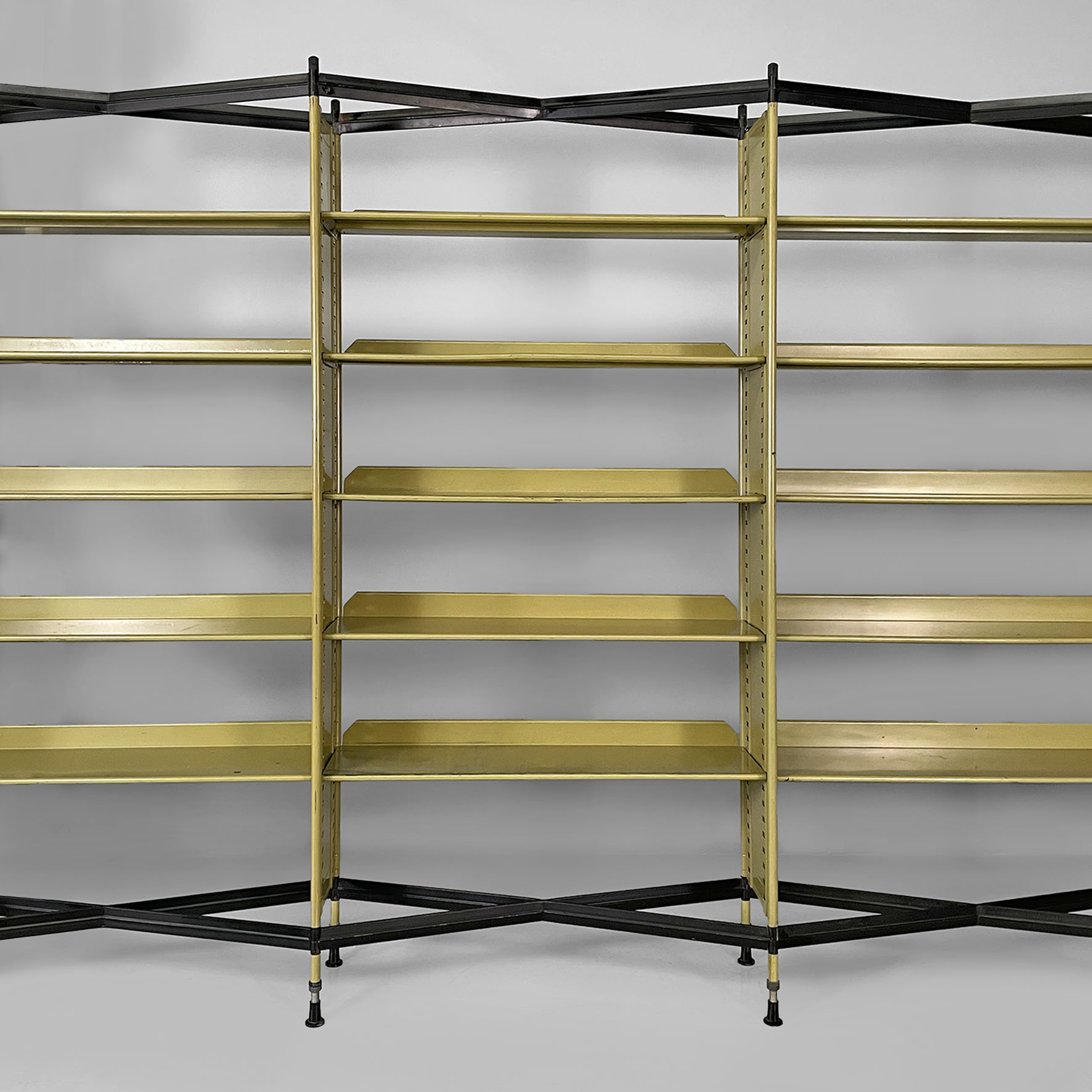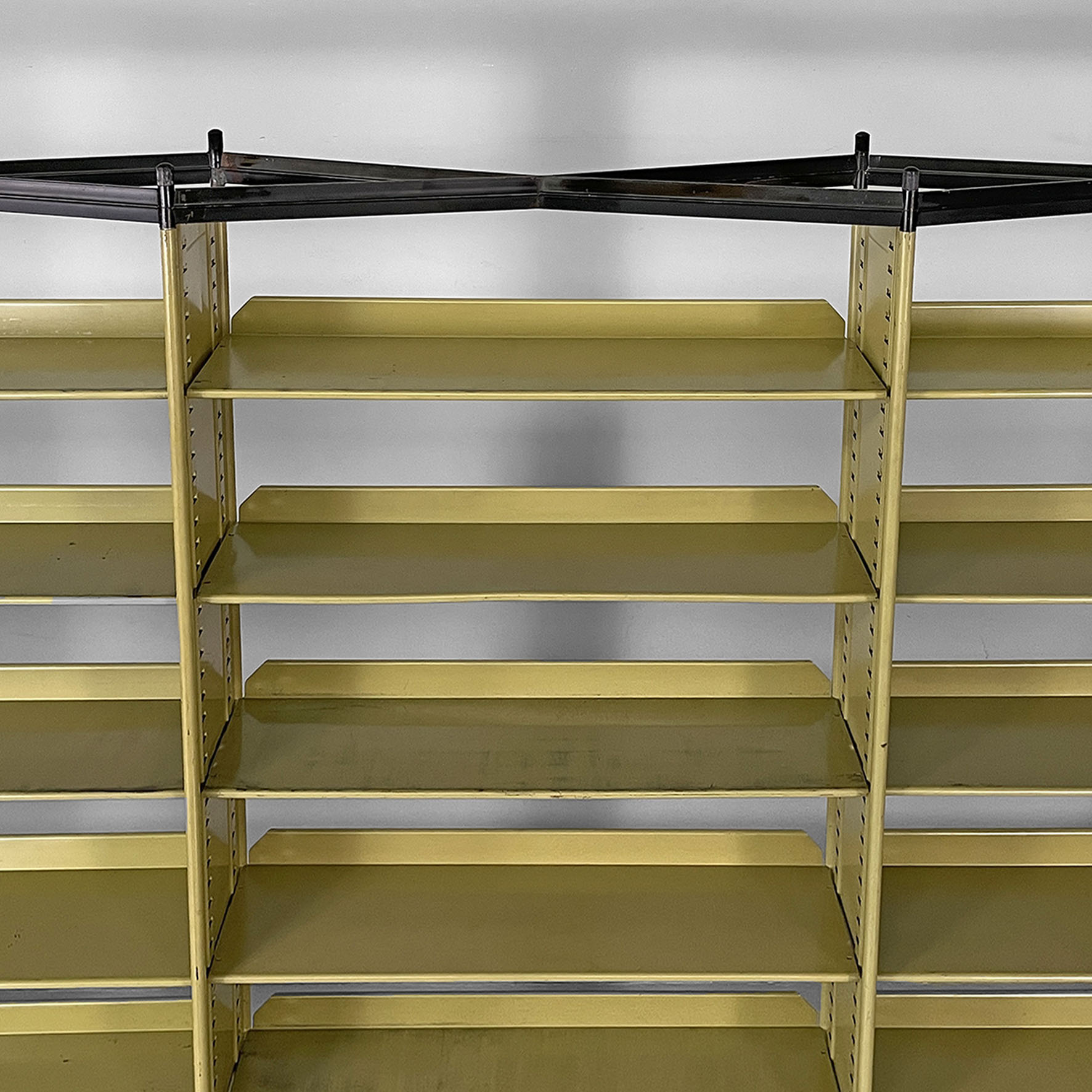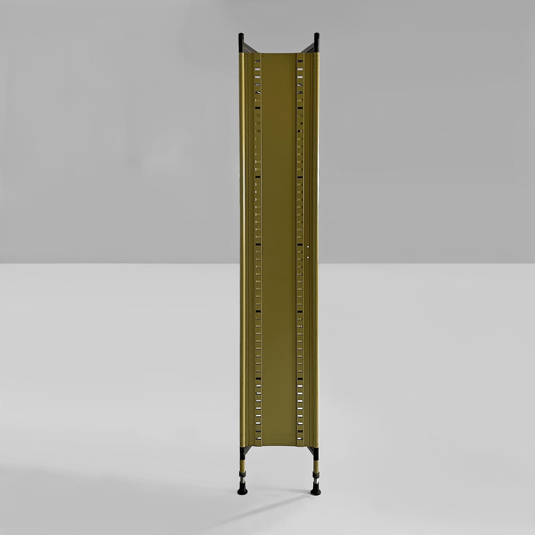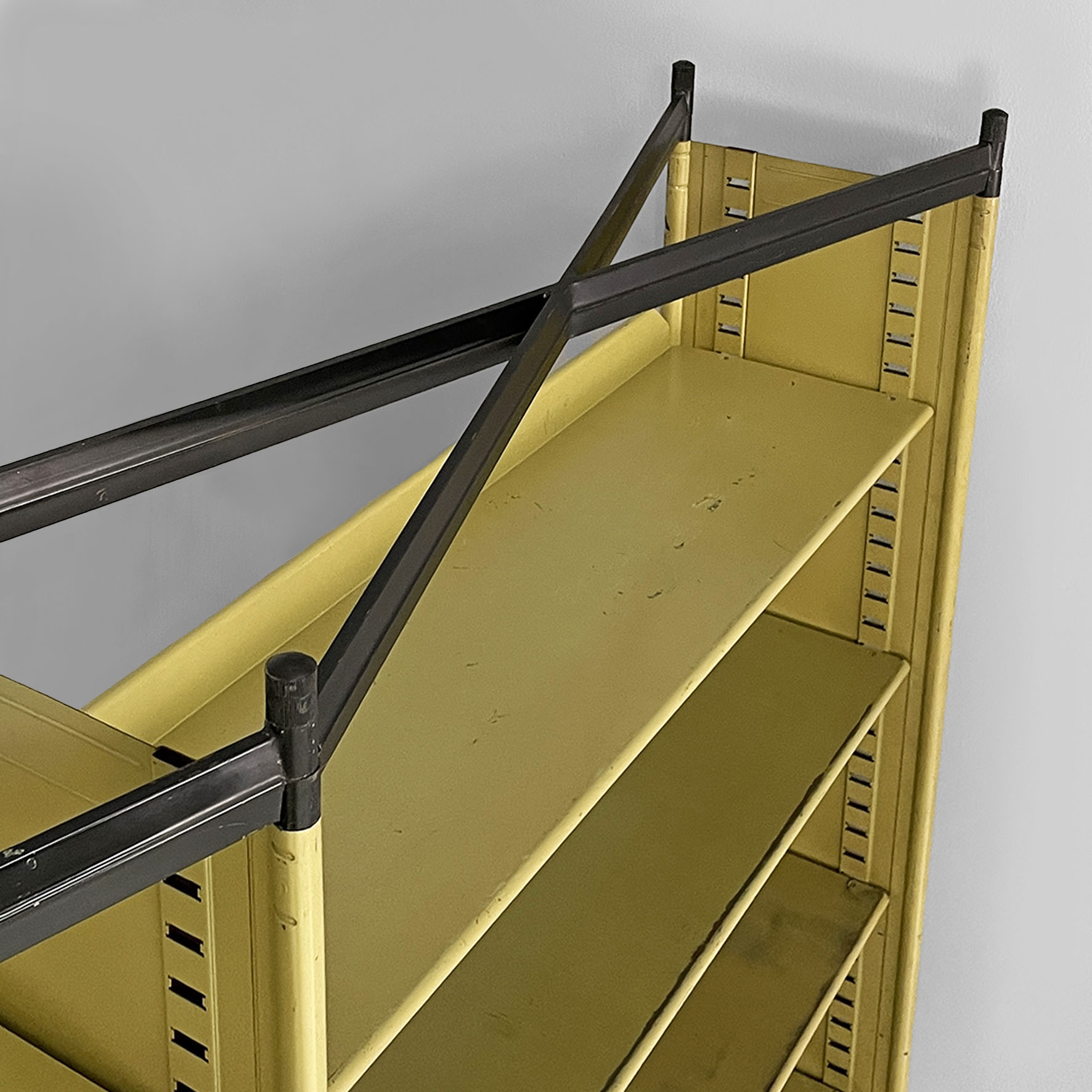 Libreria o scaffale modulare interamente in metallo colore verde pistacchio a sei campate. Presenta ripiani rettangolari che si agganciano ai montanti verticali e possono essere posizionati a piacere. I piedini sono regolabili. Può essere usato anche come espositore.