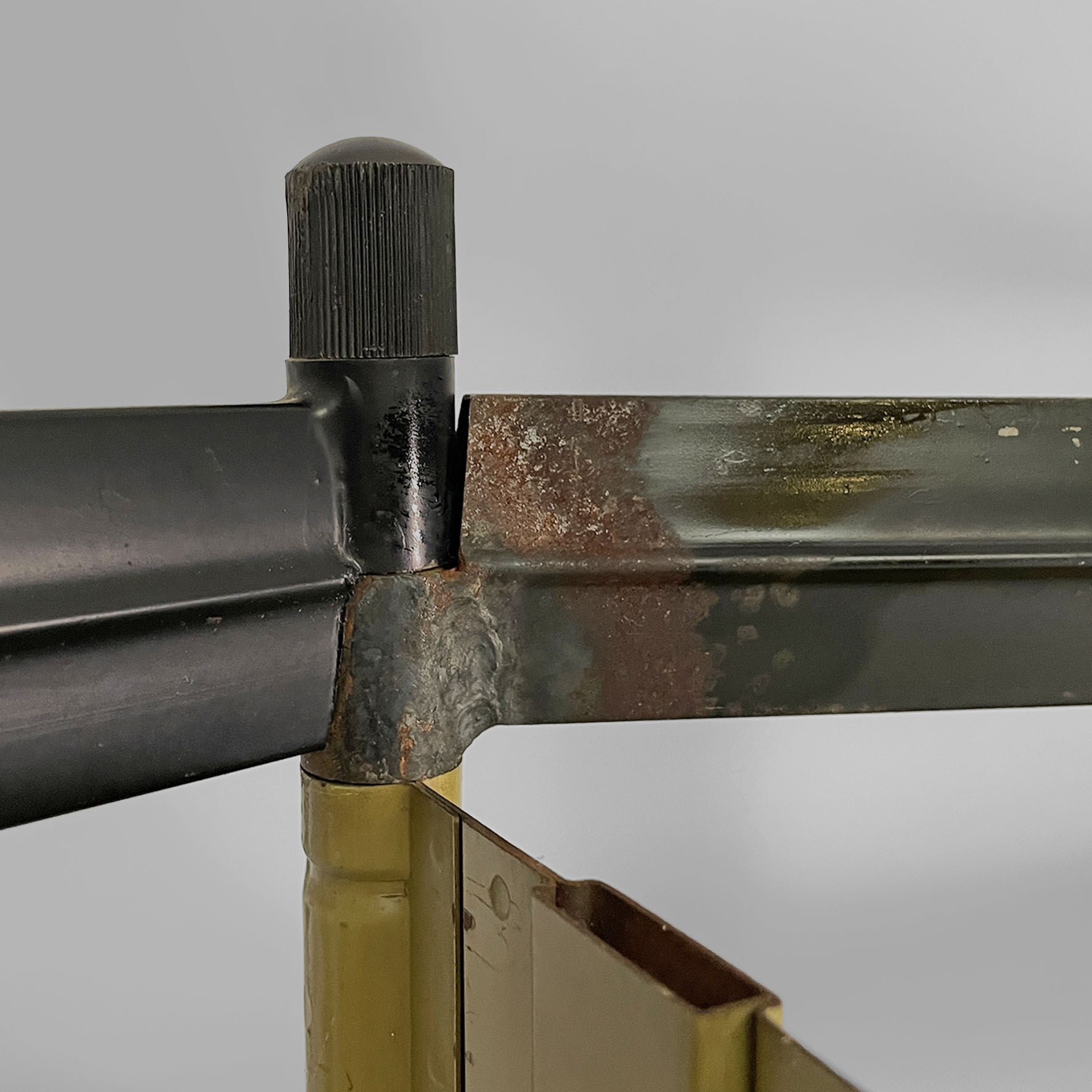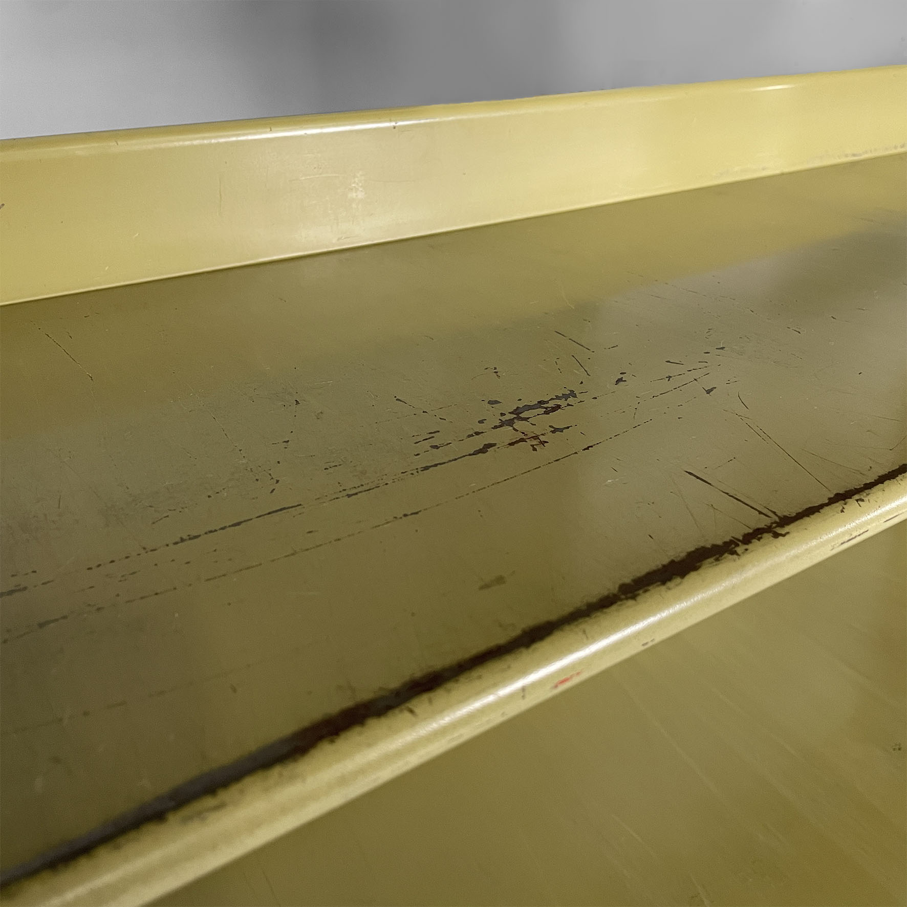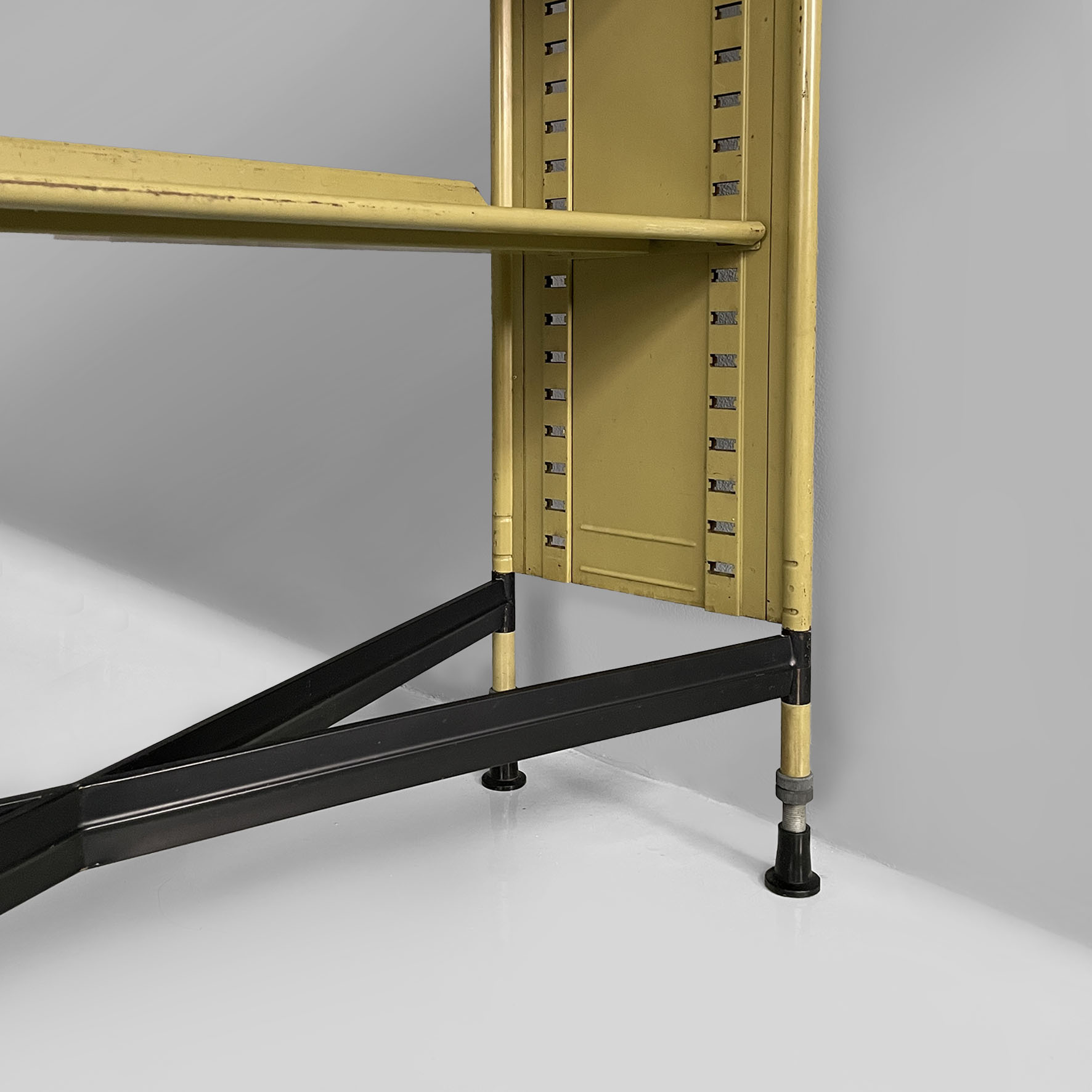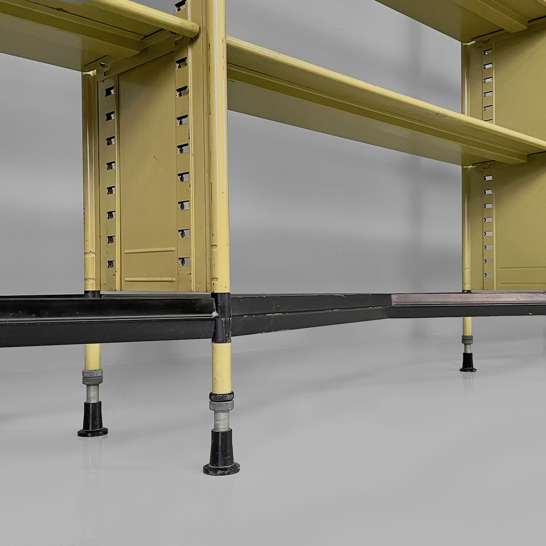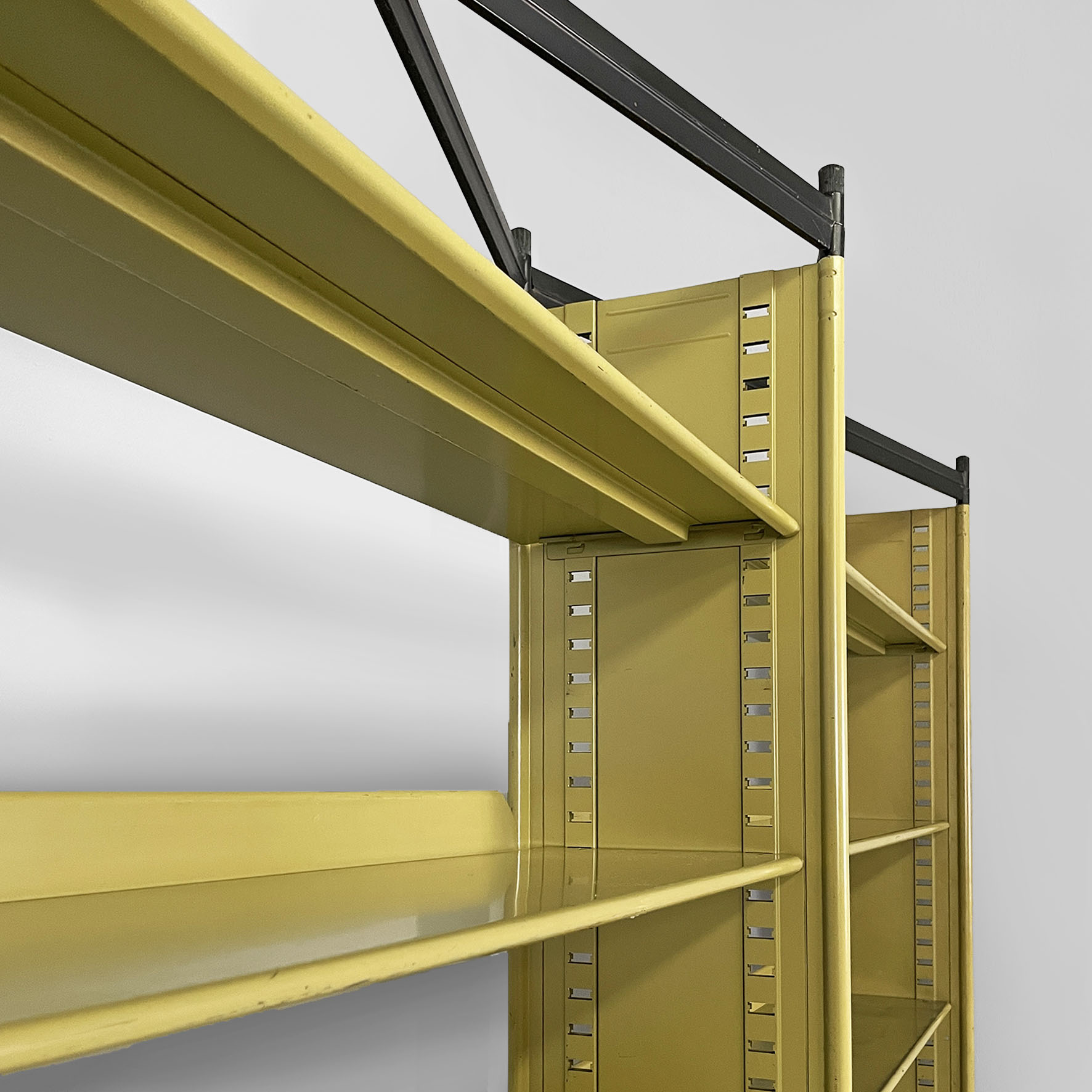 Libreria o scaffale modulare interamente in metallo colore verde pistacchio a sei campate. Presenta ripiani rettangolari che si agganciano ai montanti verticali e possono essere posizionati a piacere. I piedini sono regolabili. Può essere usato anche come espositore.