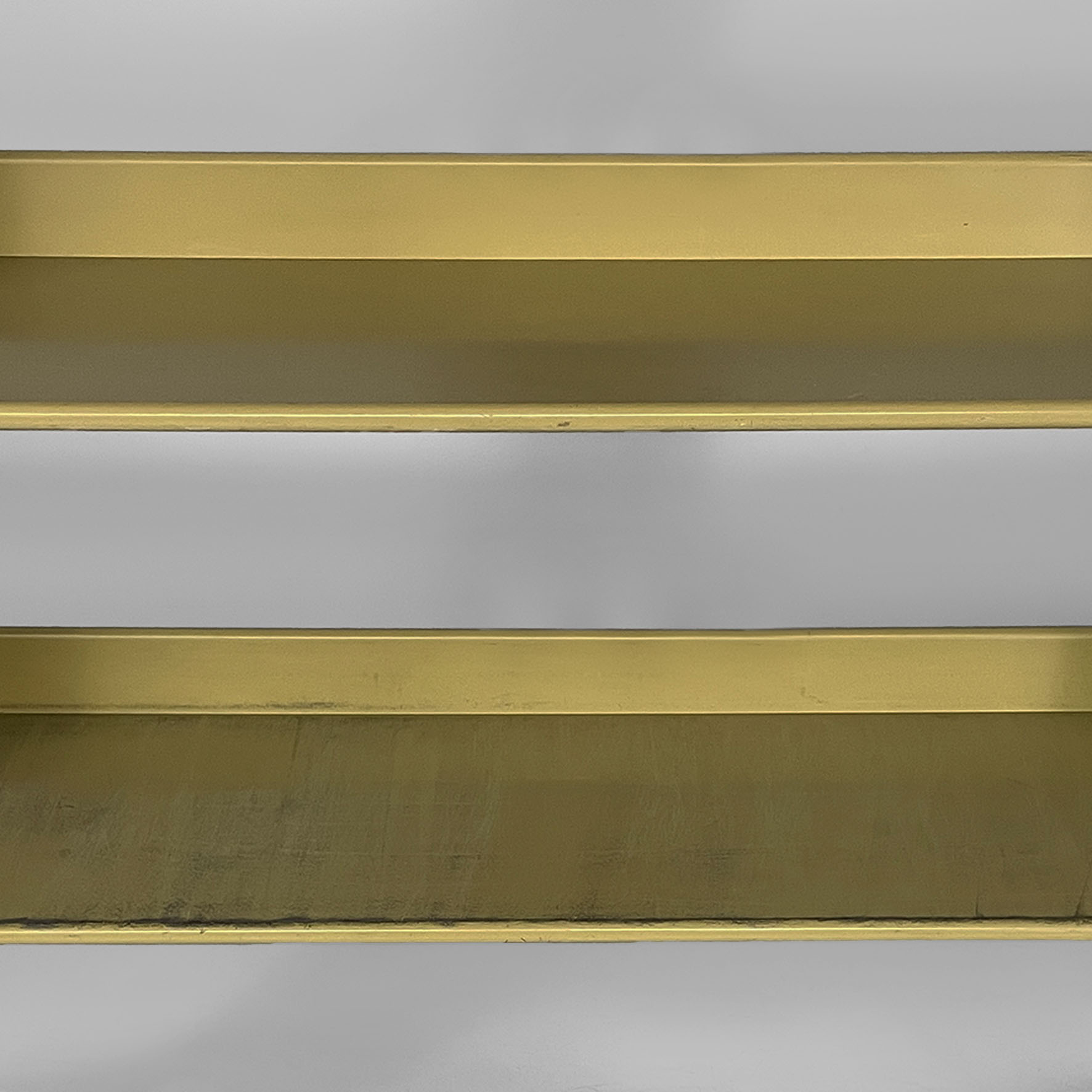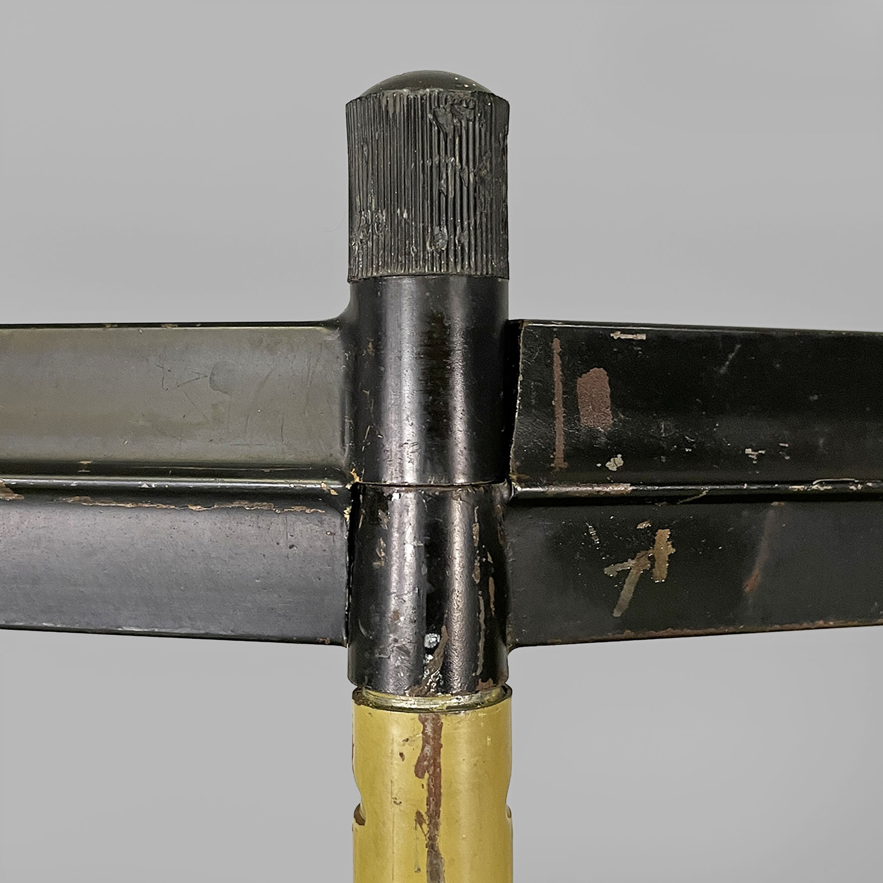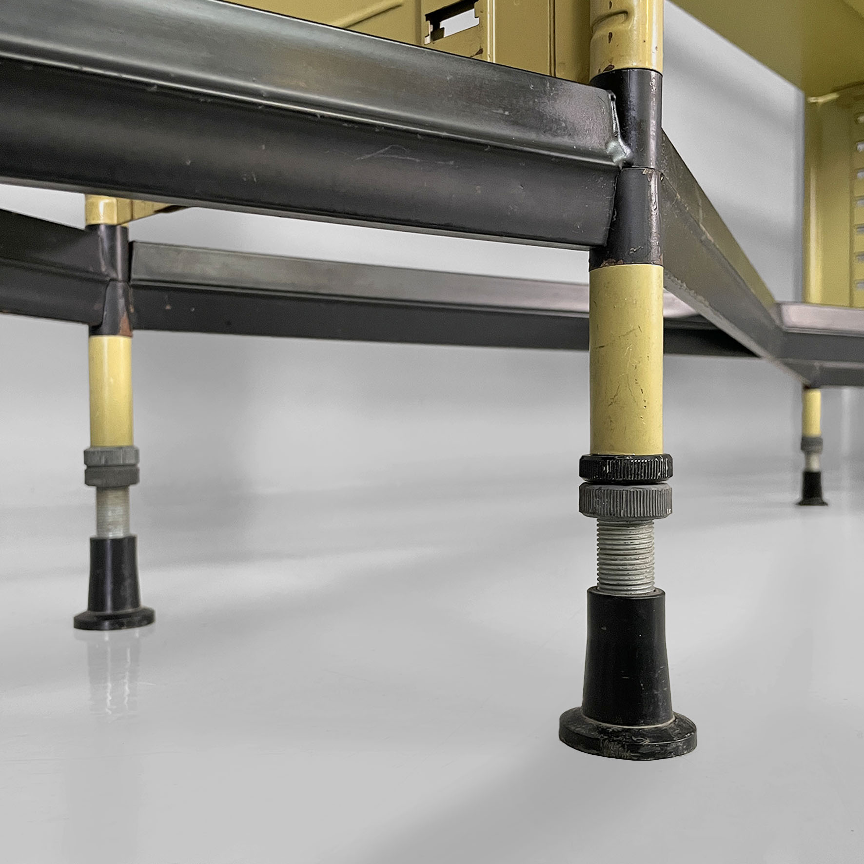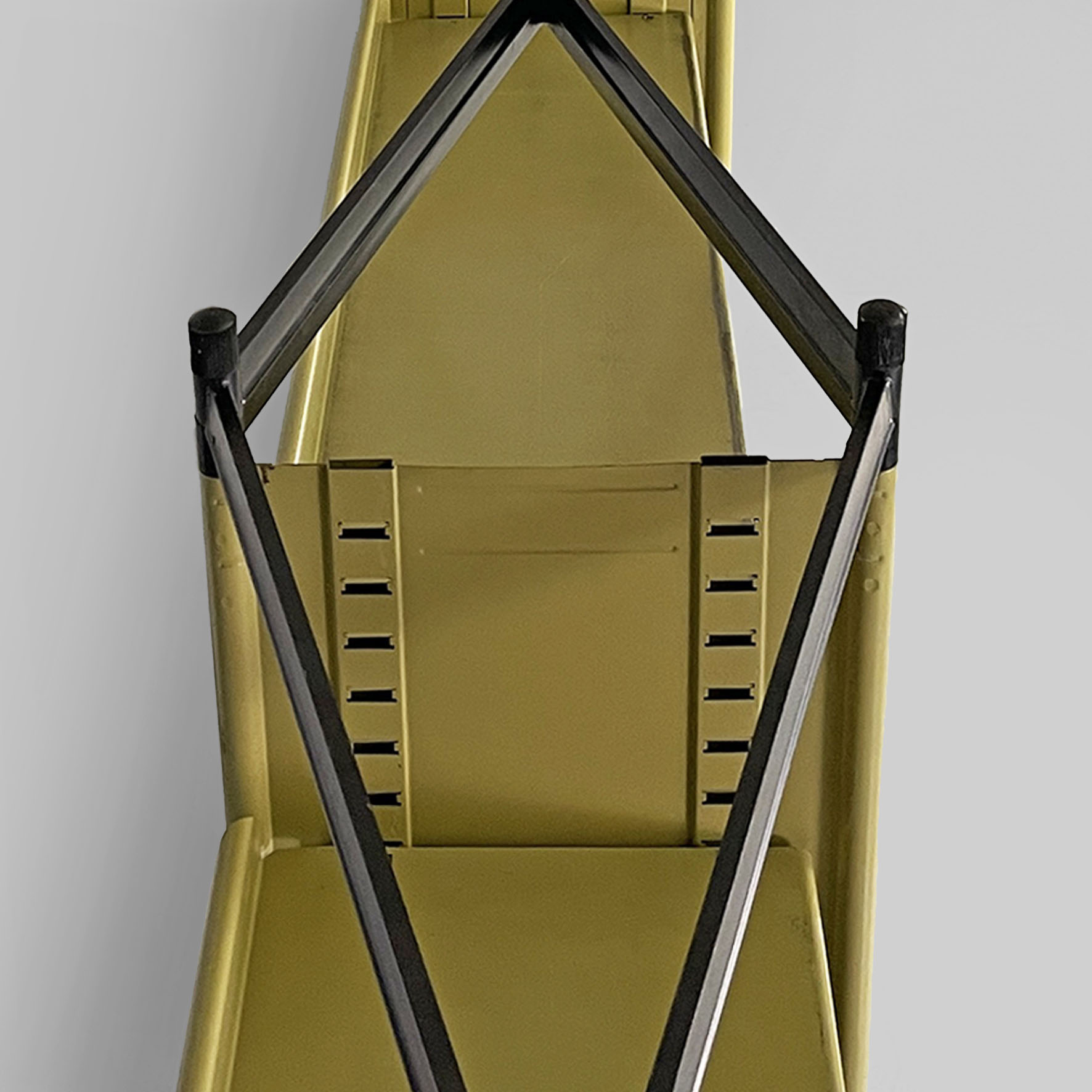 Libreria o scaffale modulare interamente in metallo colore verde pistacchio a sei campate. Presenta ripiani rettangolari che si agganciano ai montanti verticali e possono essere posizionati a piacere. I piedini sono regolabili. Può essere usato anche come espositore.