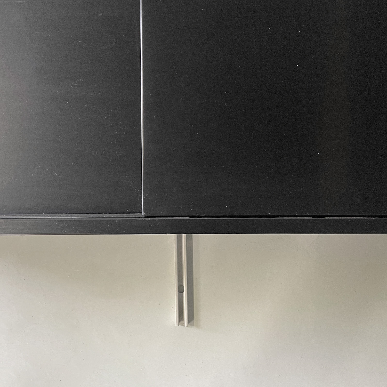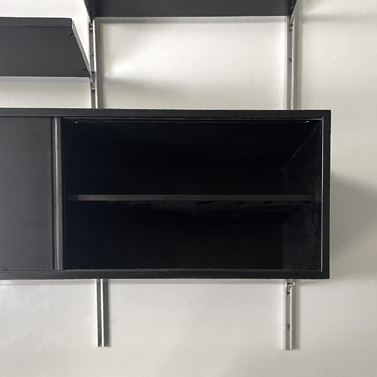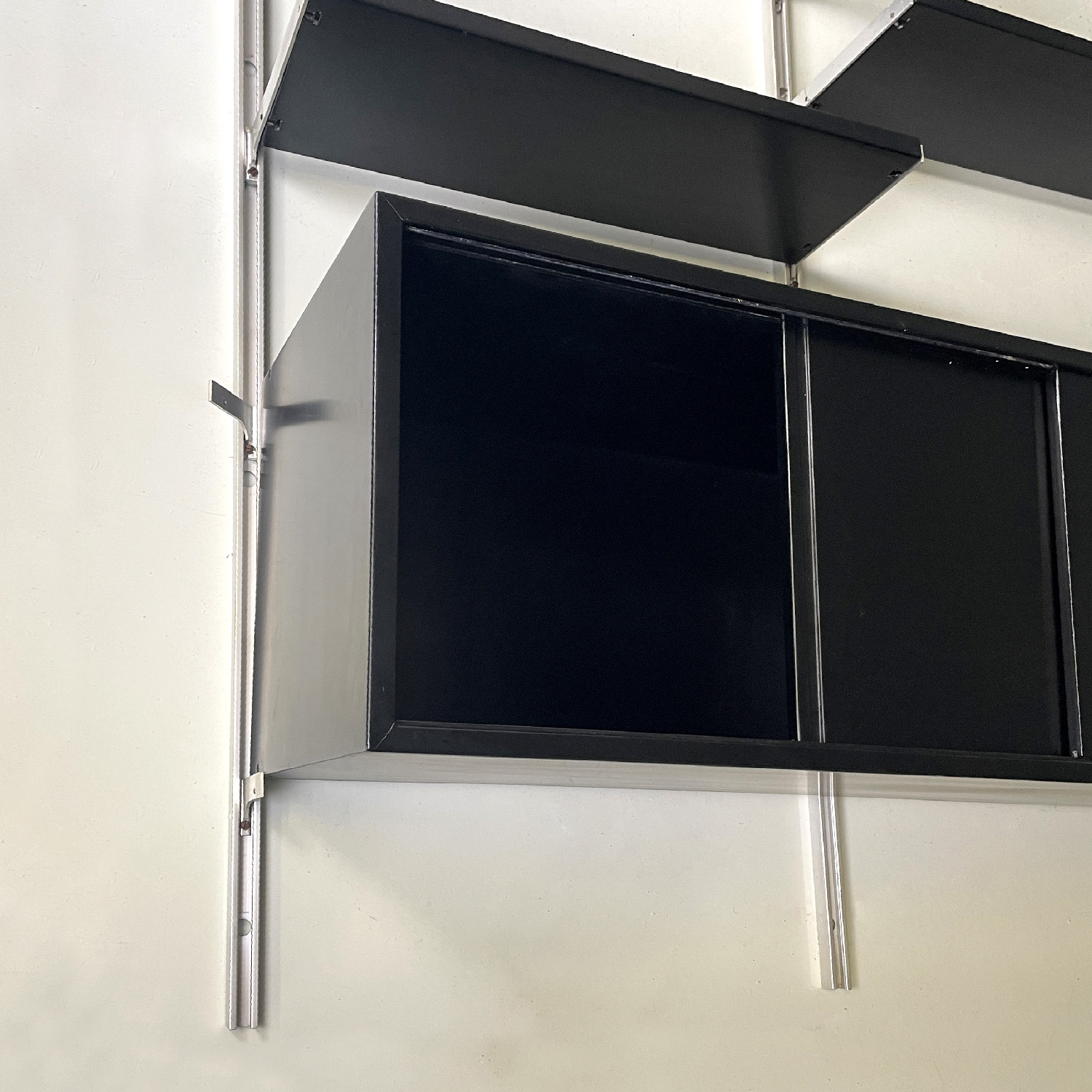 Libreria da parete modello E22 in legno e metallo. Presenta tre montanti in metallo, sette mensole in legno laccato nero e un sideboard con ante scorrevoli con ripiano interno.