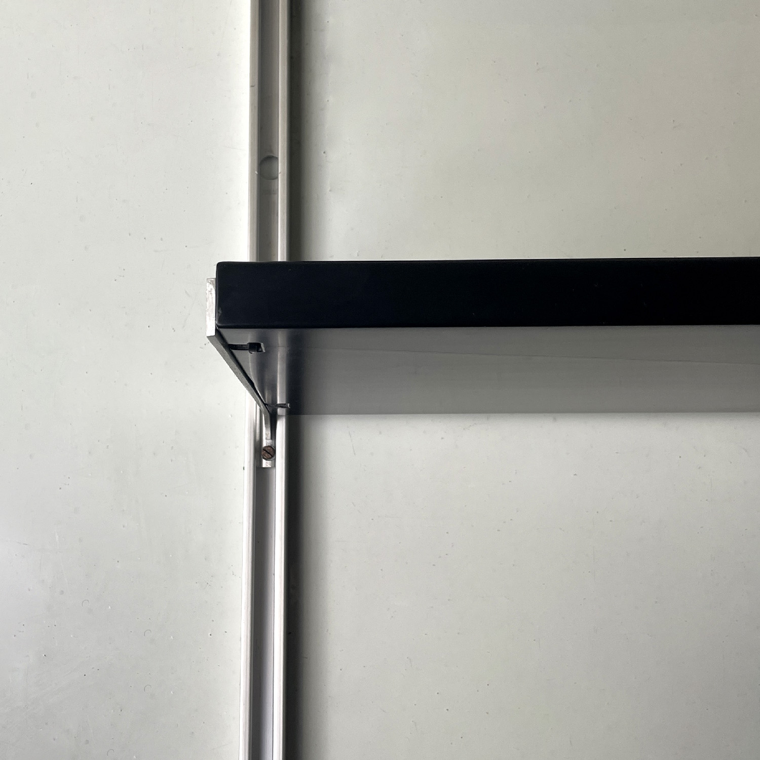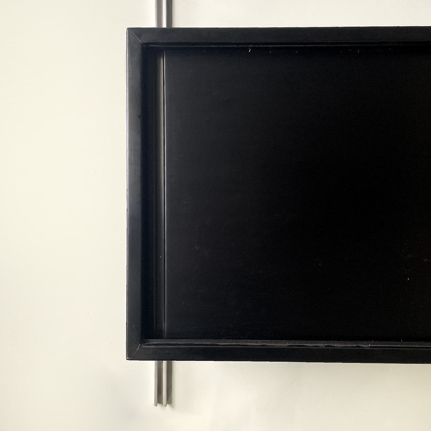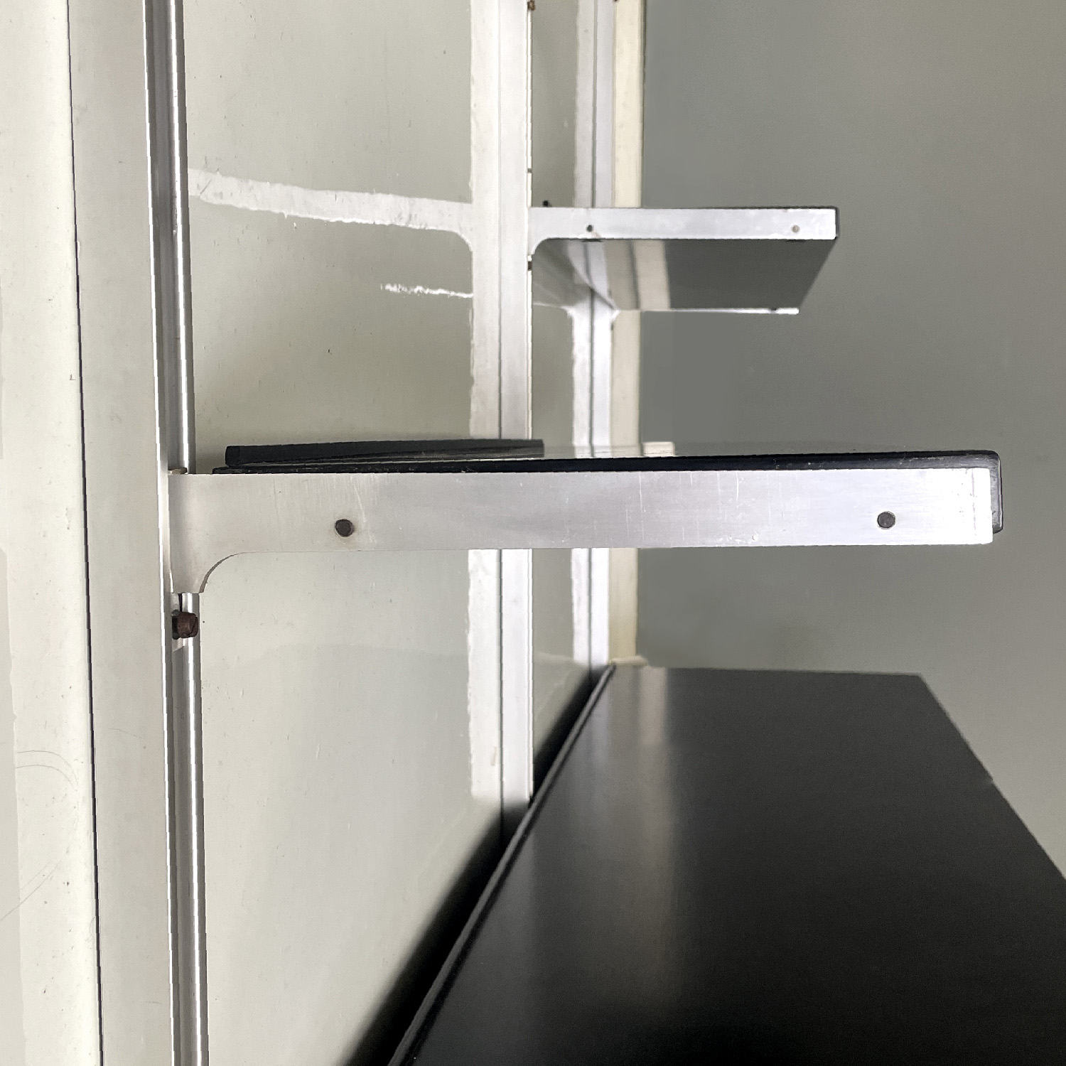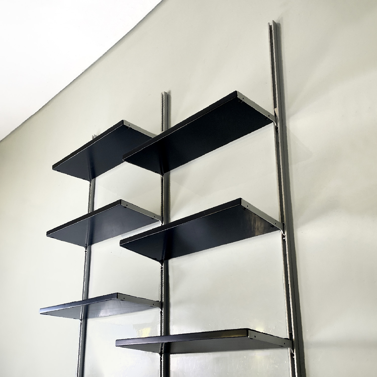 Libreria da parete modello E22 in legno e metallo. Presenta tre montanti in metallo, sette mensole in legno laccato nero e un sideboard con ante scorrevoli con ripiano interno.