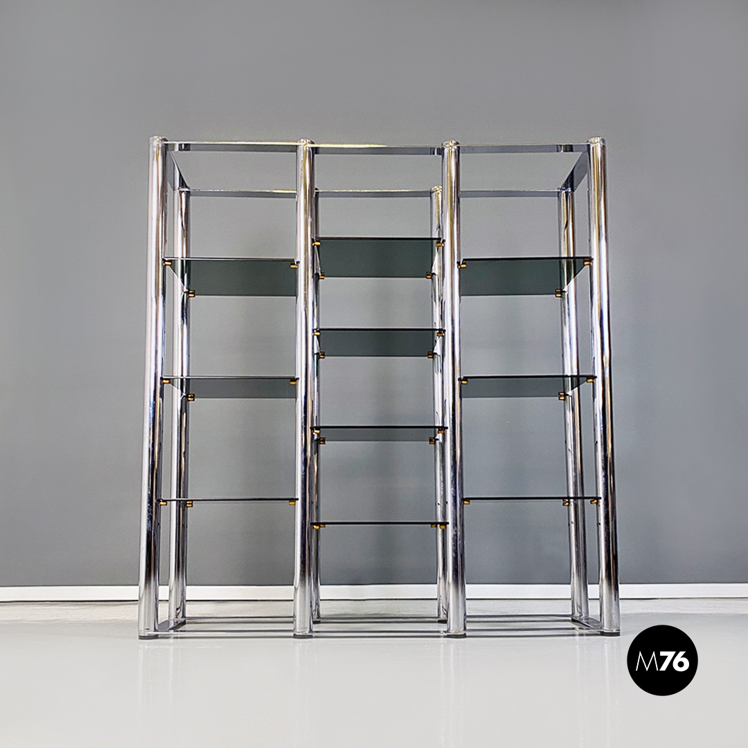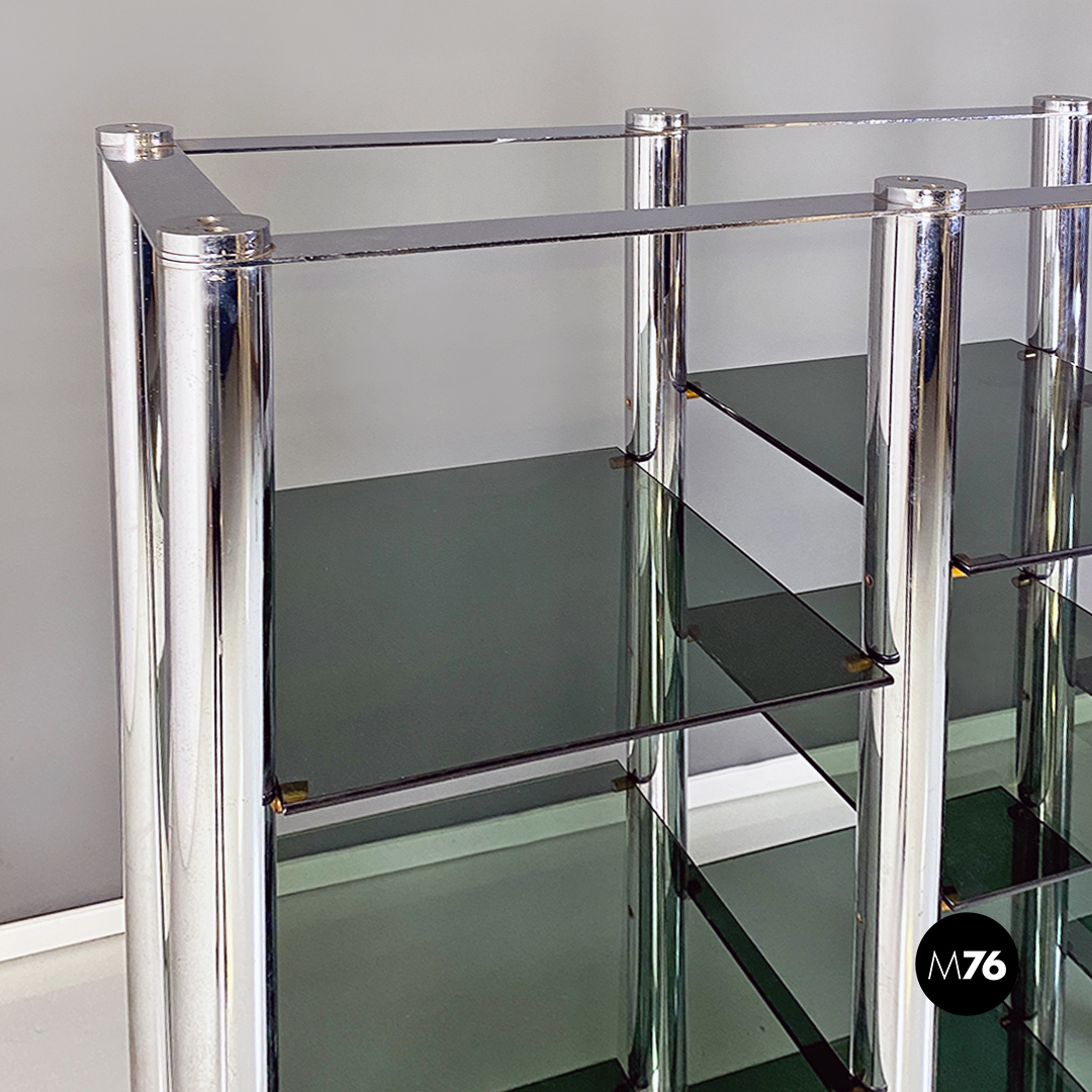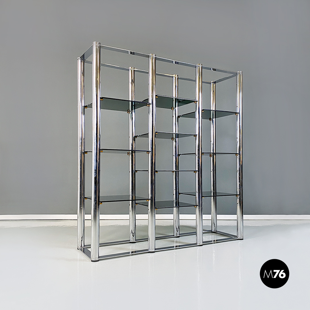 Libreria autoportante con struttura interamente in acciaio cromato, con dieci ripiani in vetro fumè regolabili in altezza ed intercambiabili.