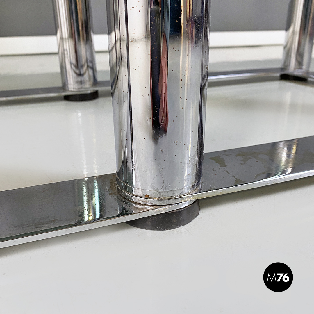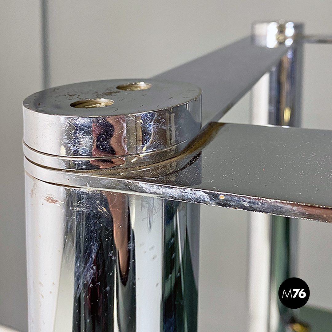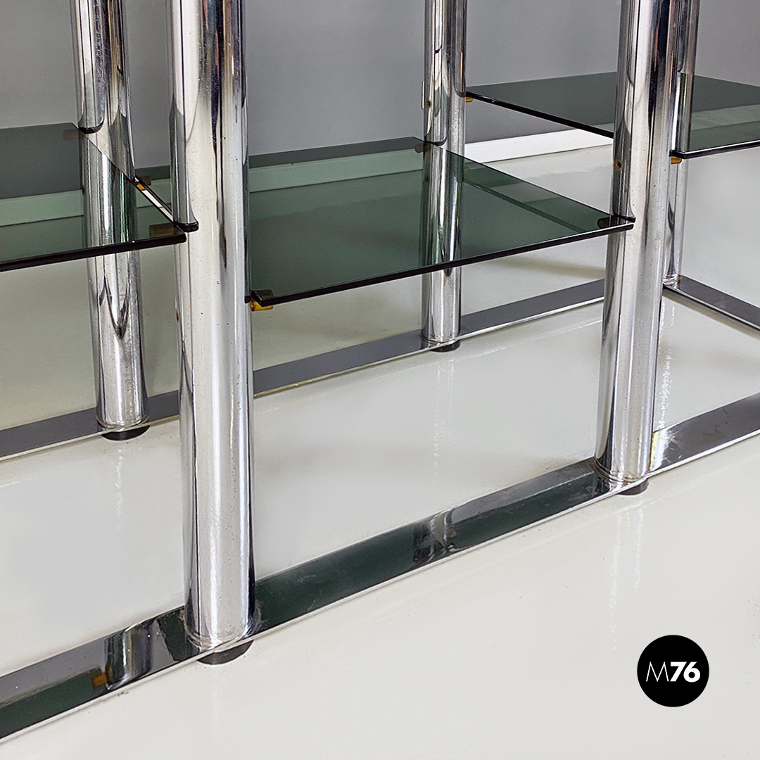 Libreria autoportante con struttura interamente in acciaio cromato, con dieci ripiani in vetro fumè regolabili in altezza ed intercambiabili.