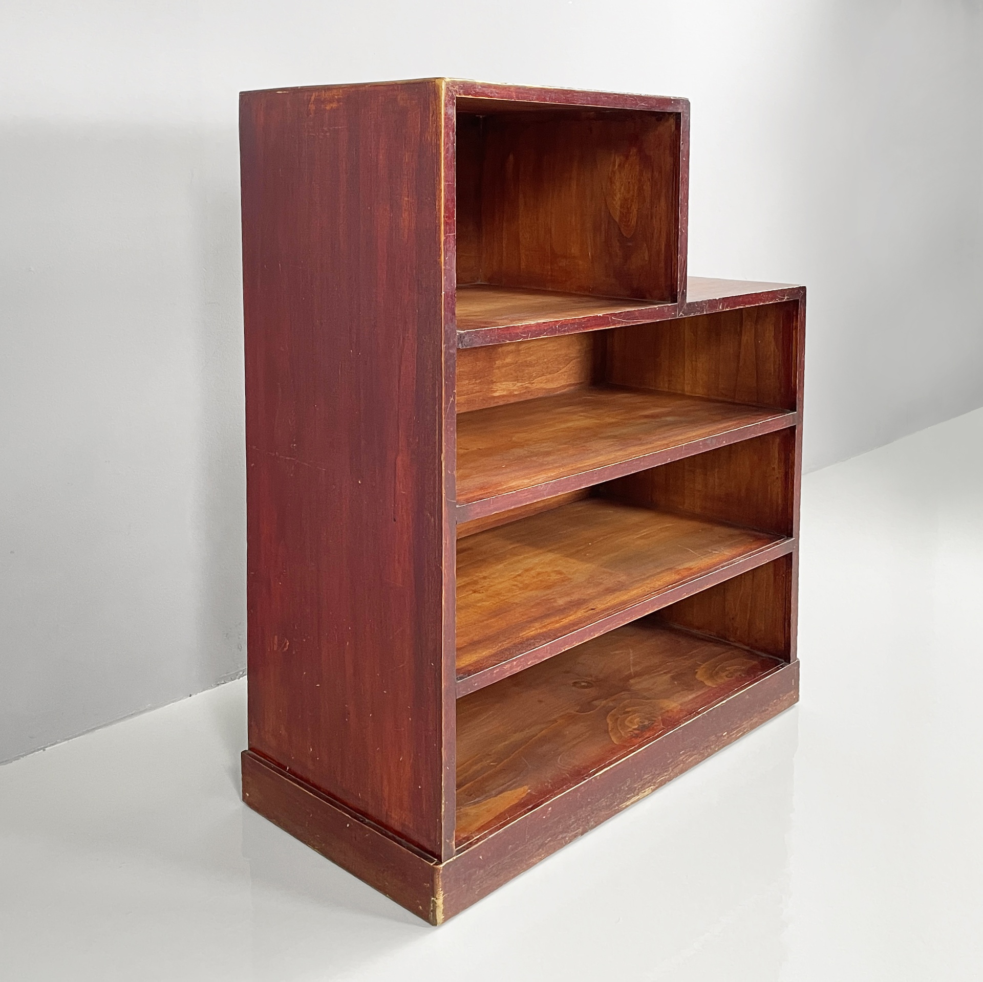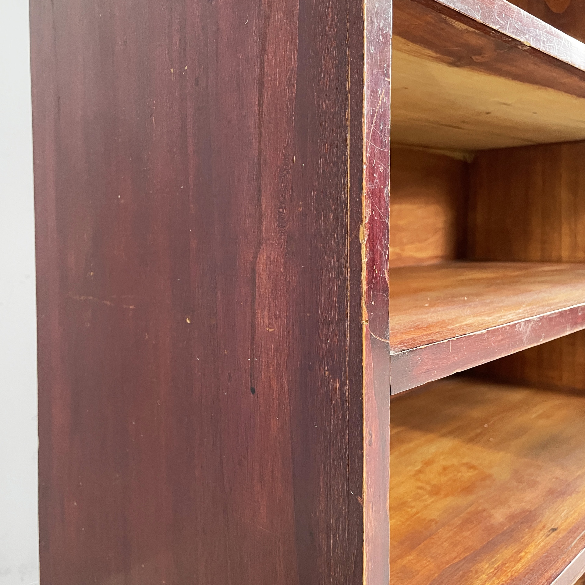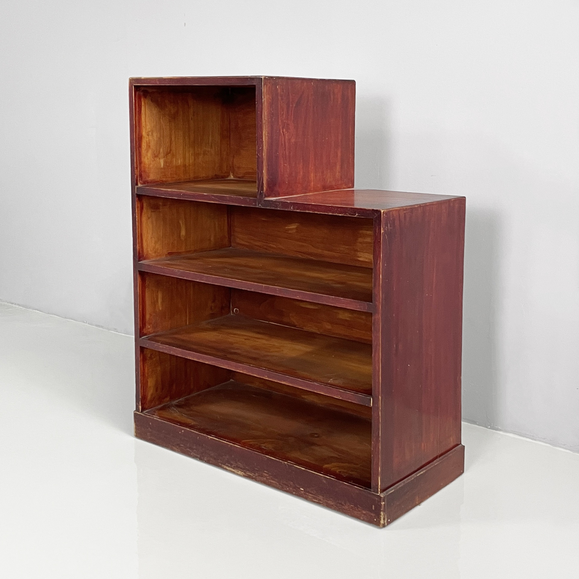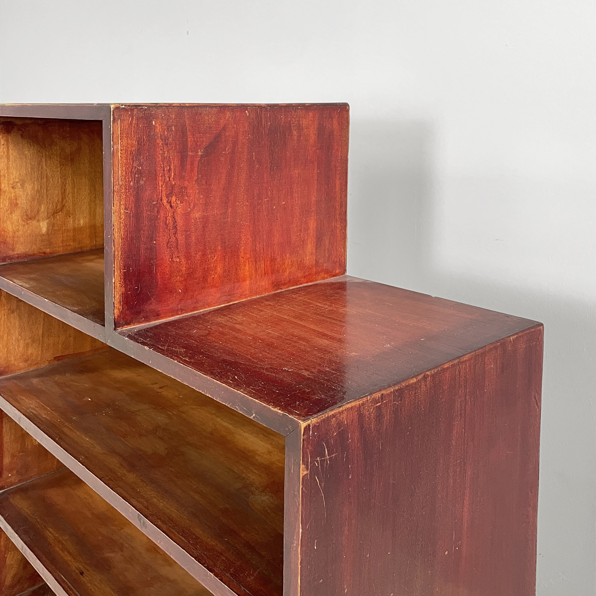 Libreria a base rettangolare interamente in legno rosso. Presenta quattro scaffali rettangolari, di cui uno più piccolo rispetto agli altri. Appartenente al periodo Art Deco.