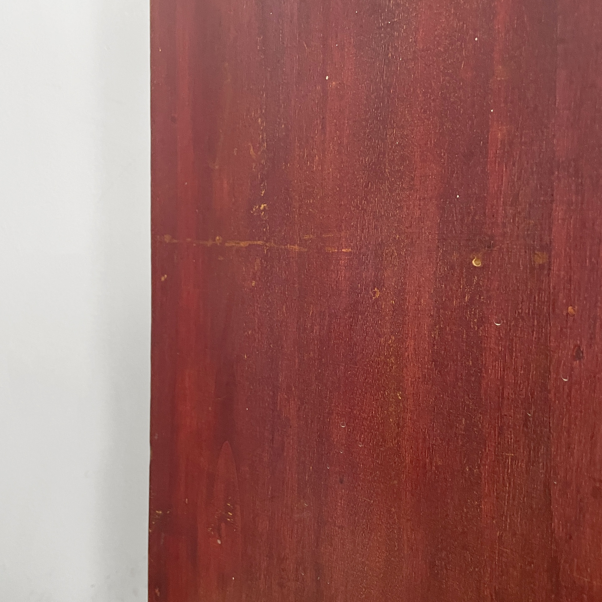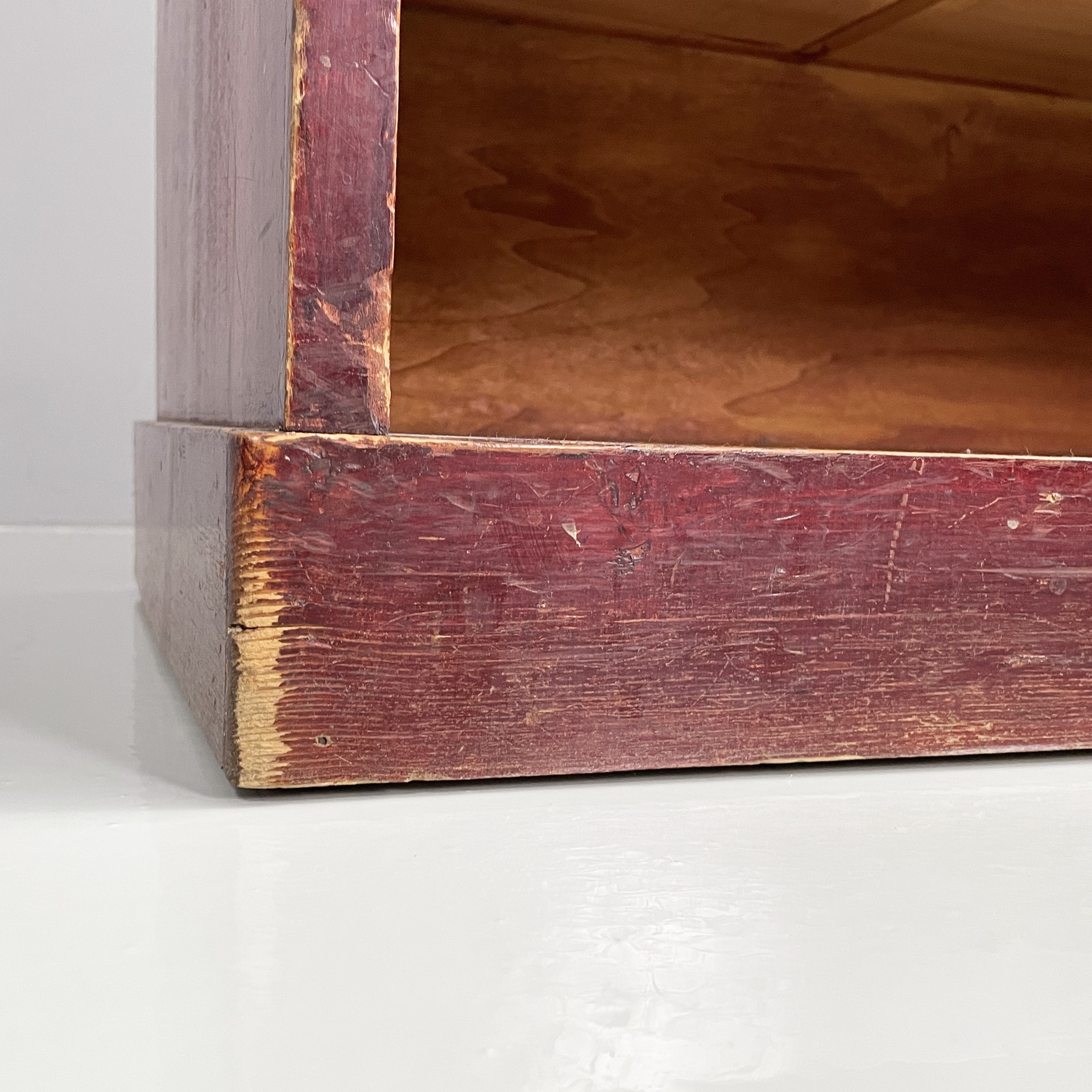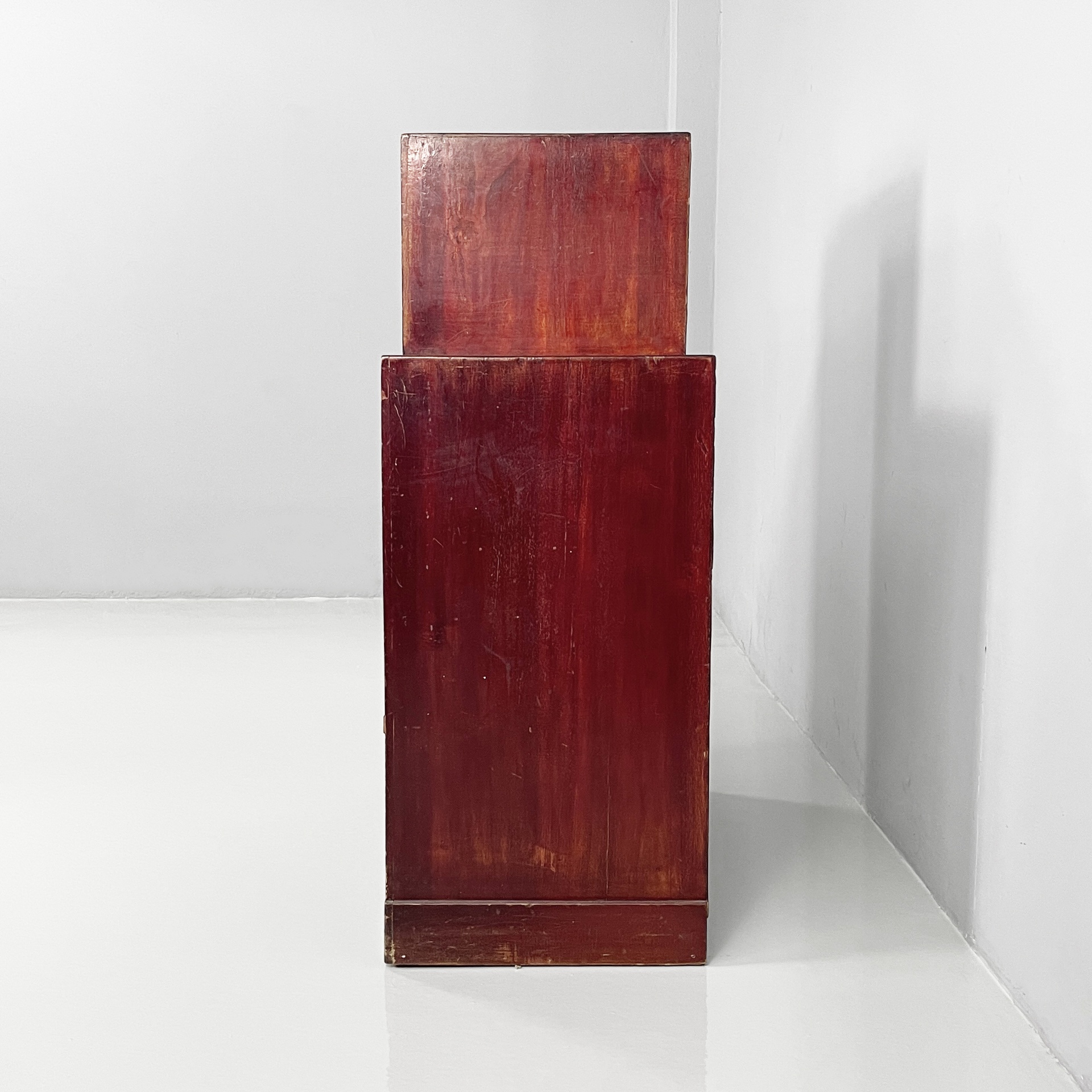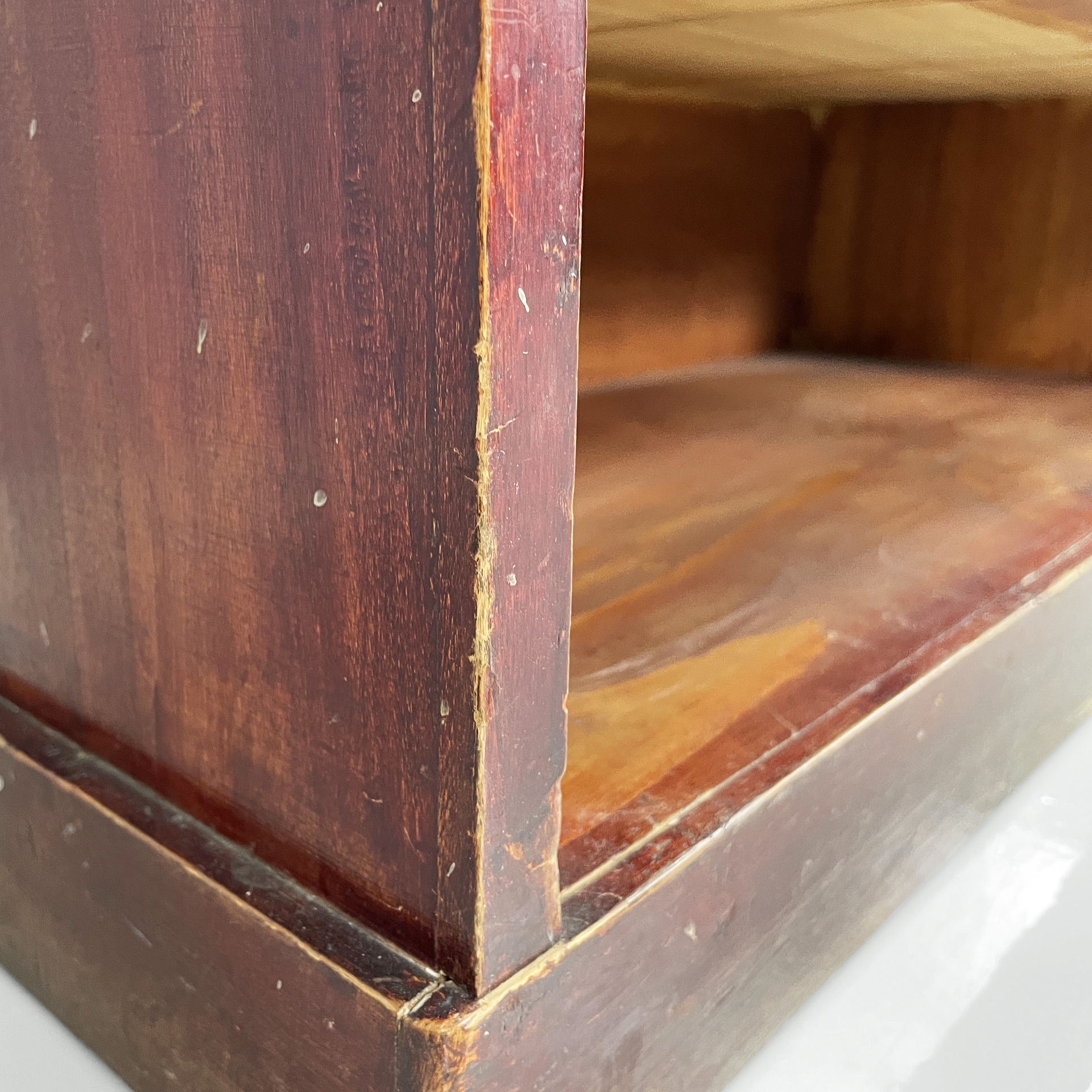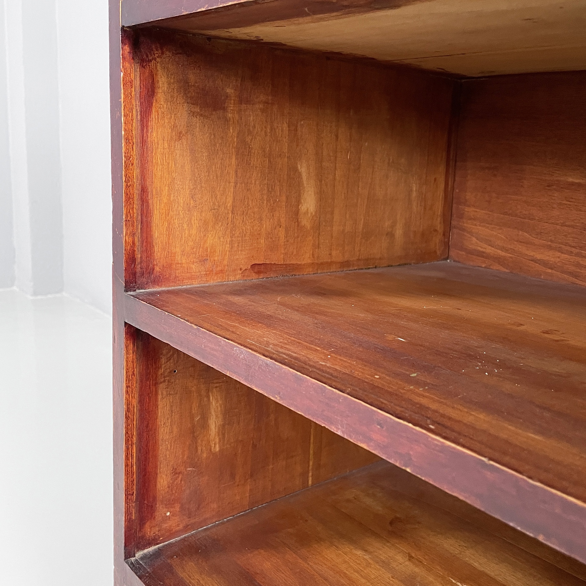 Libreria a base rettangolare interamente in legno rosso. Presenta quattro scaffali rettangolari, di cui uno più piccolo rispetto agli altri. Appartenente al periodo Art Deco.