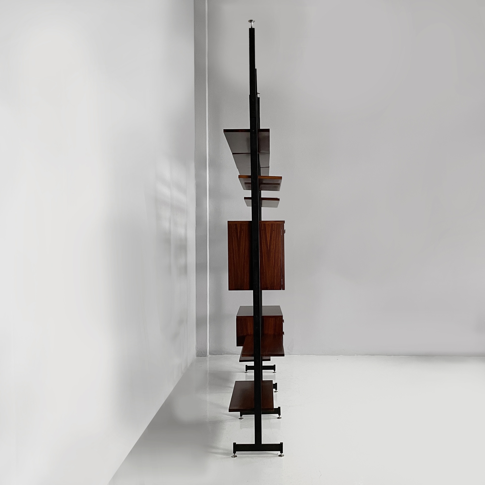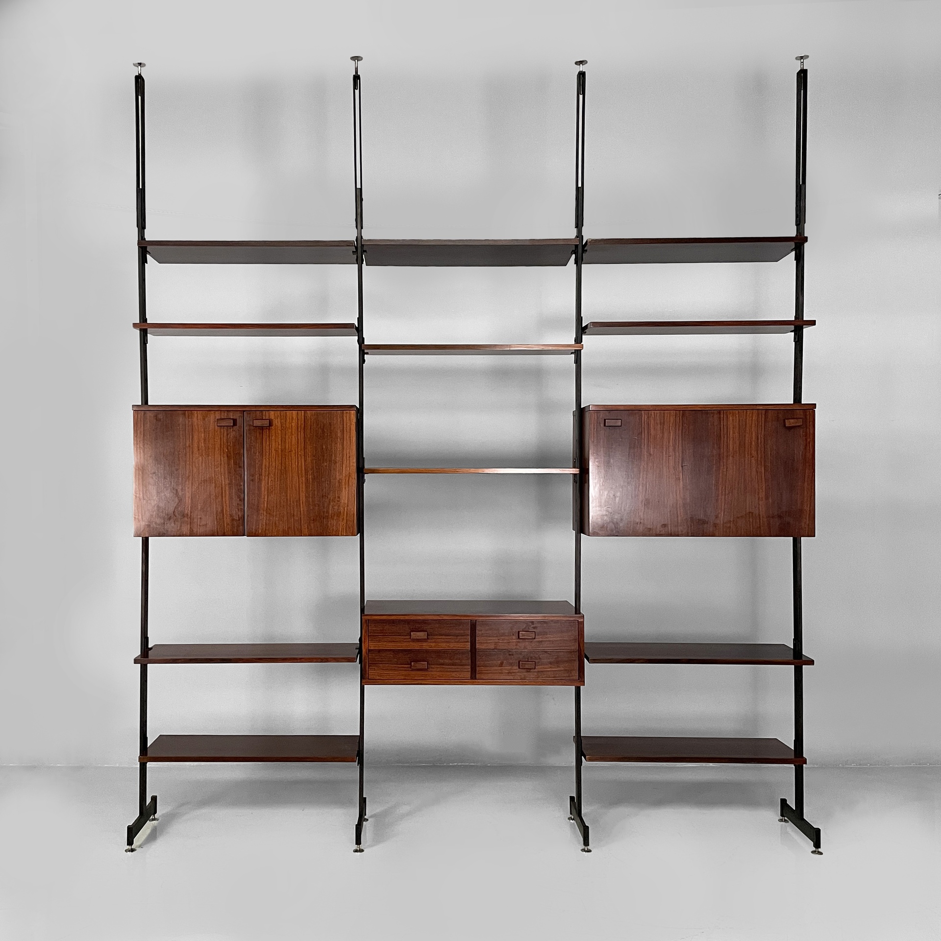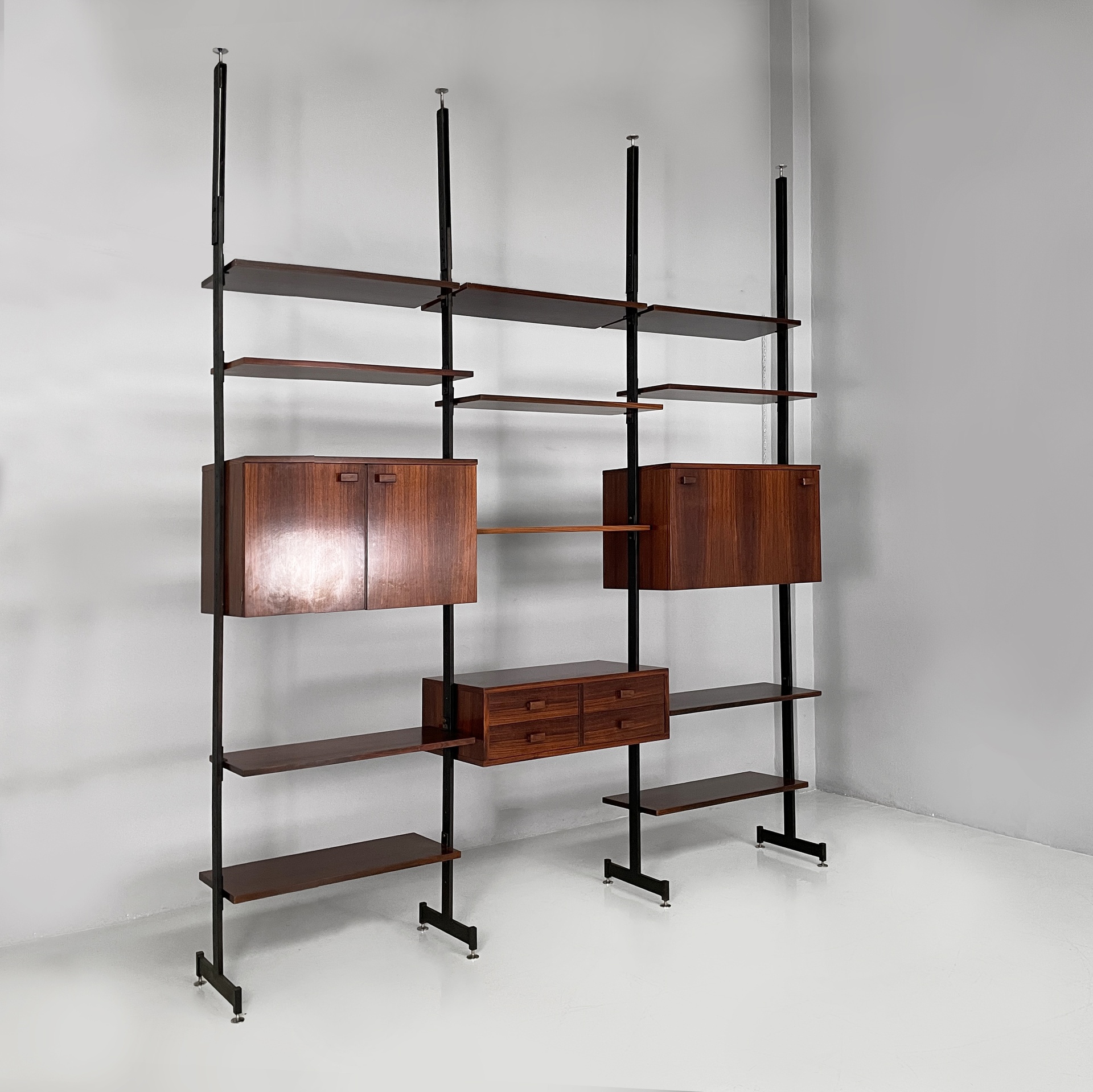 Libreria modulare cielo terra in legno. Sono presenti undici mensole rettangolari, una cassettiera con quattro cassetti, un vano con doppia anta a battente e un vano bar con anta a ribalta e mensola interna. Maniglie squadrate in legno. La struttura è composta da quattro montanti in metallo verniciato nero con piedini tondi in metallo. I moduli possono essere posizionati a piacere.