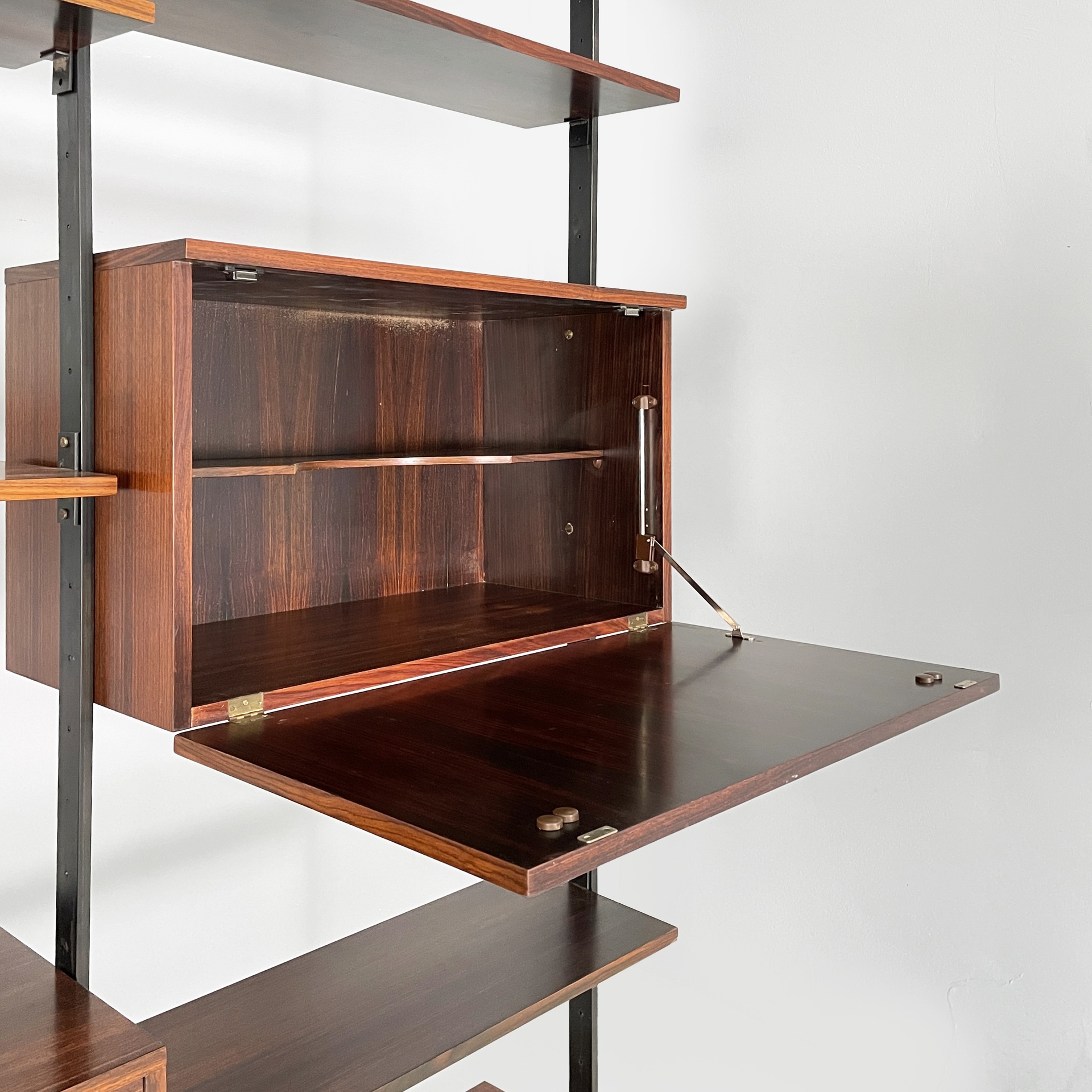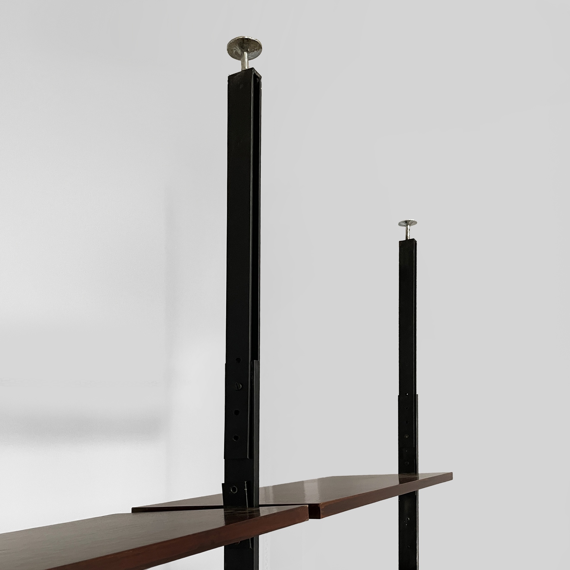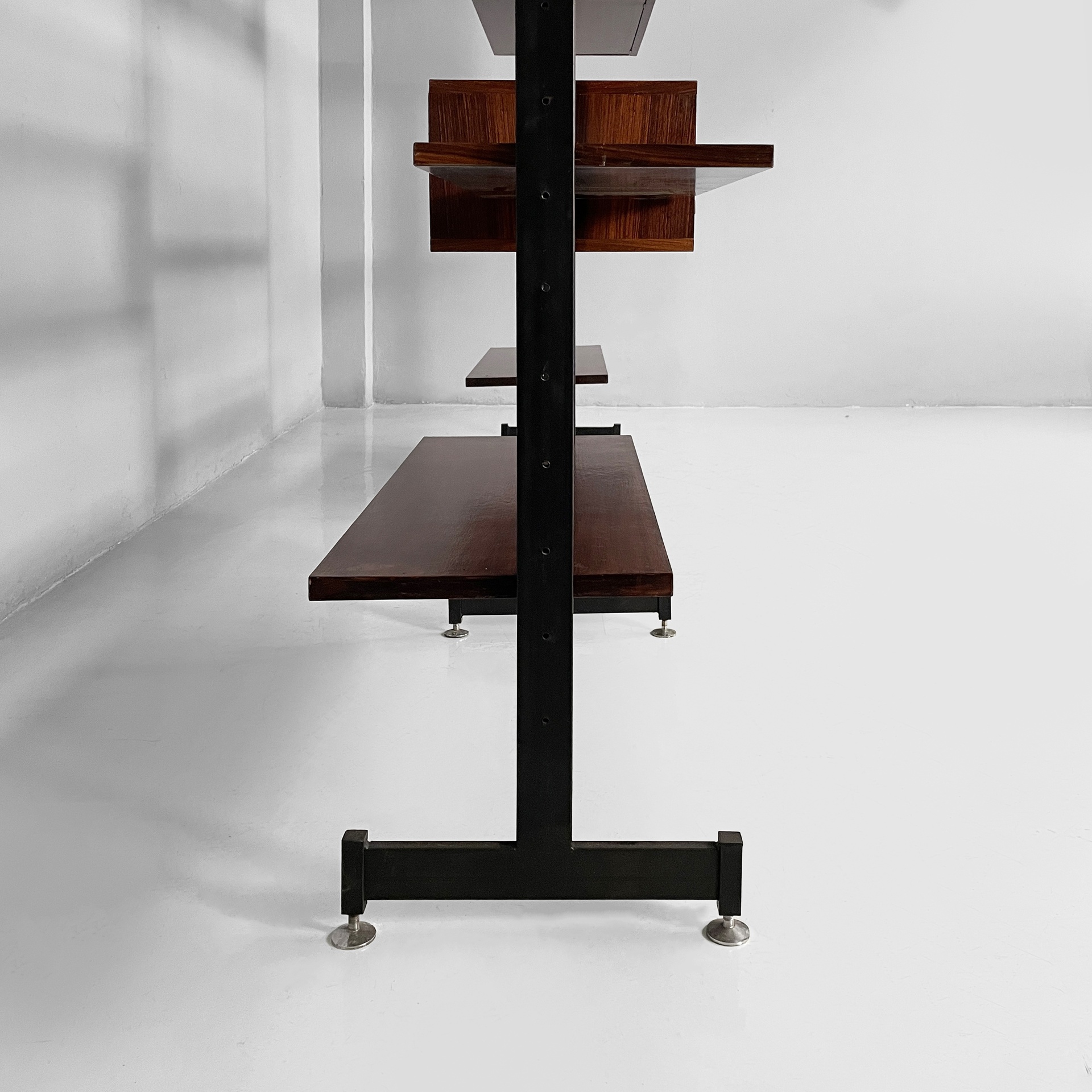 Libreria modulare cielo terra in legno. Sono presenti undici mensole rettangolari, una cassettiera con quattro cassetti, un vano con doppia anta a battente e un vano bar con anta a ribalta e mensola interna. Maniglie squadrate in legno. La struttura è composta da quattro montanti in metallo verniciato nero con piedini tondi in metallo. I moduli possono essere posizionati a piacere.