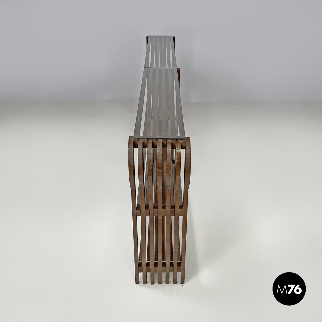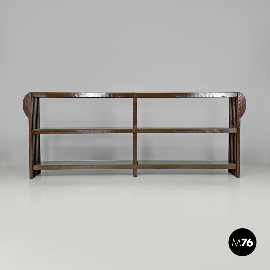 Libreria allungata con due campate. La struttura è composta da listelli in legno a sezione quadrata, ed è verniciata marrone con finitura lucida. La parte altra della struttura si allarga a formare un semicerchio decorativo. Sulla parte superiore, nelle due mensole centrali e nella parte inferiore si trovano delle lastre di vetro trasparente.