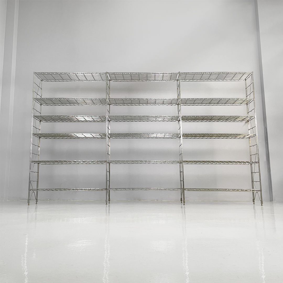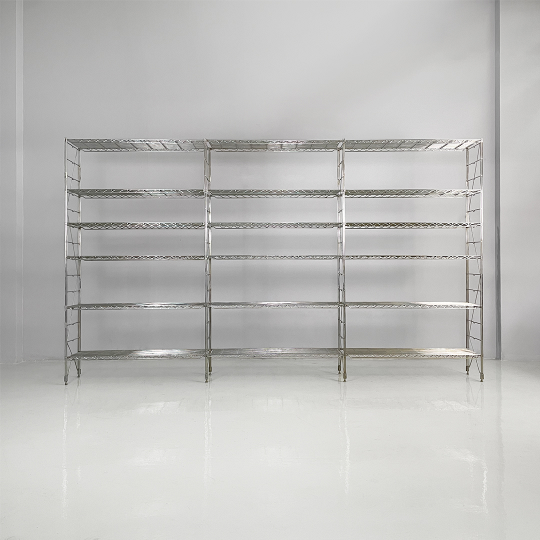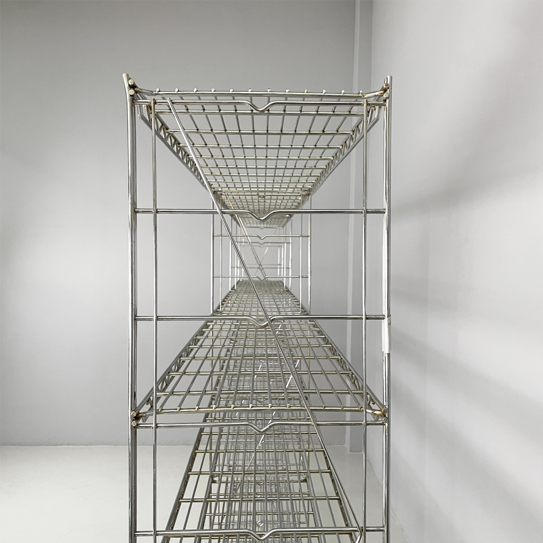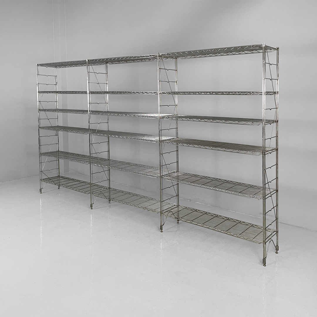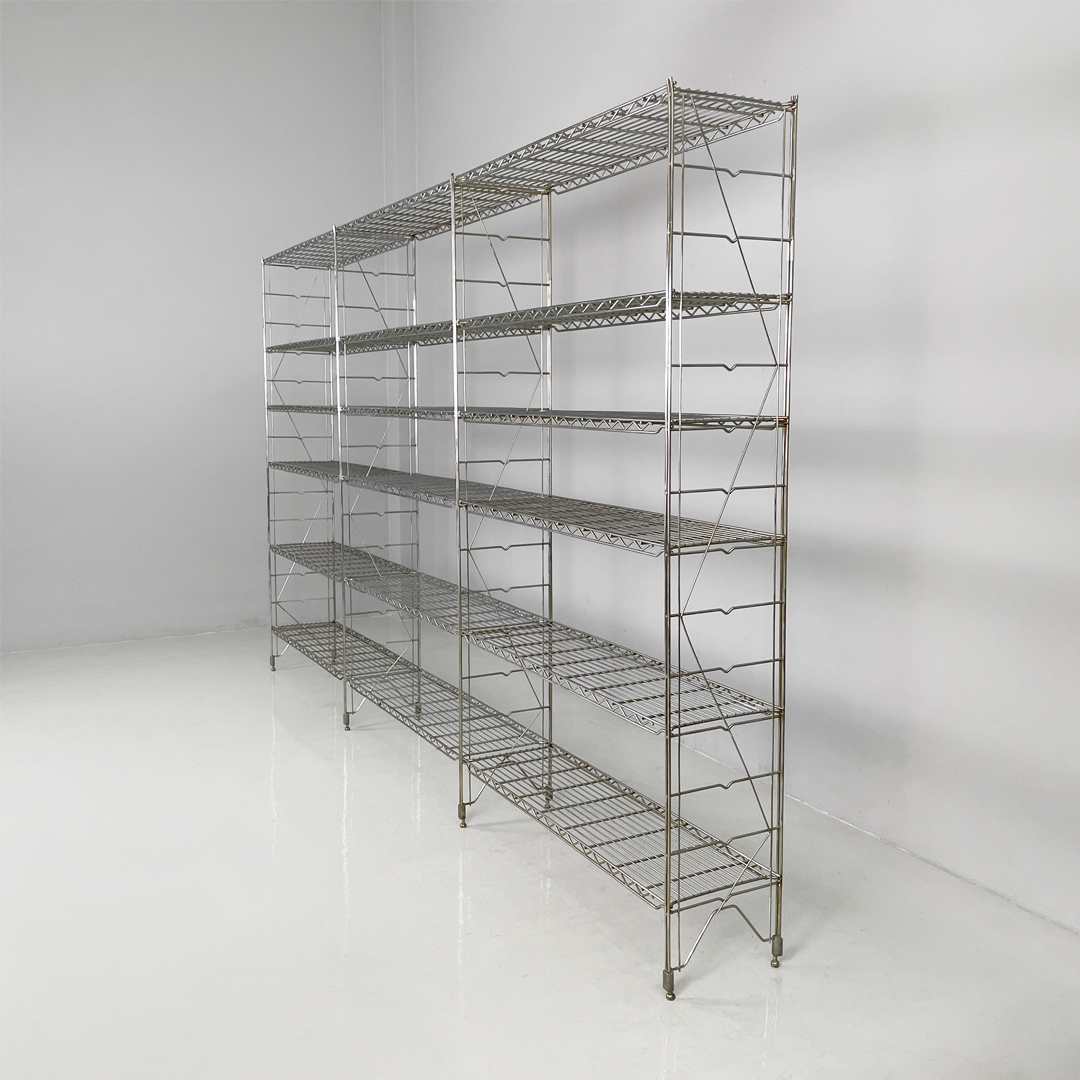 Libreria o scaffale interamente in metallo a tre campate. La struttura è composta da tondini di acciaio verticali, orizzontali e diagonali. Presenta ripiani rettangolari che si agganciano alla struttura e possono essere posizionati a piacere. I piedini sono regolabili. Può essere usato anche come espositore.