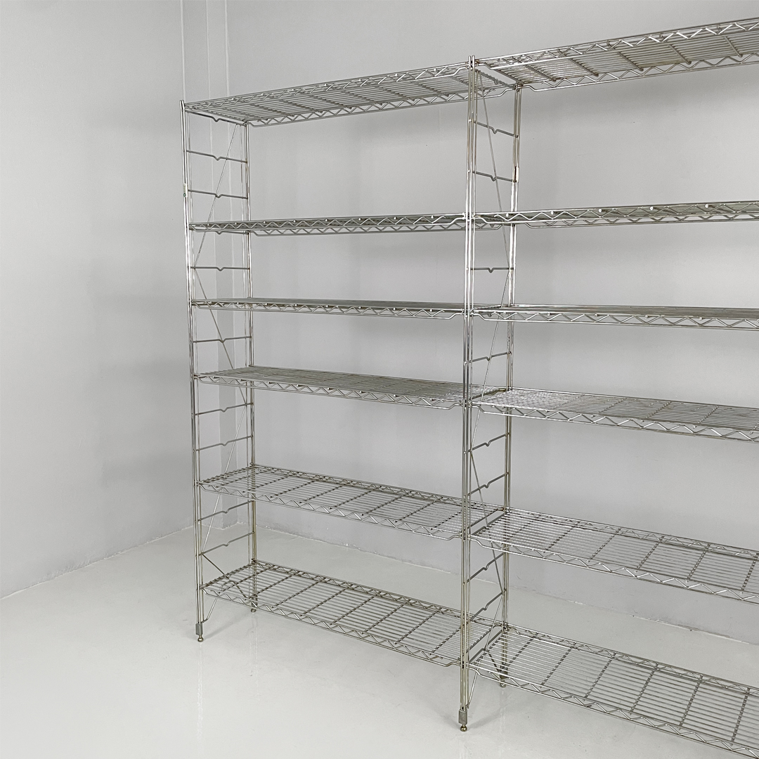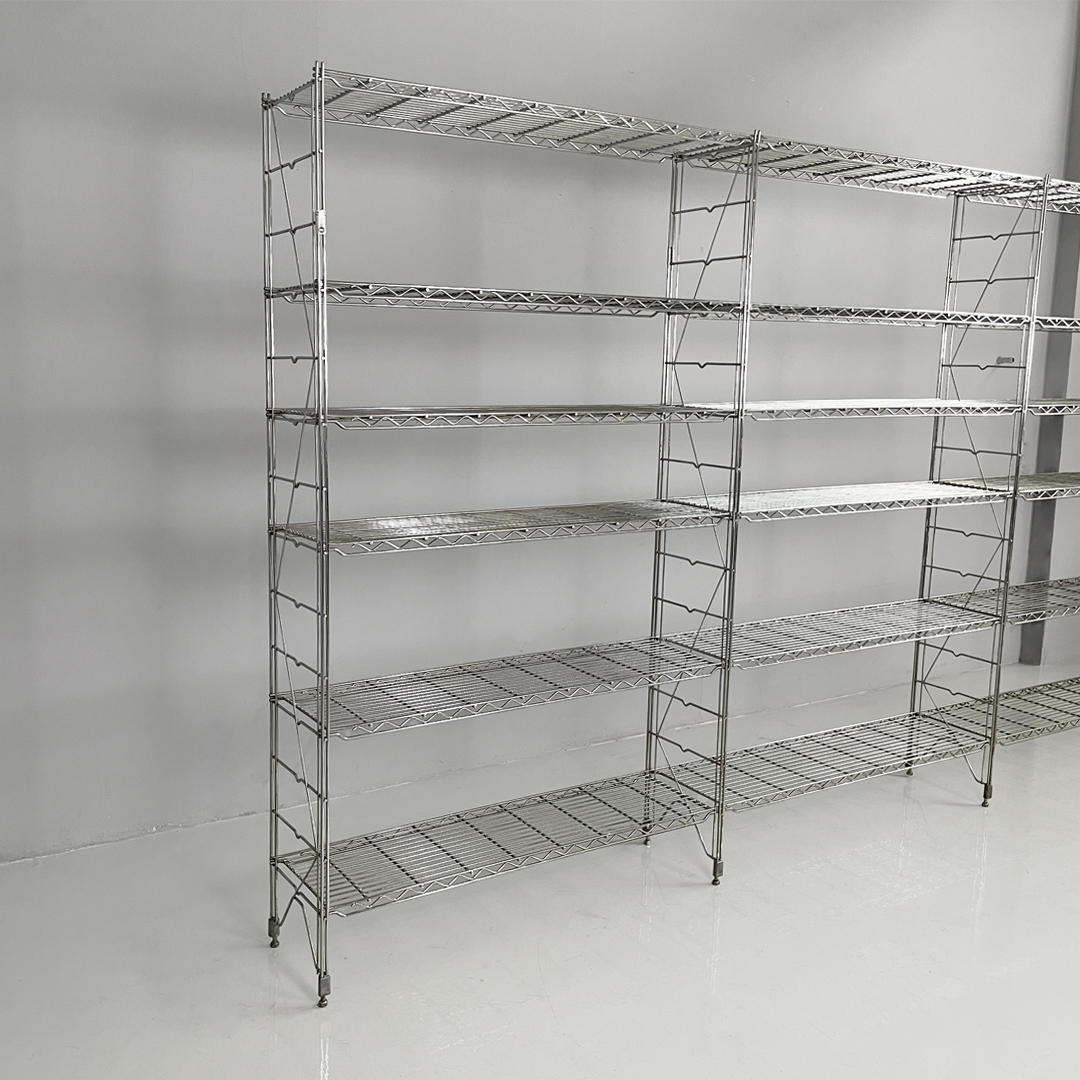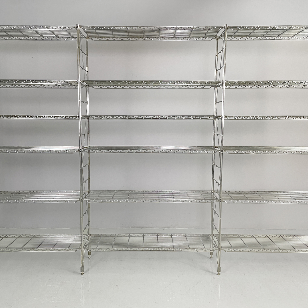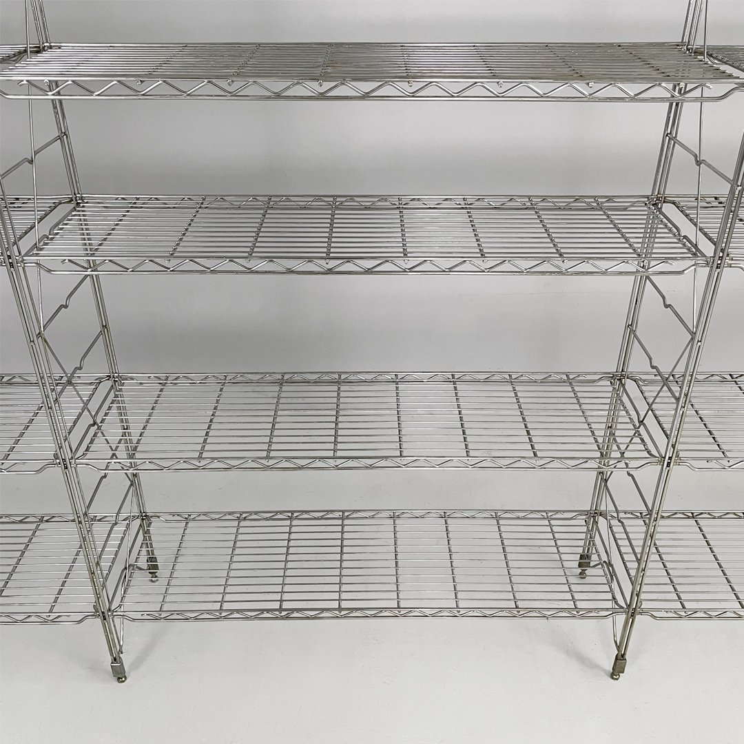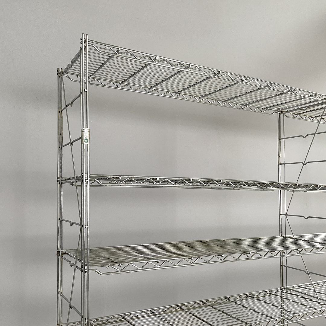 Libreria o scaffale interamente in metallo a tre campate. La struttura è composta da tondini di acciaio verticali, orizzontali e diagonali. Presenta ripiani rettangolari che si agganciano alla struttura e possono essere posizionati a piacere. I piedini sono regolabili. Può essere usato anche come espositore.