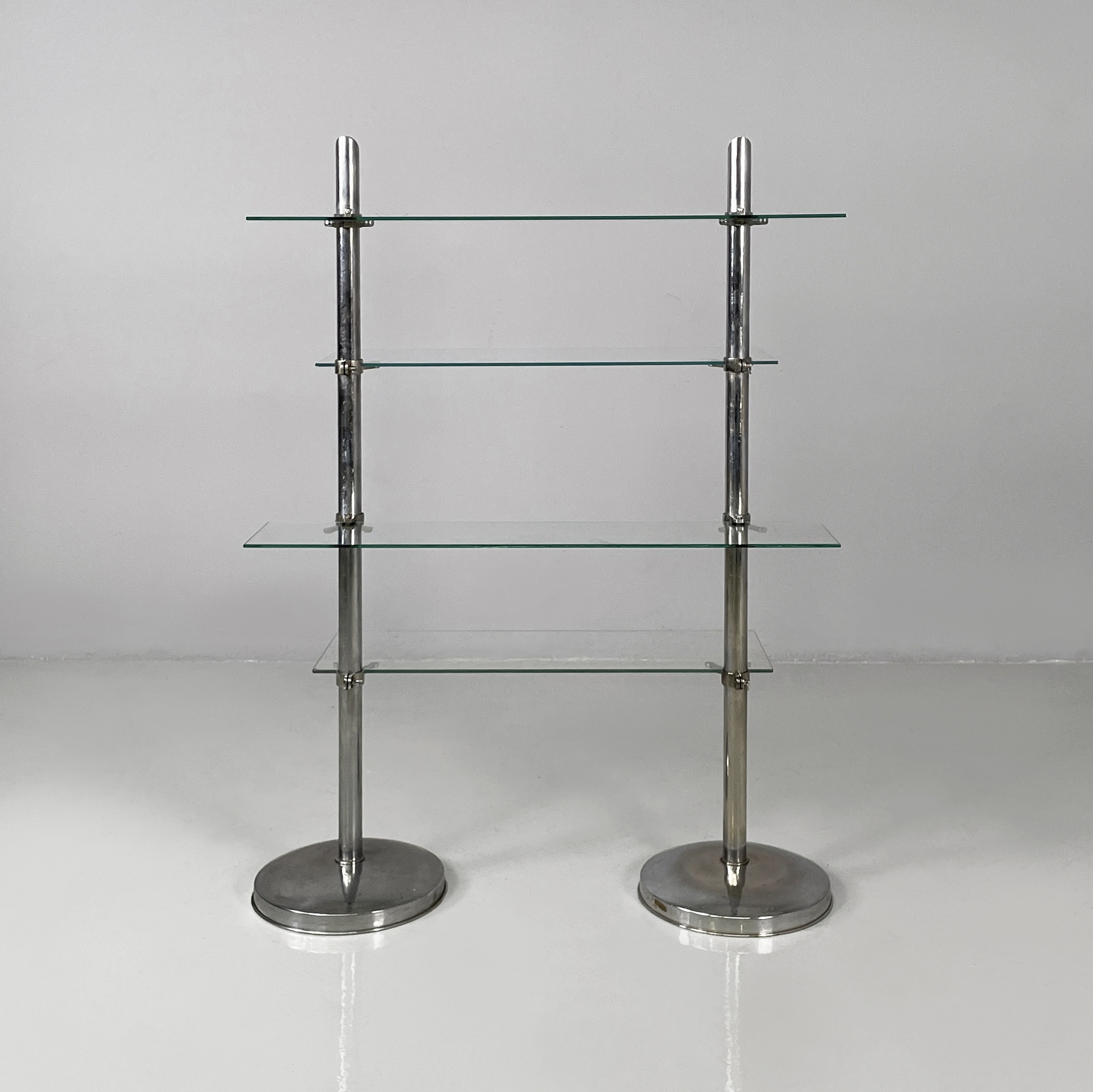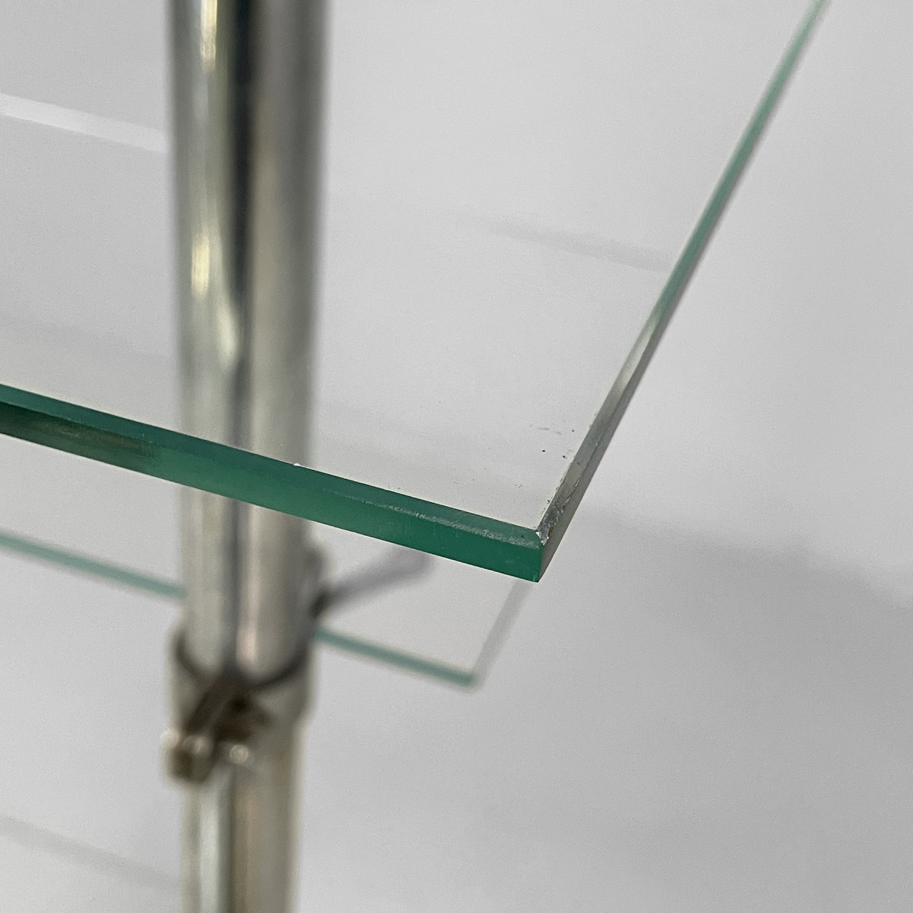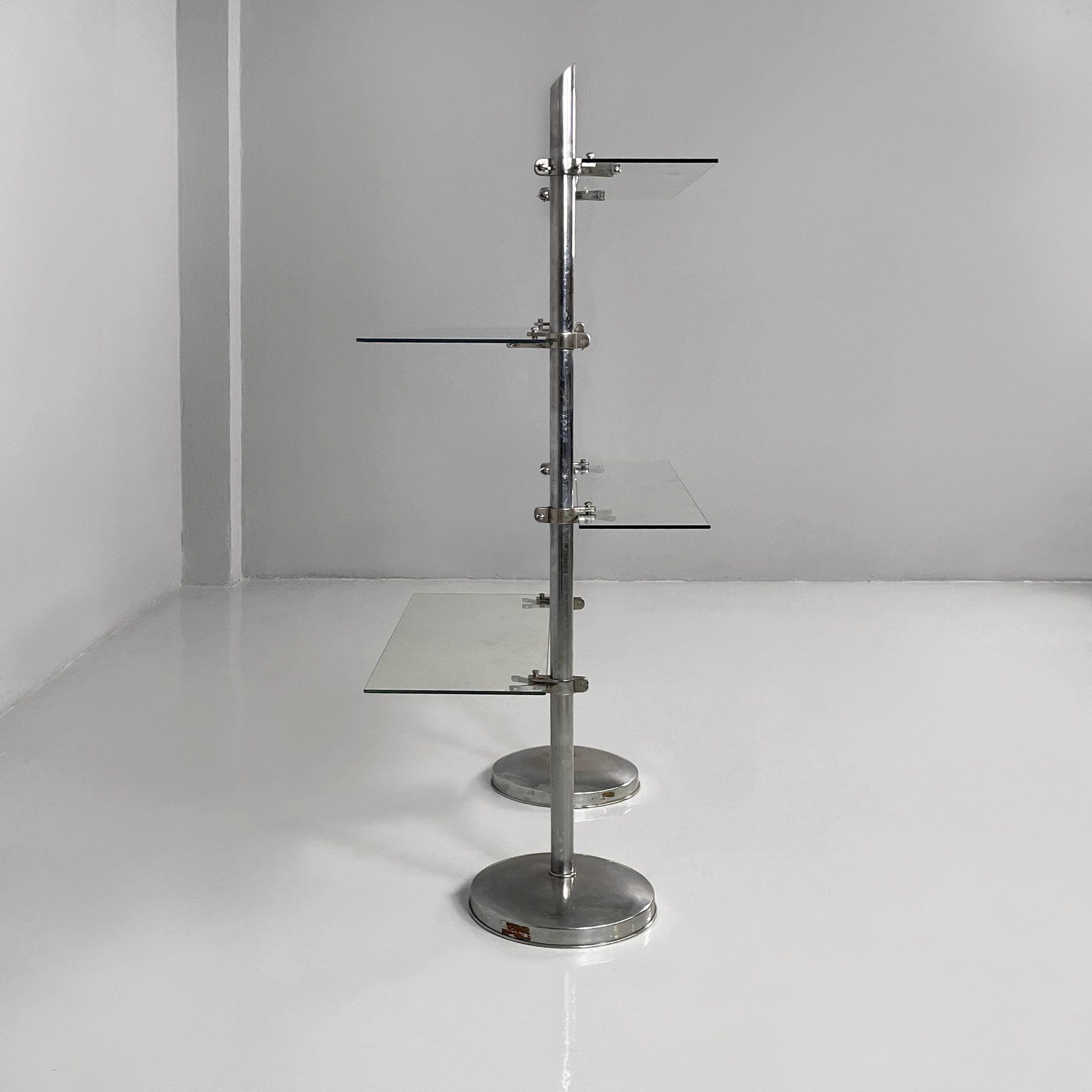 Libreria o espositore con quattro mensole rettangolari in vetro. La struttura è composta da due tubolari di metallo centrali, su cui sono disposti due ganci per ogni mensola. Le due strutture presentano due base tonde in metallo.