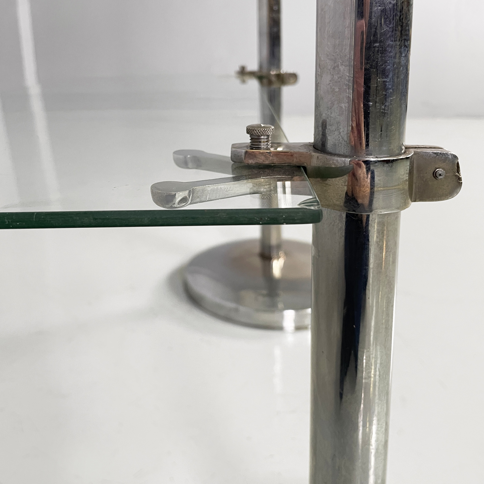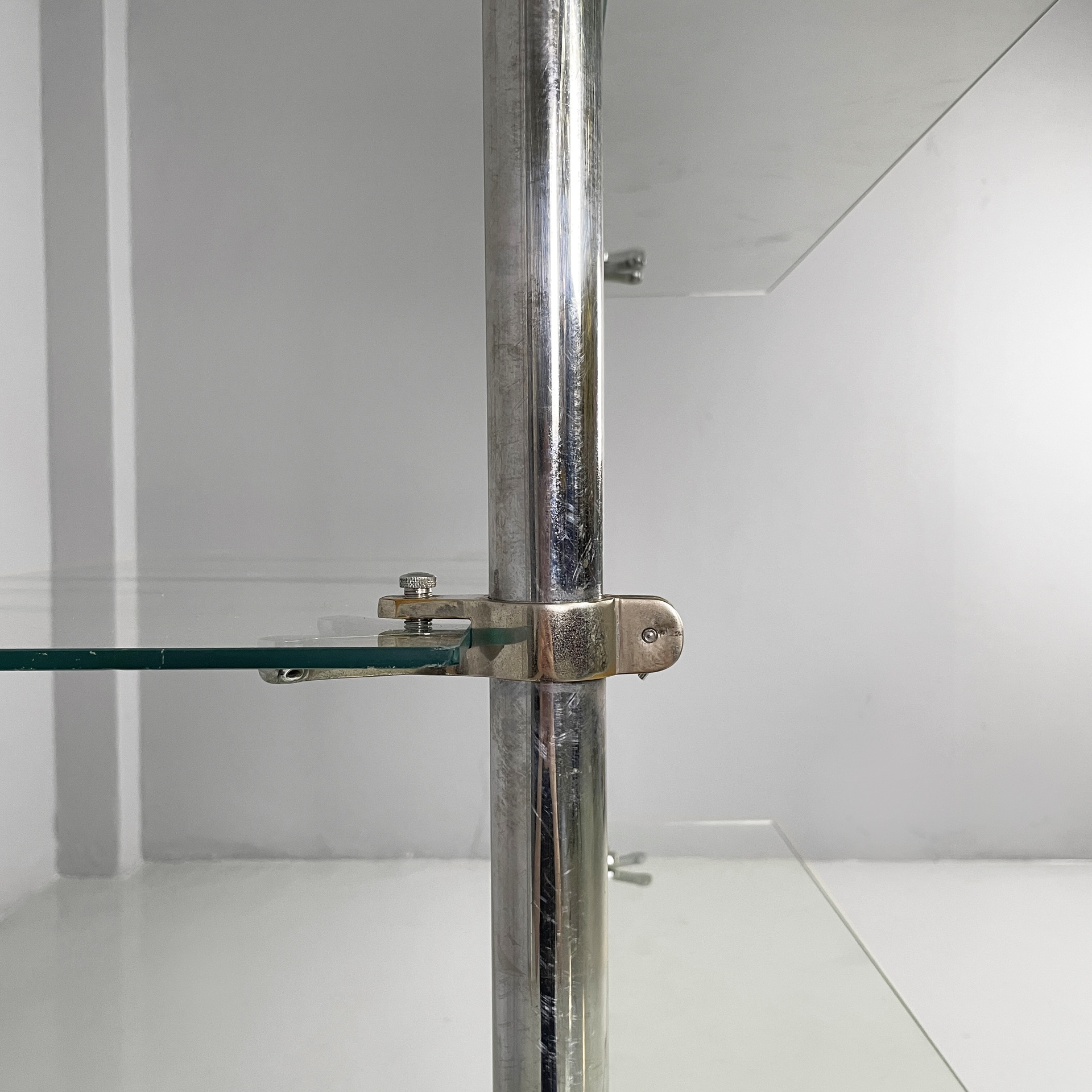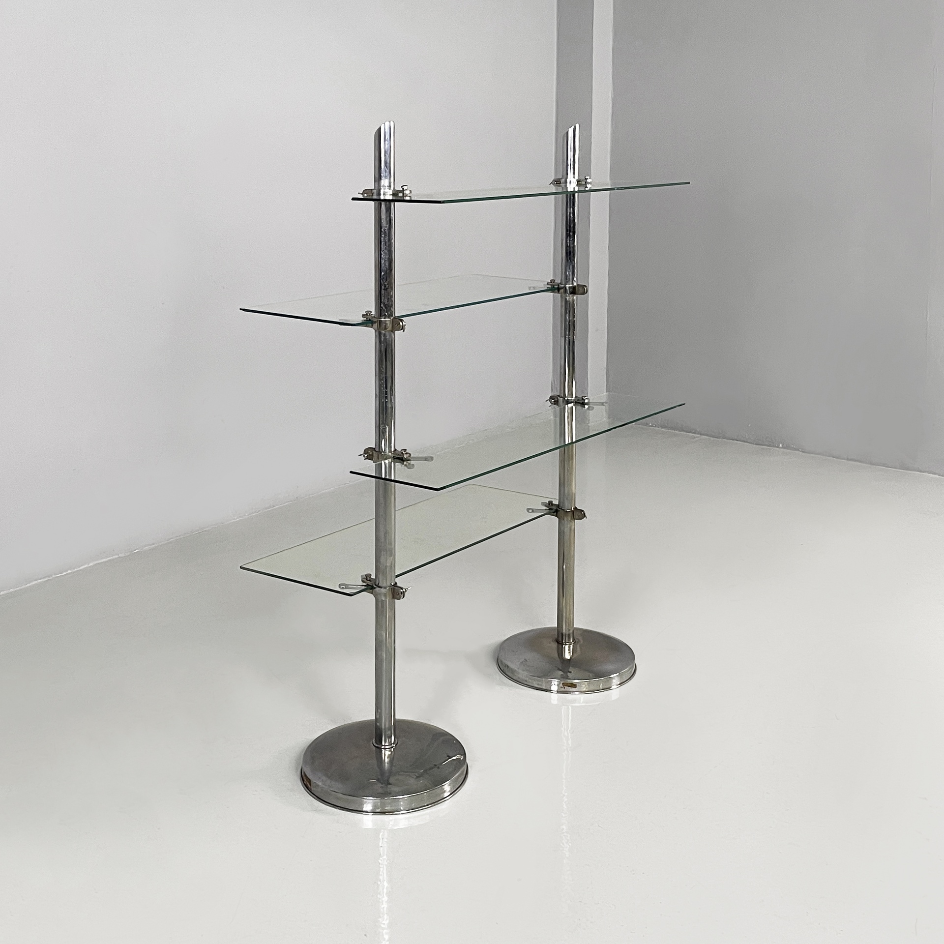 Libreria o espositore con quattro mensole rettangolari in vetro. La struttura è composta da due tubolari di metallo centrali, su cui sono disposti due ganci per ogni mensola. Le due strutture presentano due base tonde in metallo.