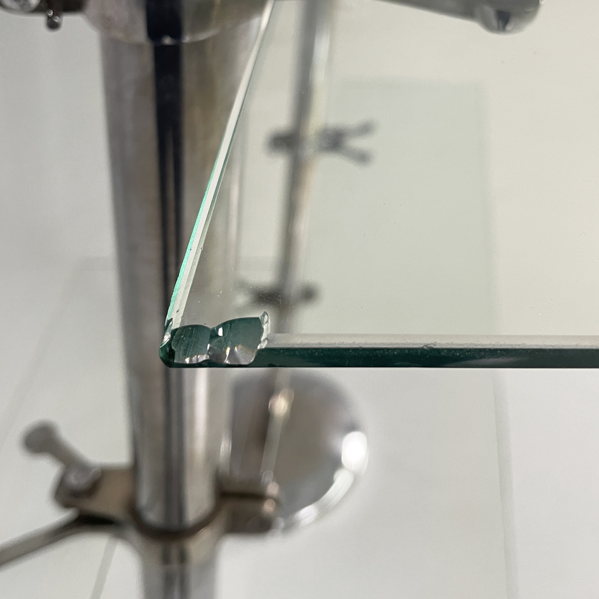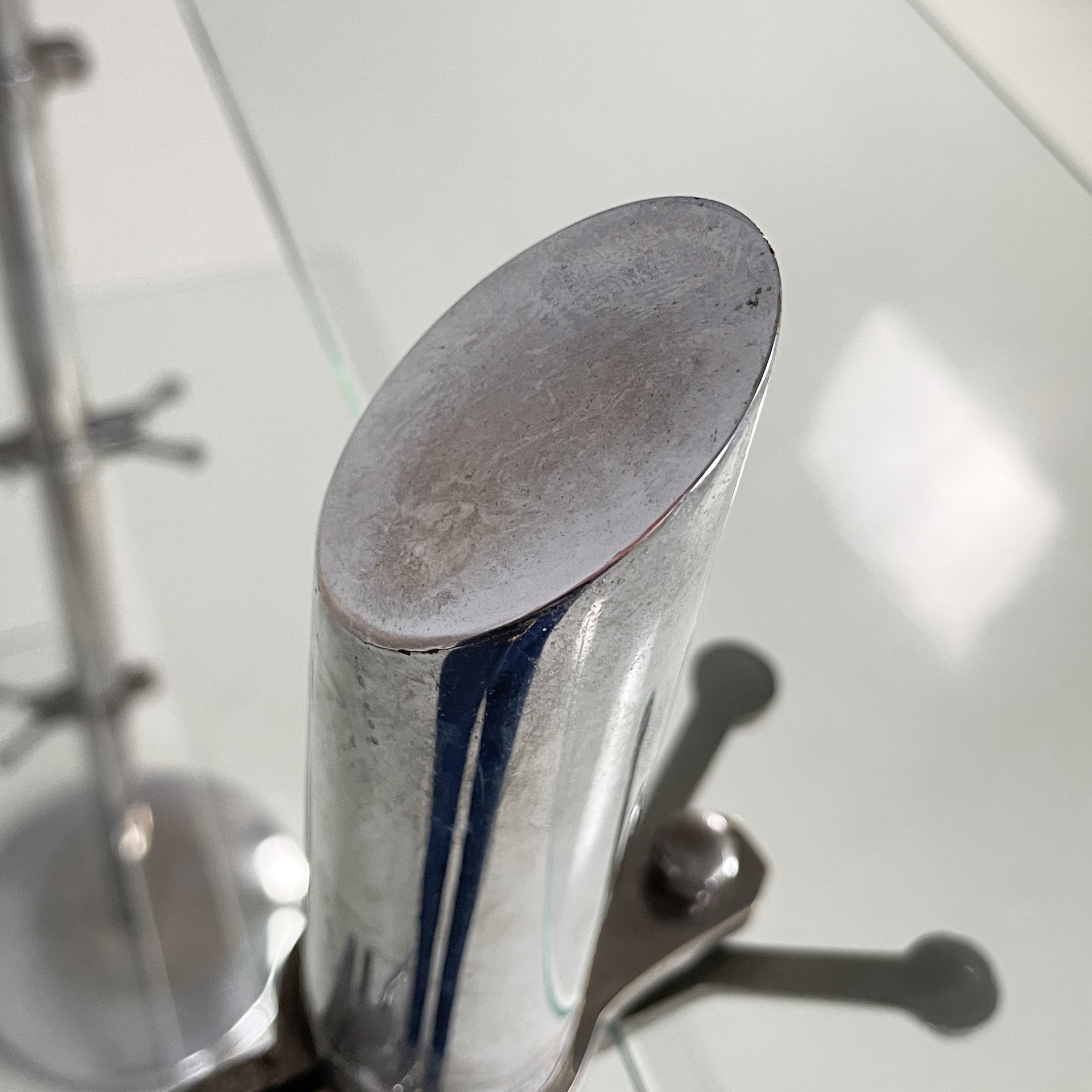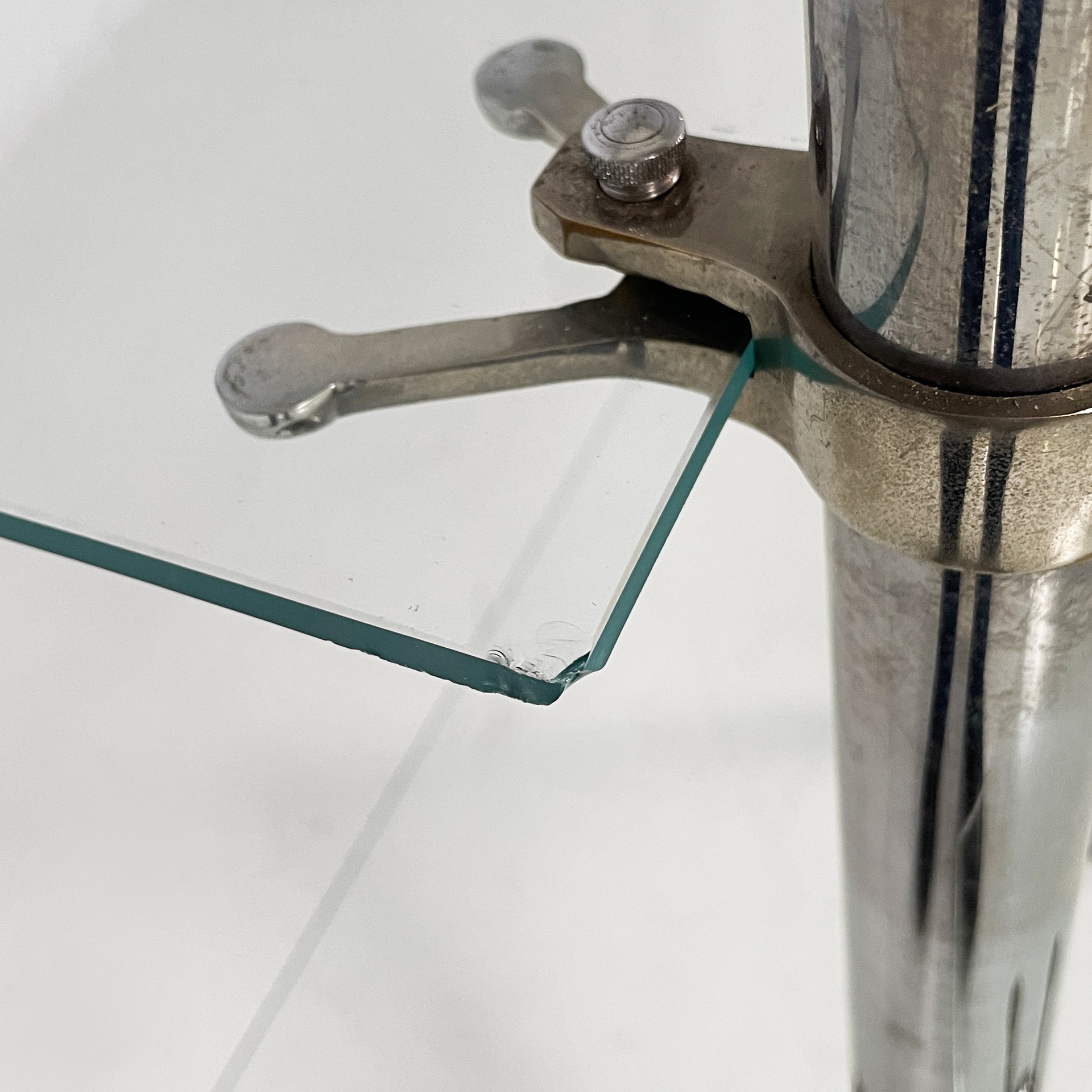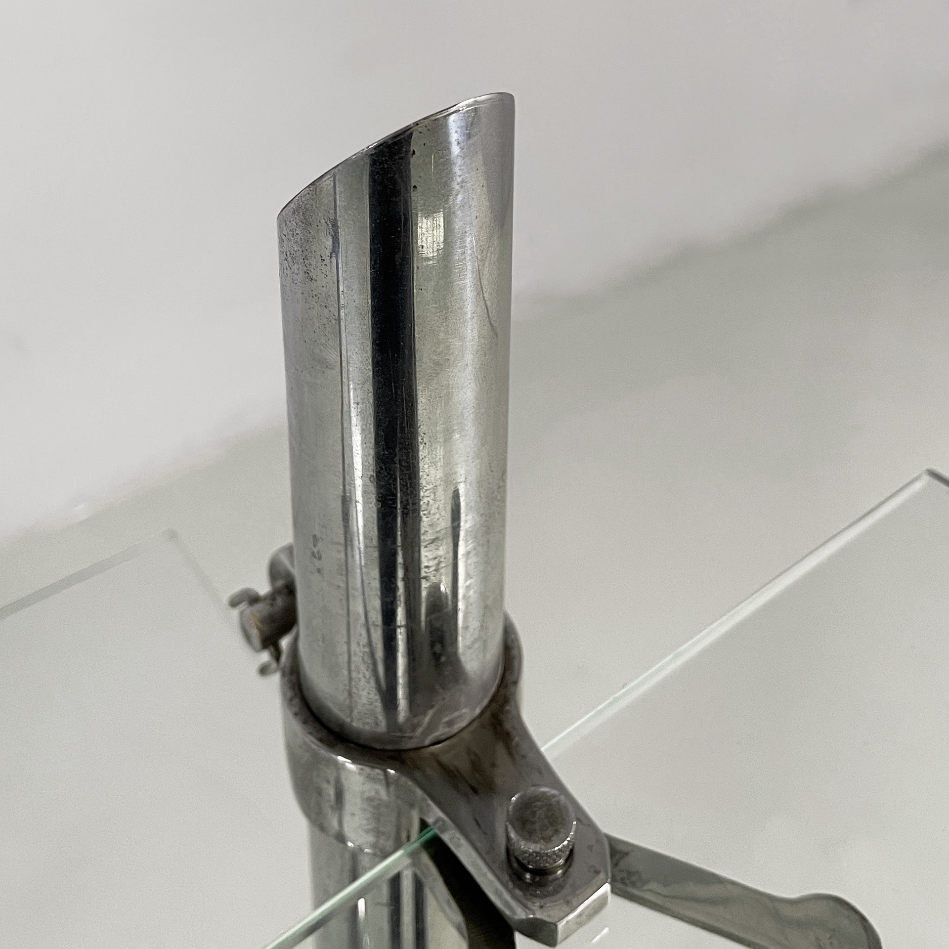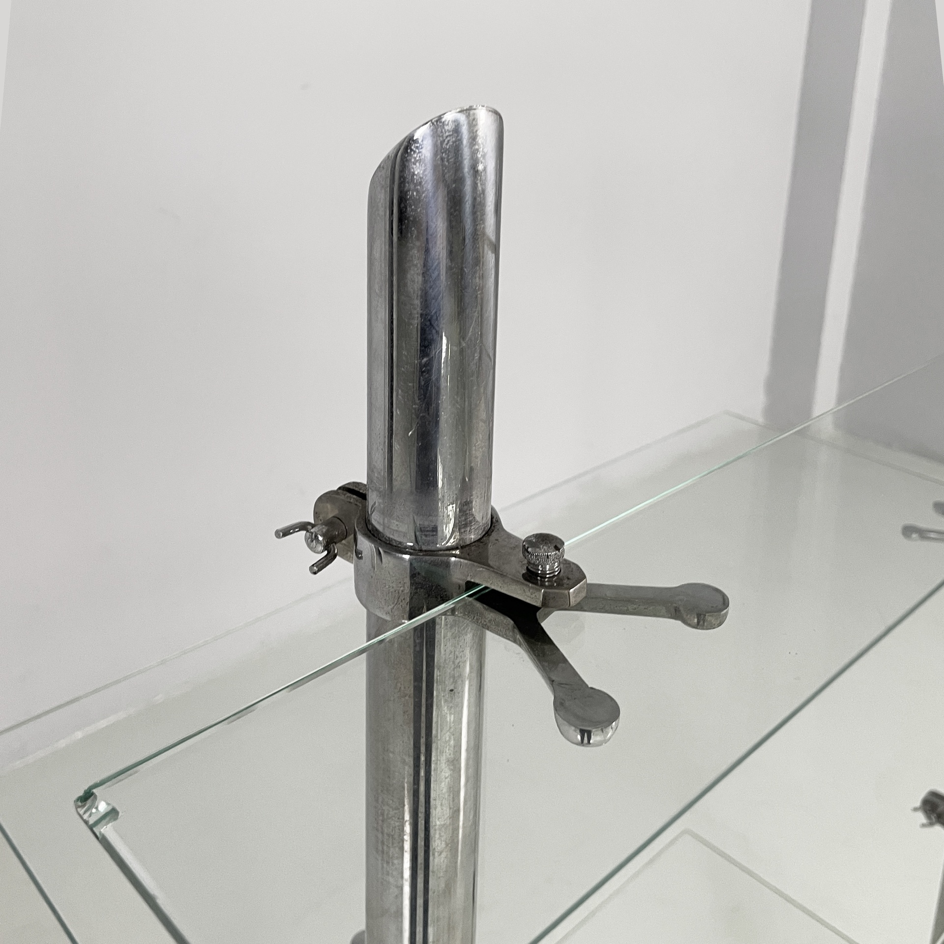 Condizioni discrete. Le mensole in vetro presentano piccole mancanze sul profilo. Segni del tempo sul metallo.