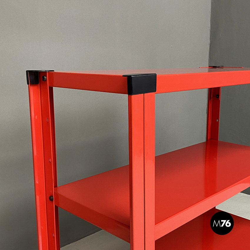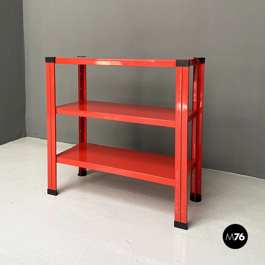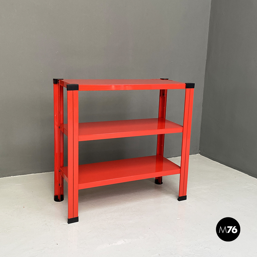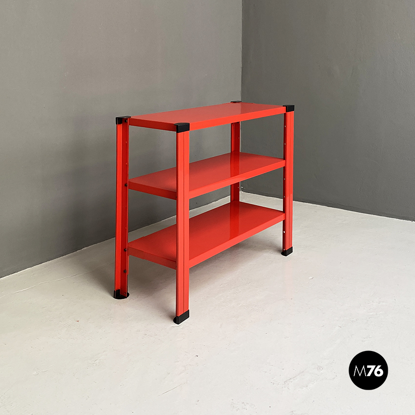 Libreria a tre ripiani in metallo verniciata in rosso con dettagli in plastica nera.
