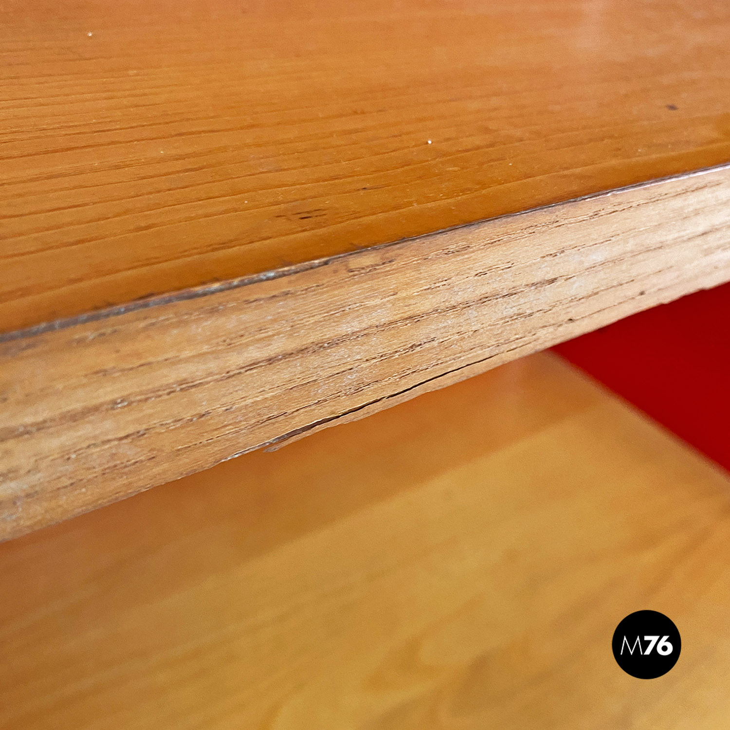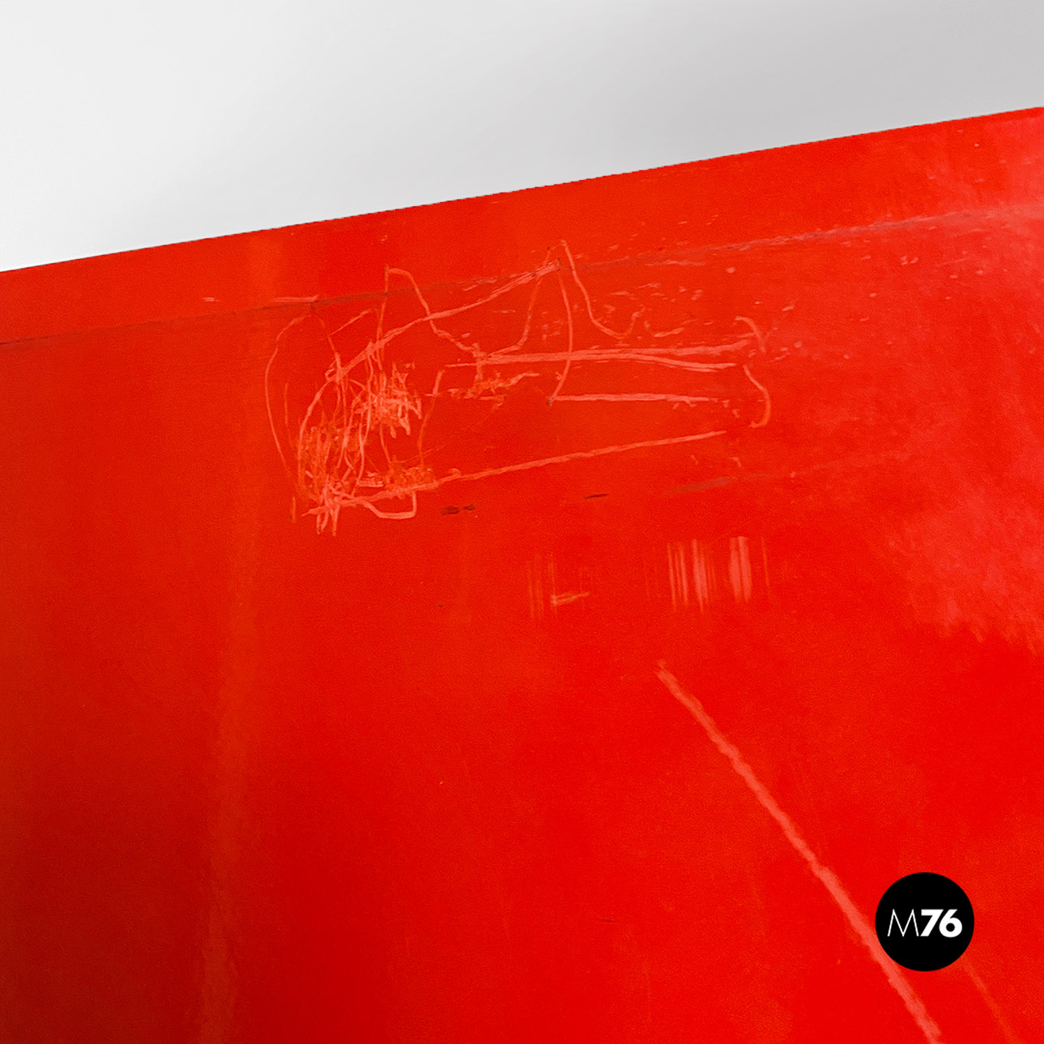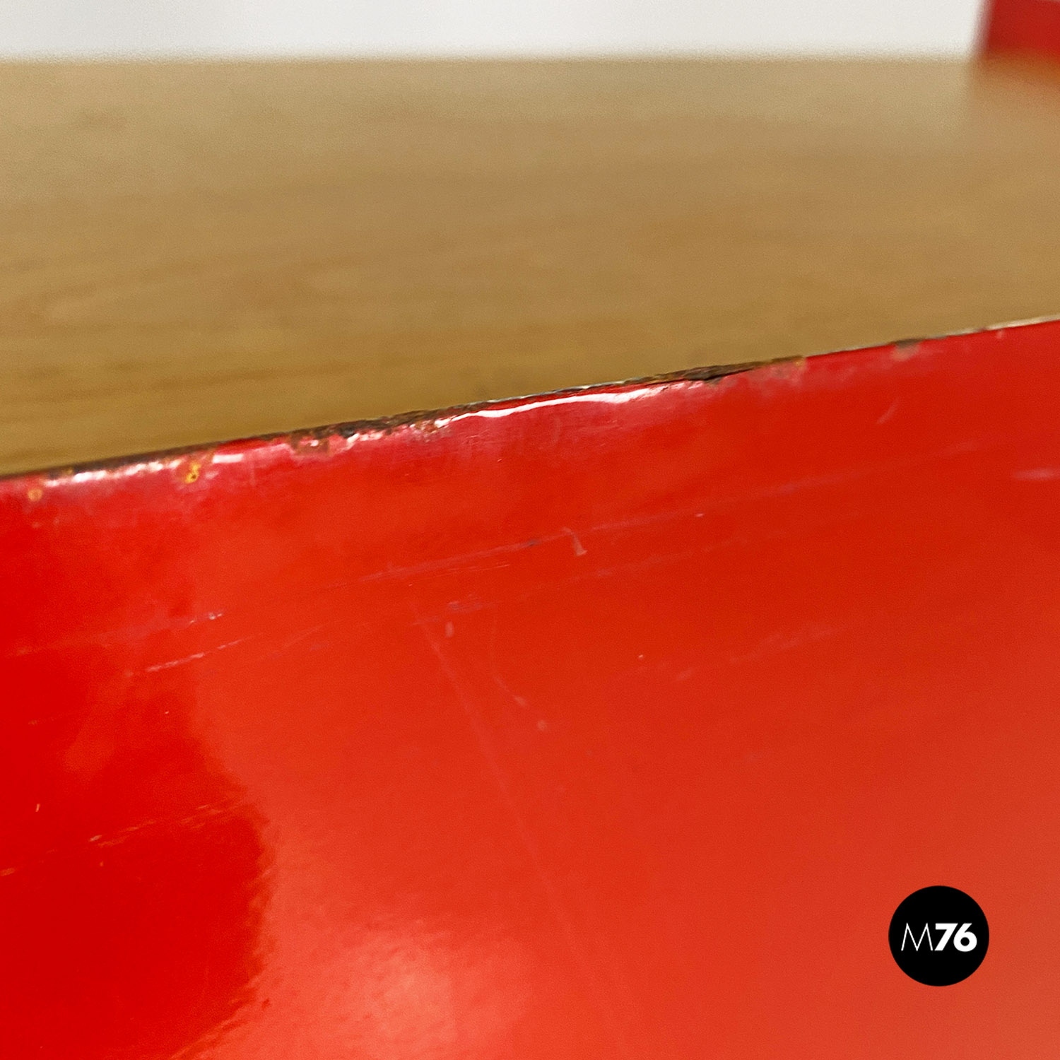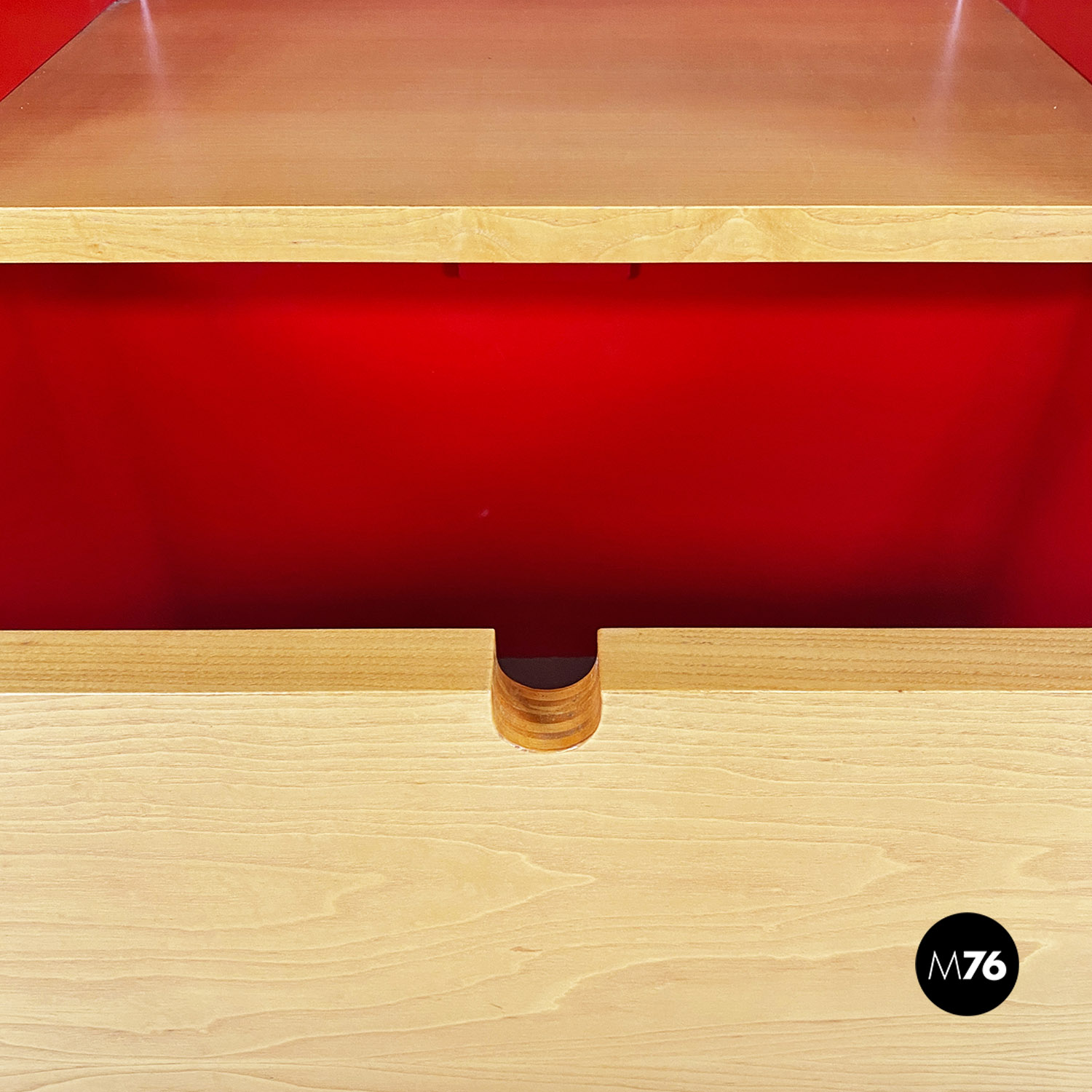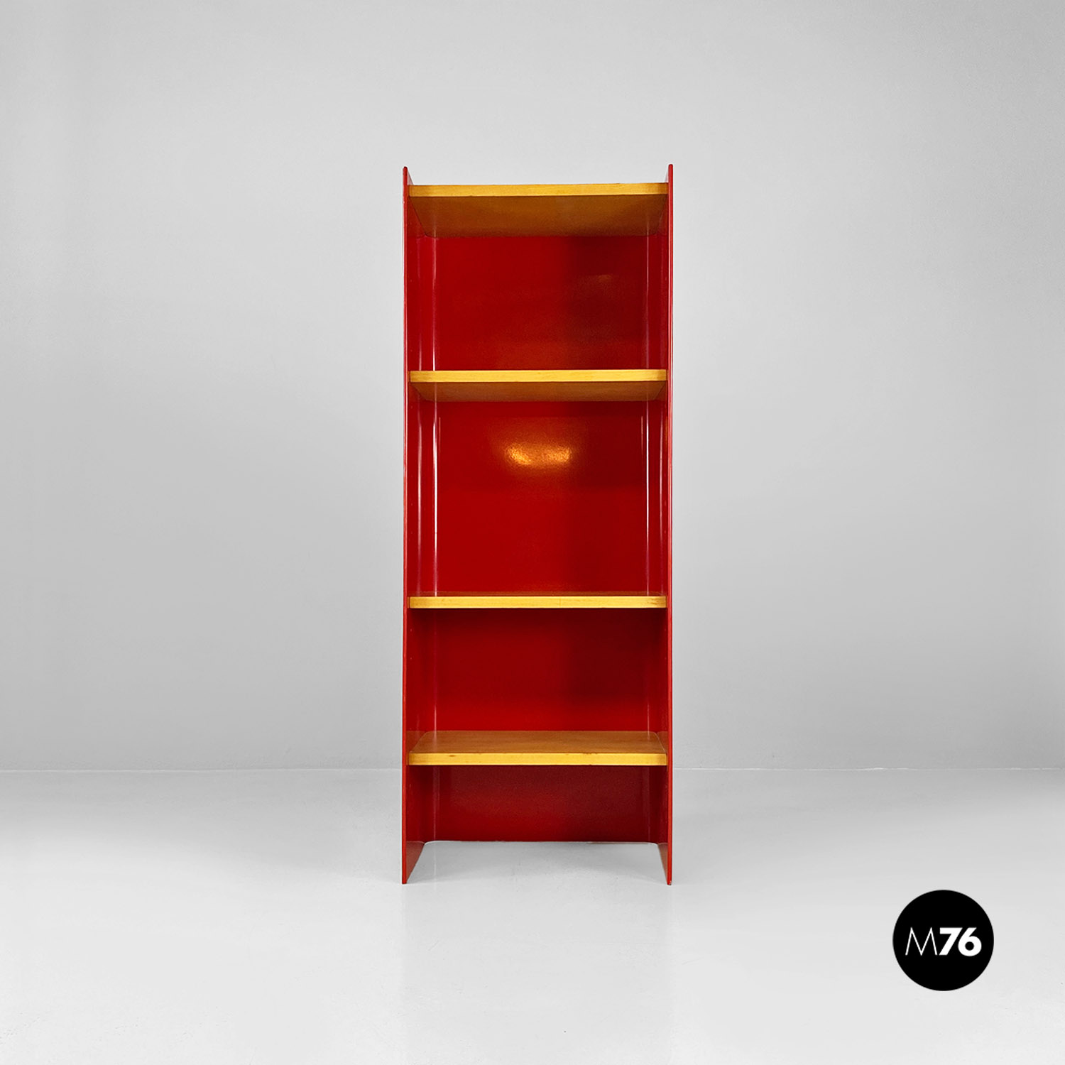 Libreria autoportante con struttura in metallo curvato e smaltato rosso lucido, con mensole in massello e cassetto centrale estraibile su ruote