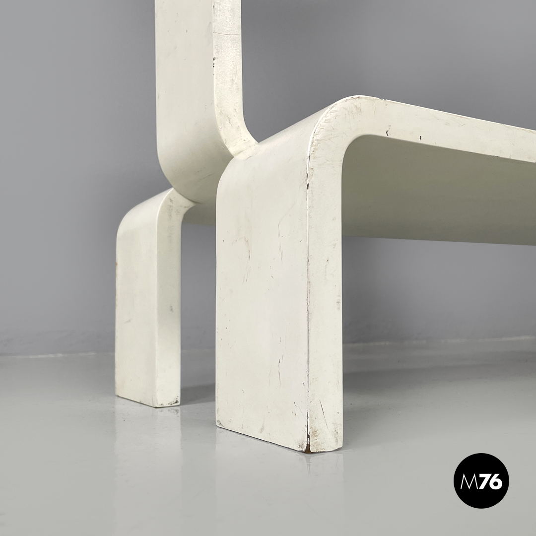Libreria modulare in legno laccato bianco e nero con finitura opaca. I moduli, che compongono sia la struttura che le mensole, hanno forme curve e tondeggianti e si incastrano i lati. L’appoggio a terra è dato da tre piedini rettangolari allungati, due da una parte e uno dall’altra.