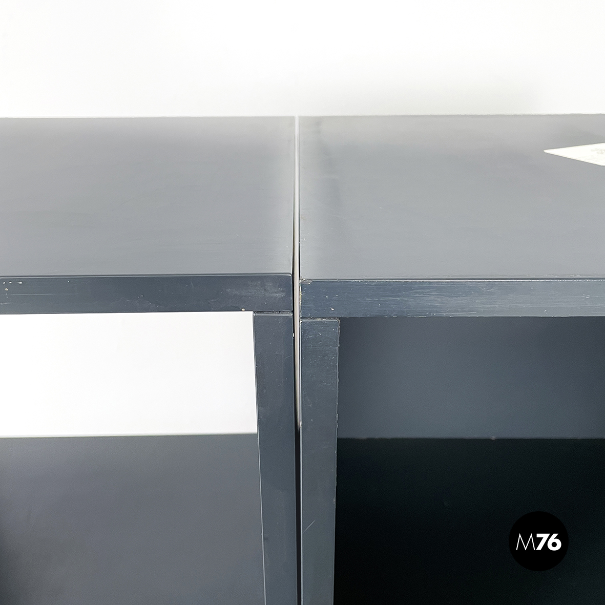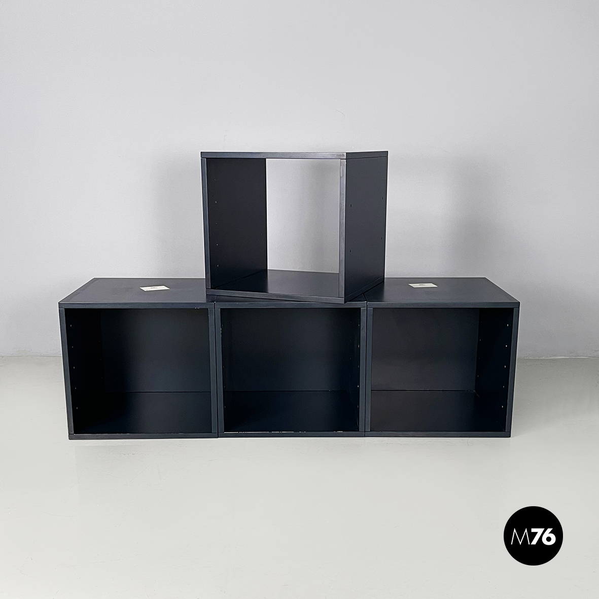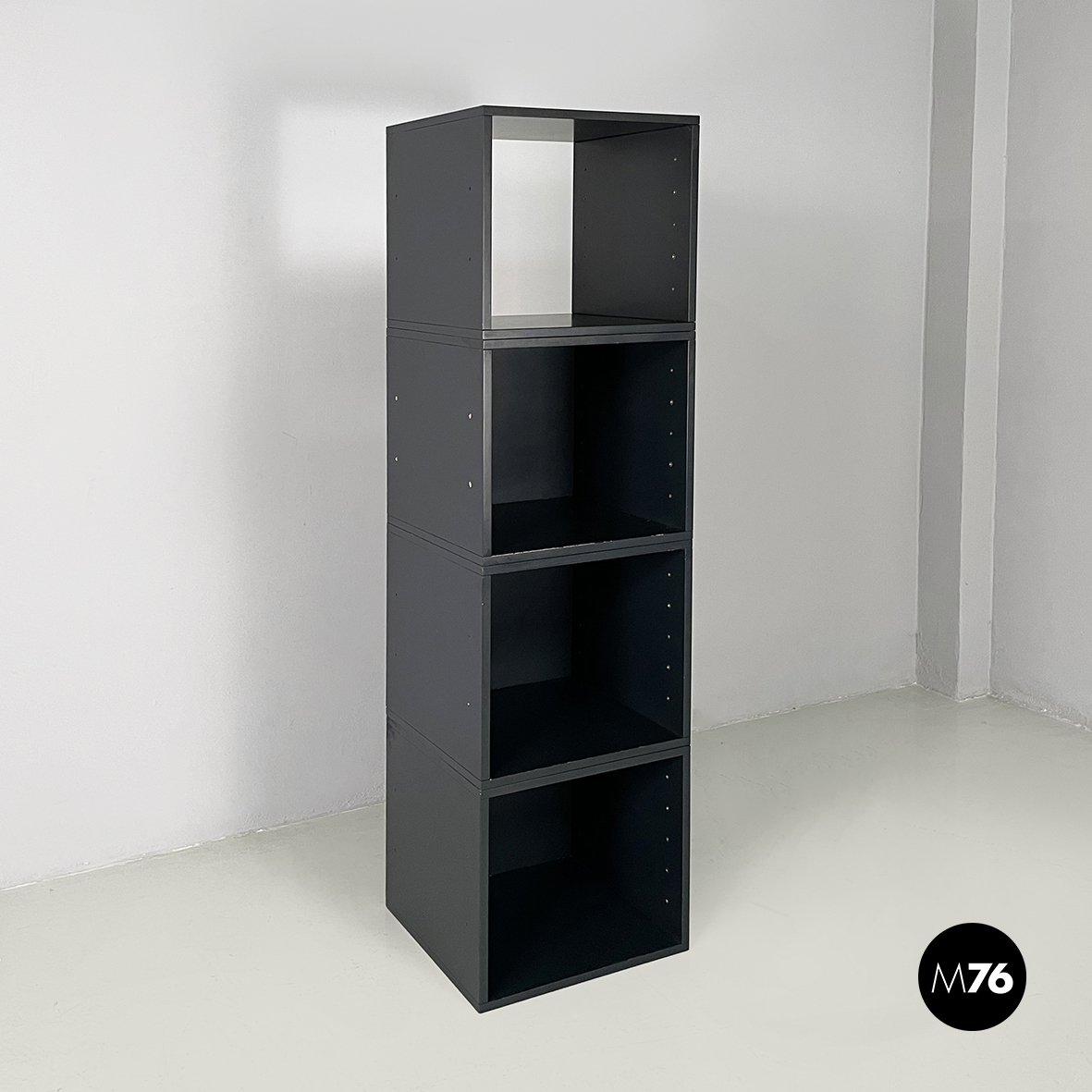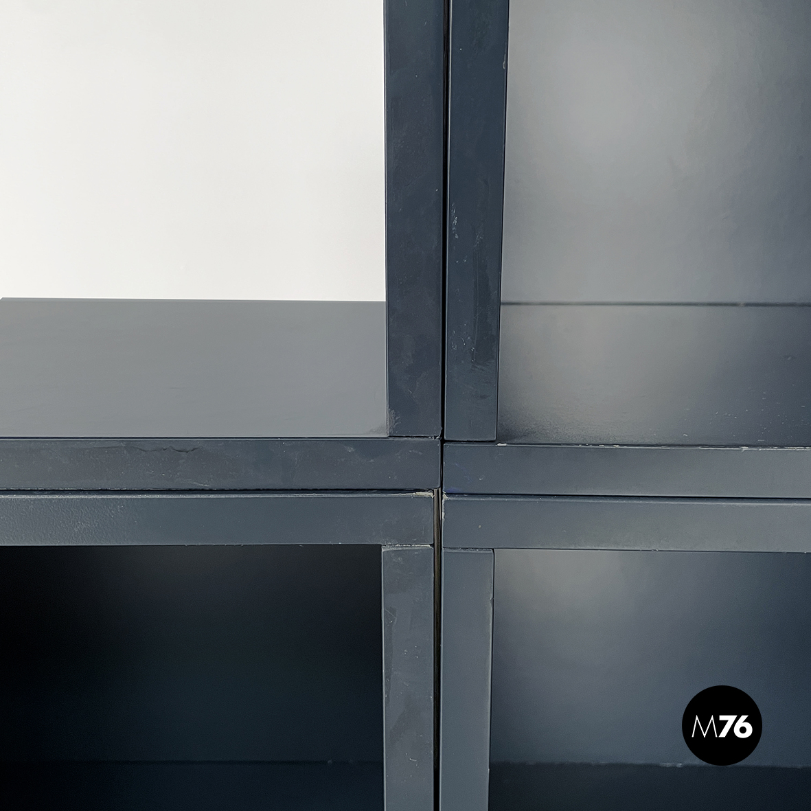 Libreria modulare modello Programma 1 composta da quattro moduli in legno laccati blu scuro con finitura opaca. Tre vani presentano il fondo chiuso, mentre uno è aperto. Sui lati sono presenti dei piccoli fori. I moduli possono essere disposti e combinati a piacimento, i moduli singoli possono essere utilizzati anche come comodini o tavoli da caffè.