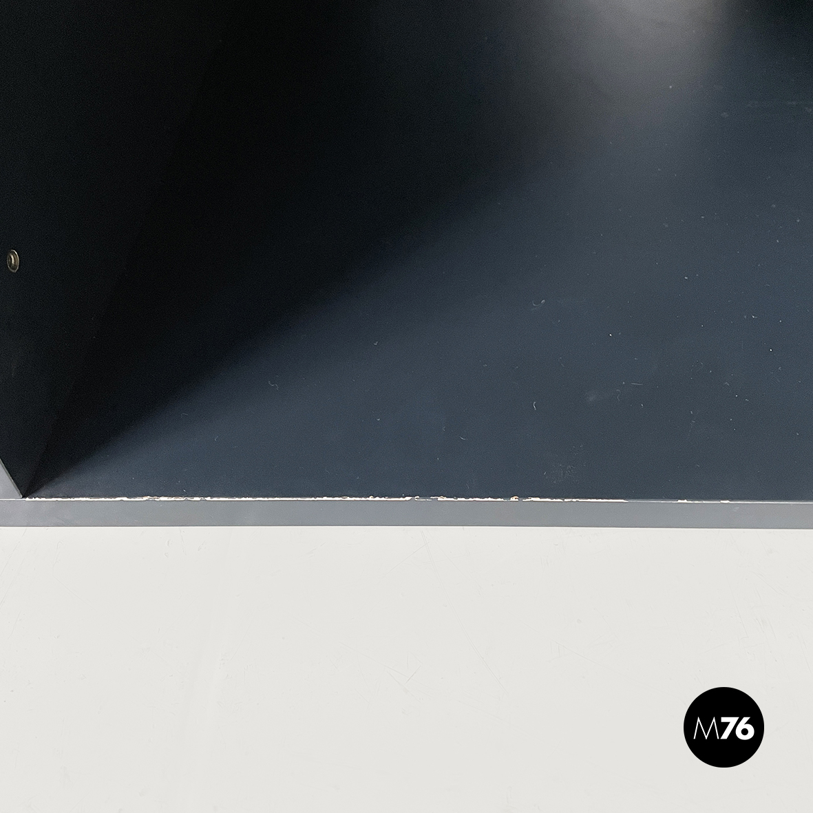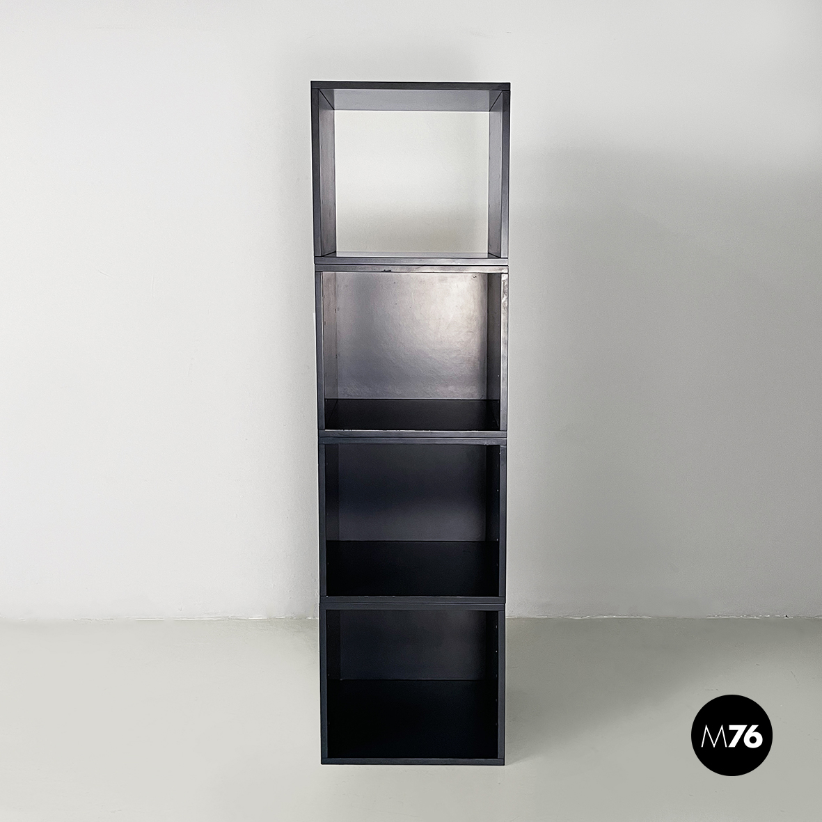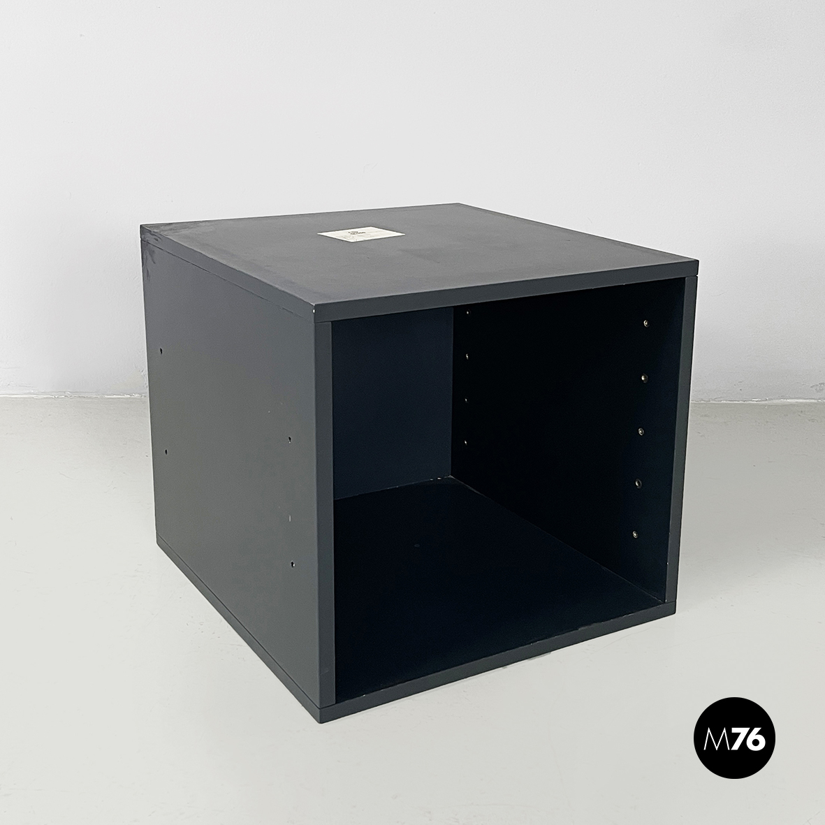 Libreria modulare modello Programma 1 composta da quattro moduli in legno laccati blu scuro con finitura opaca. Tre vani presentano il fondo chiuso, mentre uno è aperto. Sui lati sono presenti dei piccoli fori. I moduli possono essere disposti e combinati a piacimento, i moduli singoli possono essere utilizzati anche come comodini o tavoli da caffè.