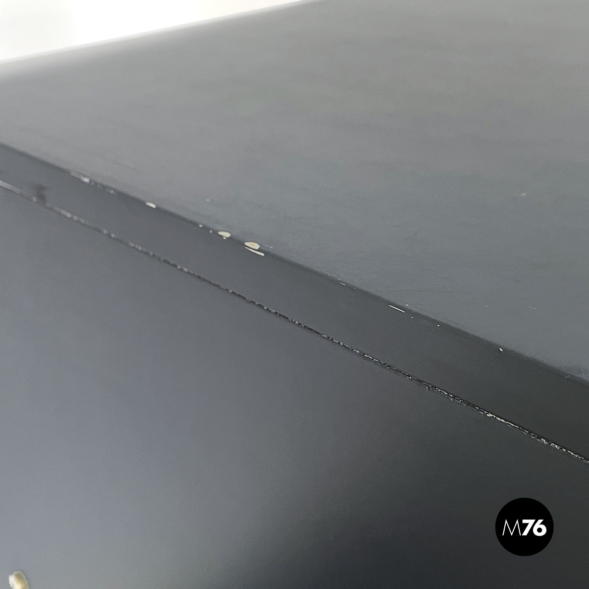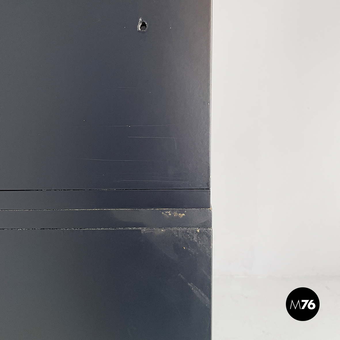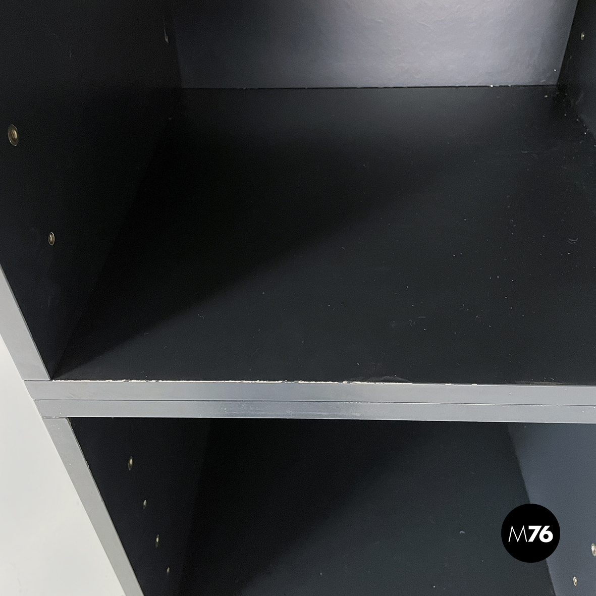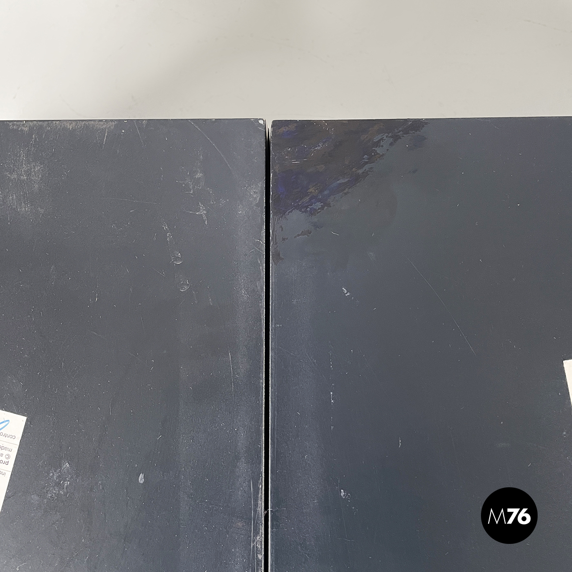Libreria modulare modello Programma 1 composta da quattro moduli in legno laccati blu scuro con finitura opaca. Tre vani presentano il fondo chiuso, mentre uno è aperto. Sui lati sono presenti dei piccoli fori. I moduli possono essere disposti e combinati a piacimento, i moduli singoli possono essere utilizzati anche come comodini o tavoli da caffè.