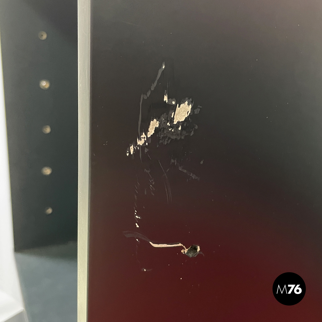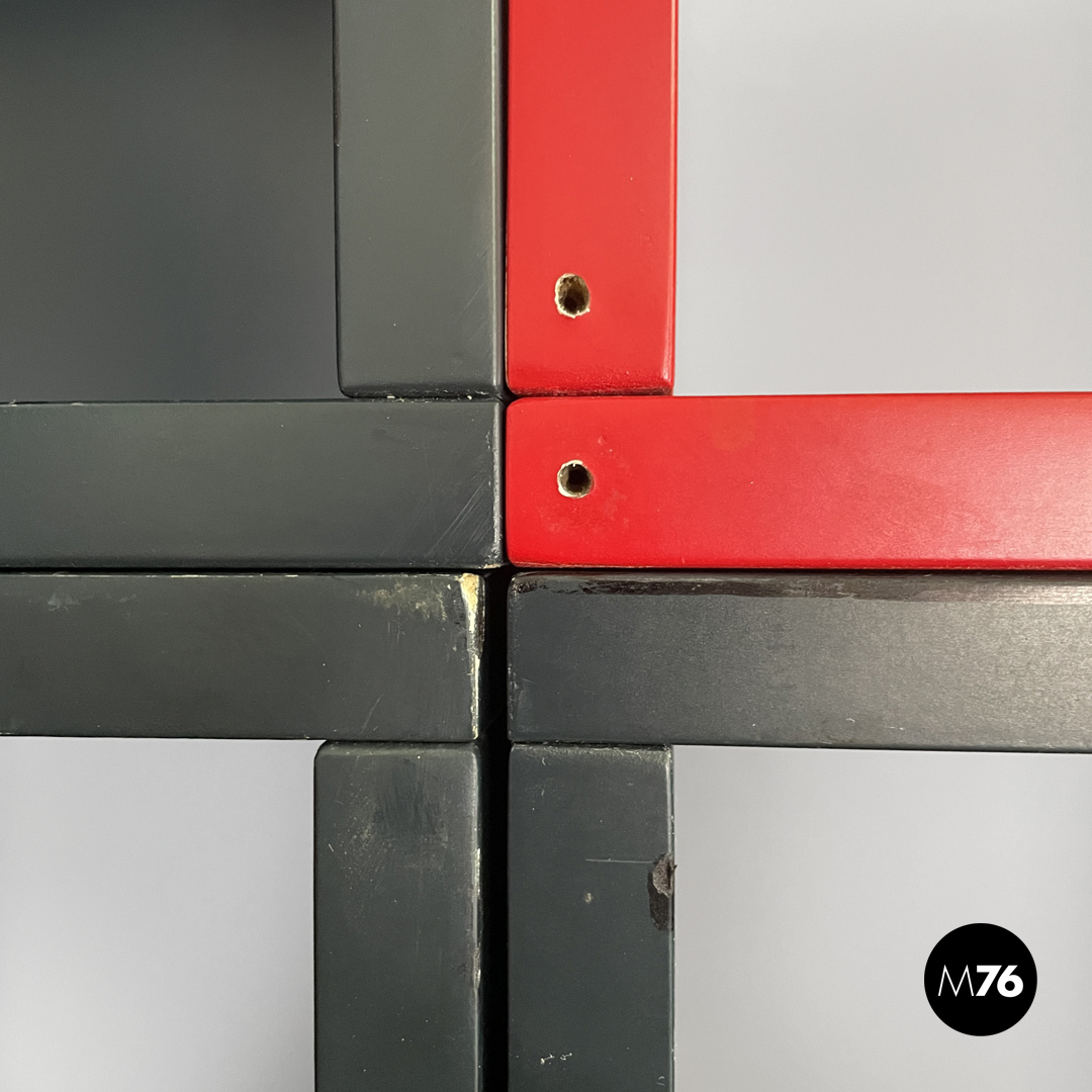 Libreria modulare modello Programma 1 composta da quarantatre moduli in legno laccati di rosso e blu scuro con finitura opaca. Alcuni dei moduli presentano un lato chiuso, uno dei moduli ha un lato laccato di bianco, sui lati dei moduli si trovano dei piccoli fori. I moduli possono essere disposti e combinati a piacimento, i moduli singoli possono essere utilizzati anche come comodini o tavoli da caffè.