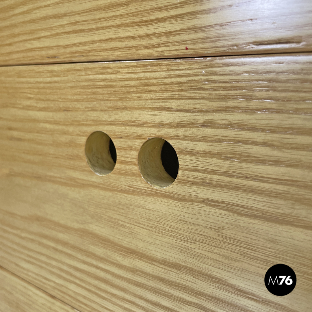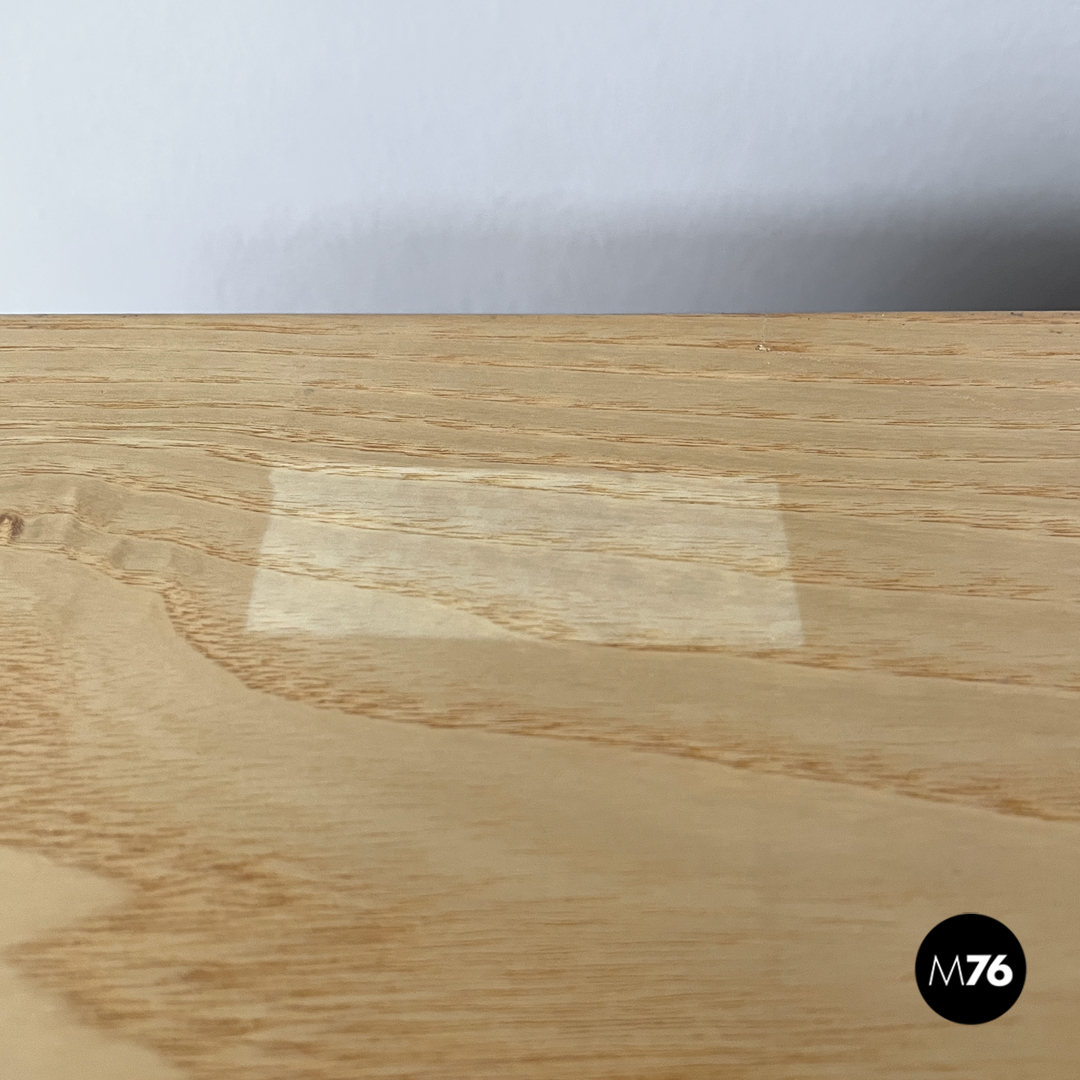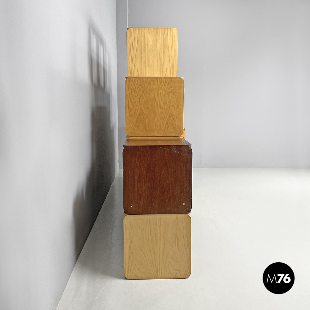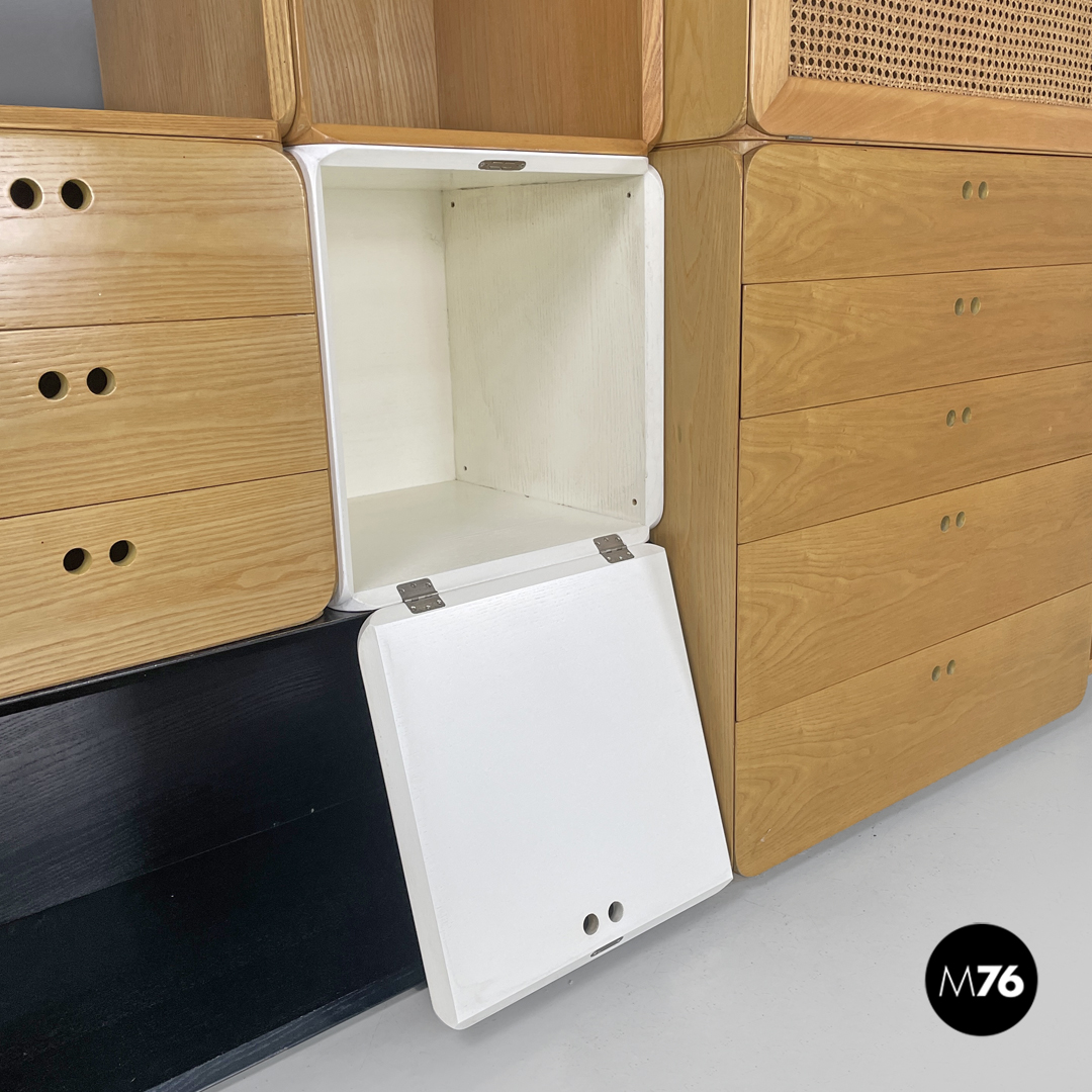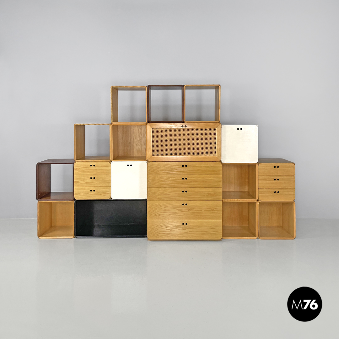 Libreria modulare modello Samara in legno. I moduli presenti sono vari: una cassettiera rettangolare in legno chiaro con cinque cassetti, due cassettiere cubiche in legno chiaro con tre cassetti, cinque cubi in legno chiaro con il fondo, tre cubi in legno chiaro senza fondo, due cubi in legno laccato bianco a ribalta, due cubi in legno scuro senza fondo, un modulo rettangolare con ribalta rivestita in paglia di Vienna ed infine un modulo rettangolare in legno laccato nero con il fondo e con piedini in metallo. I moduli posso essere disposti come si desidera. Ogni modulo presenta angoli smussati tondeggianti.