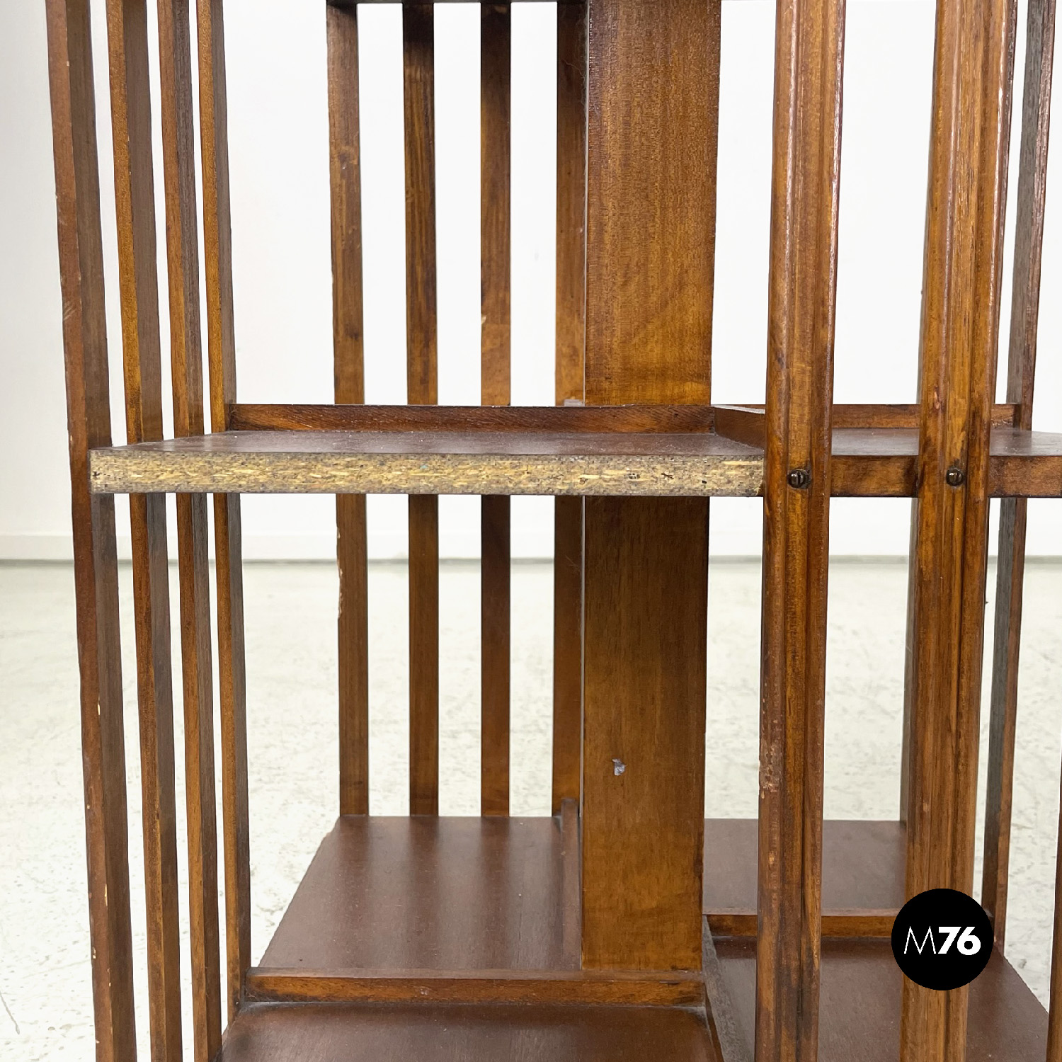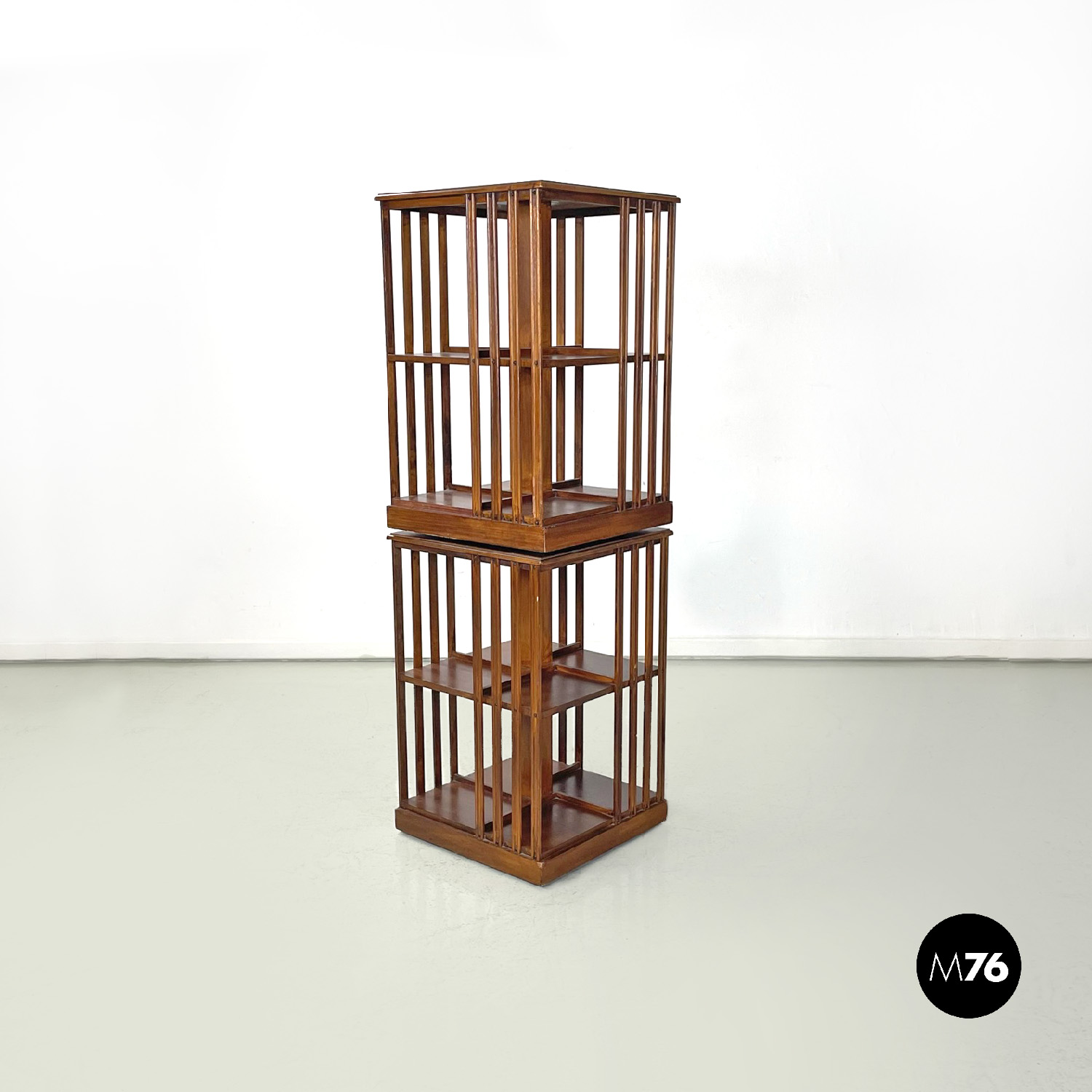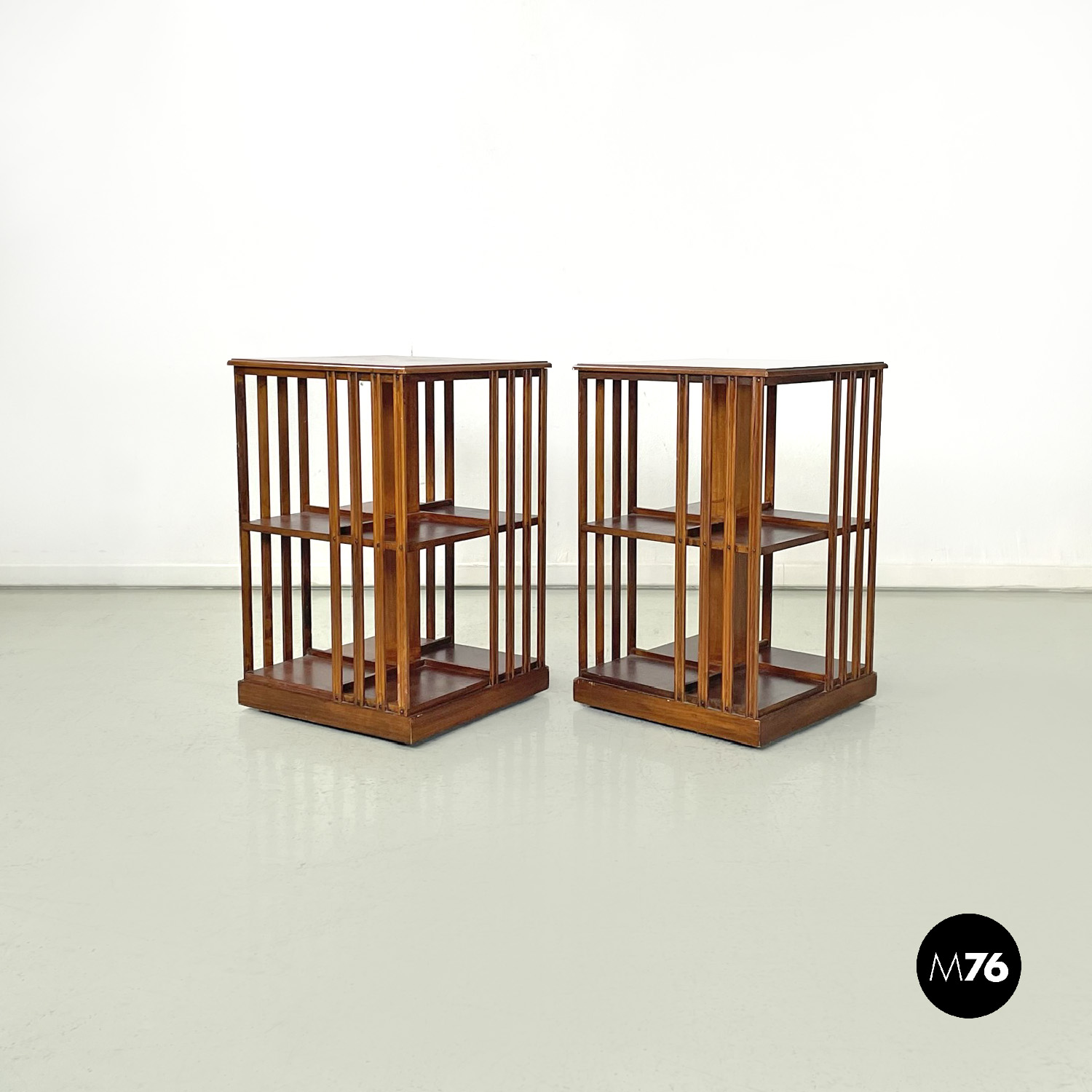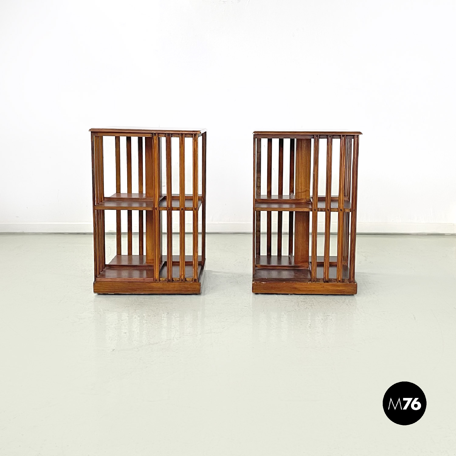Coppia di librerie girevoli a base quadrata interamente in legno. La struttura presenta un perno centrale, i due ripiani sono uniti da una serie di listelli di legno verticali paralleli. Sui ripiani si trovano quattro listelli che fanno da divisori. Sul piano superiore è presente una decorazione floreale. Utilizzabili anche come comodini o tavoli da caffè, possono essere impilati.
