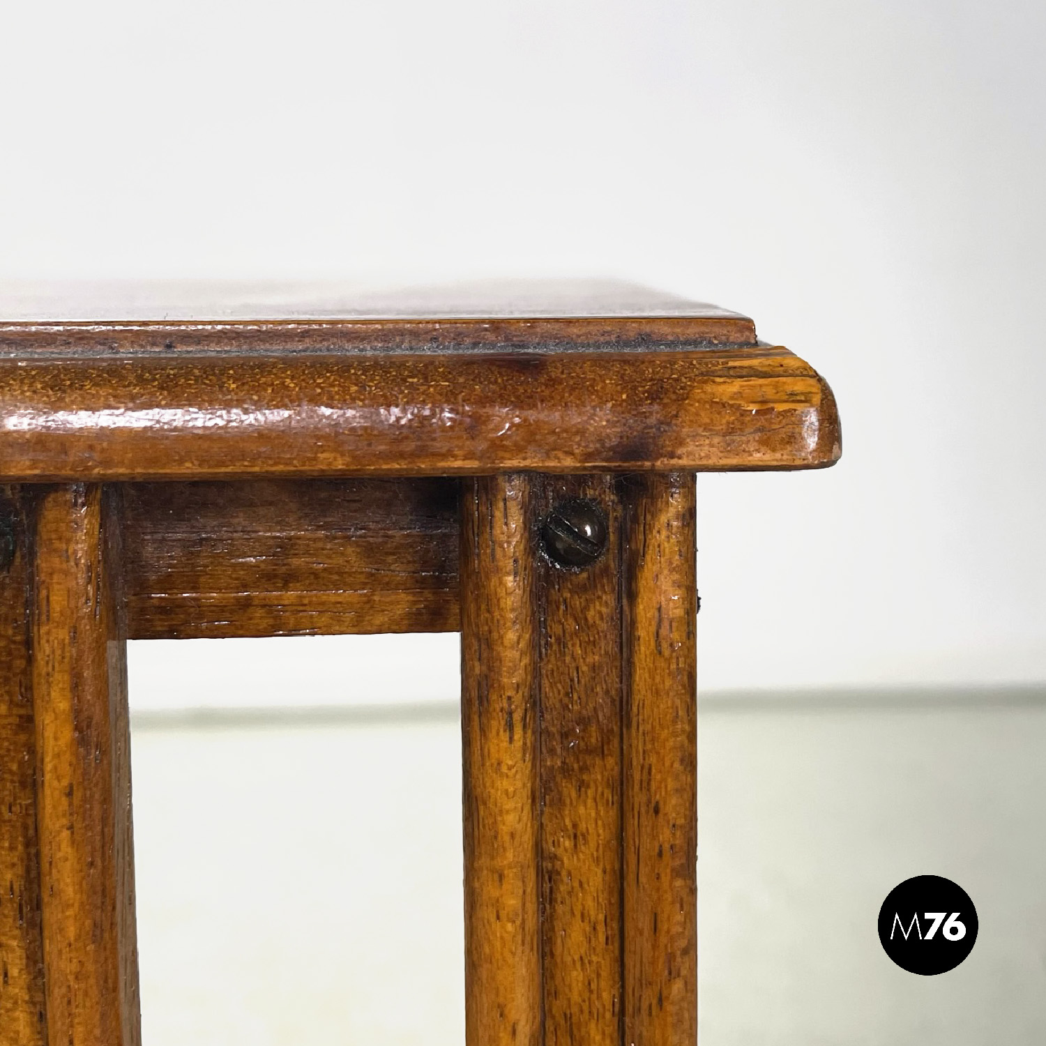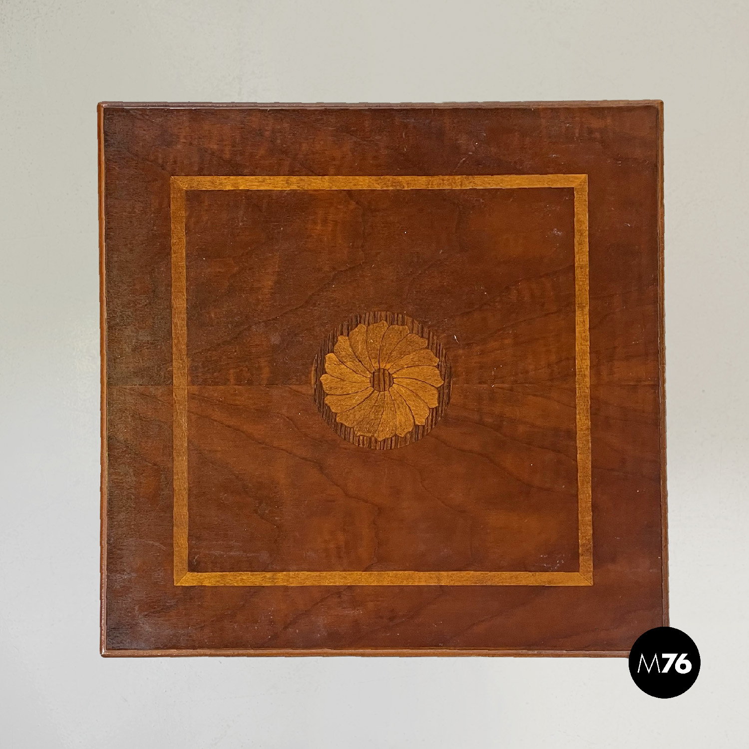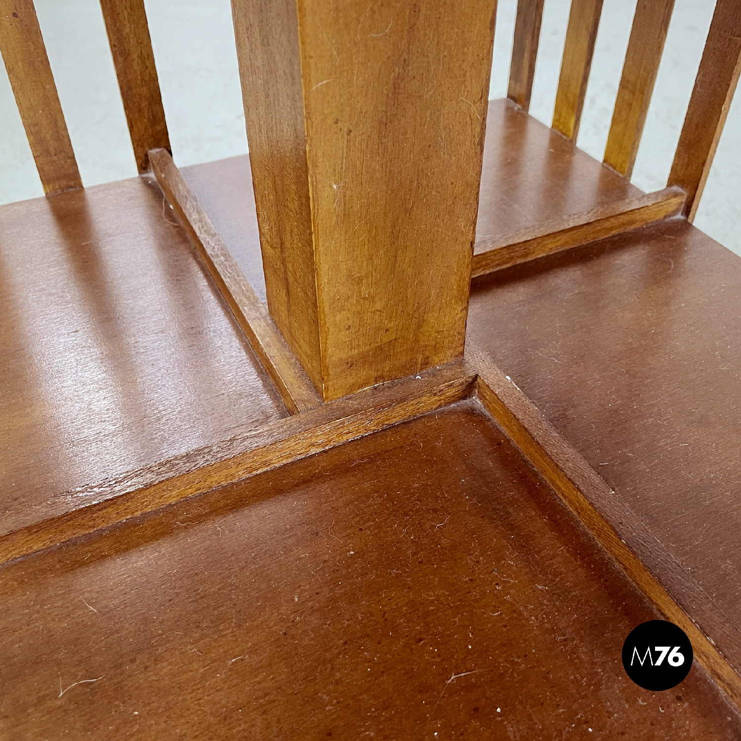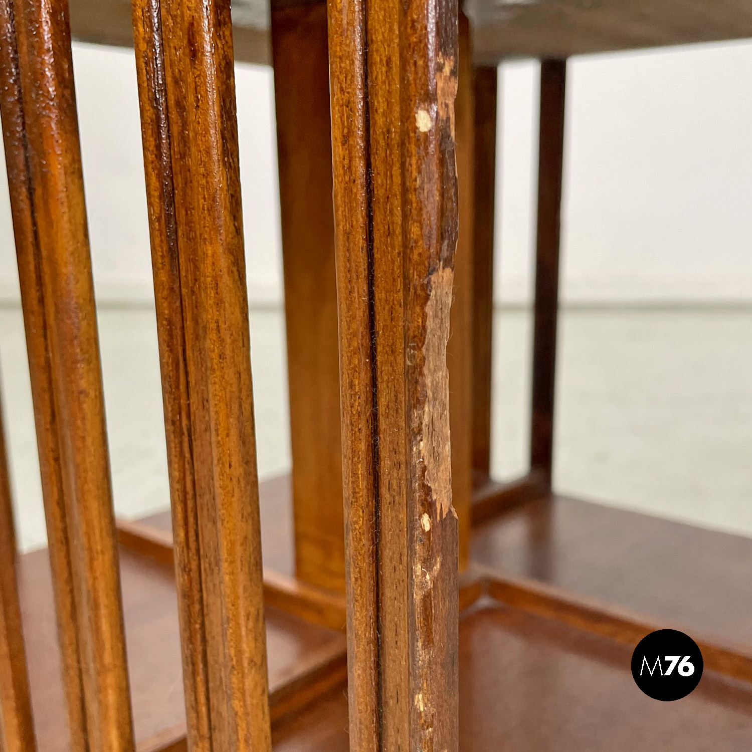 Coppia di librerie girevoli a base quadrata interamente in legno. La struttura presenta un perno centrale, i due ripiani sono uniti da una serie di listelli di legno verticali paralleli. Sui ripiani si trovano quattro listelli che fanno da divisori. Sul piano superiore è presente una decorazione floreale. Utilizzabili anche come comodini o tavoli da caffè, possono essere impilati.