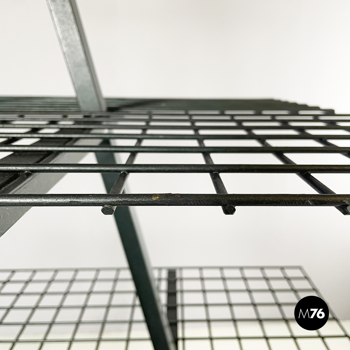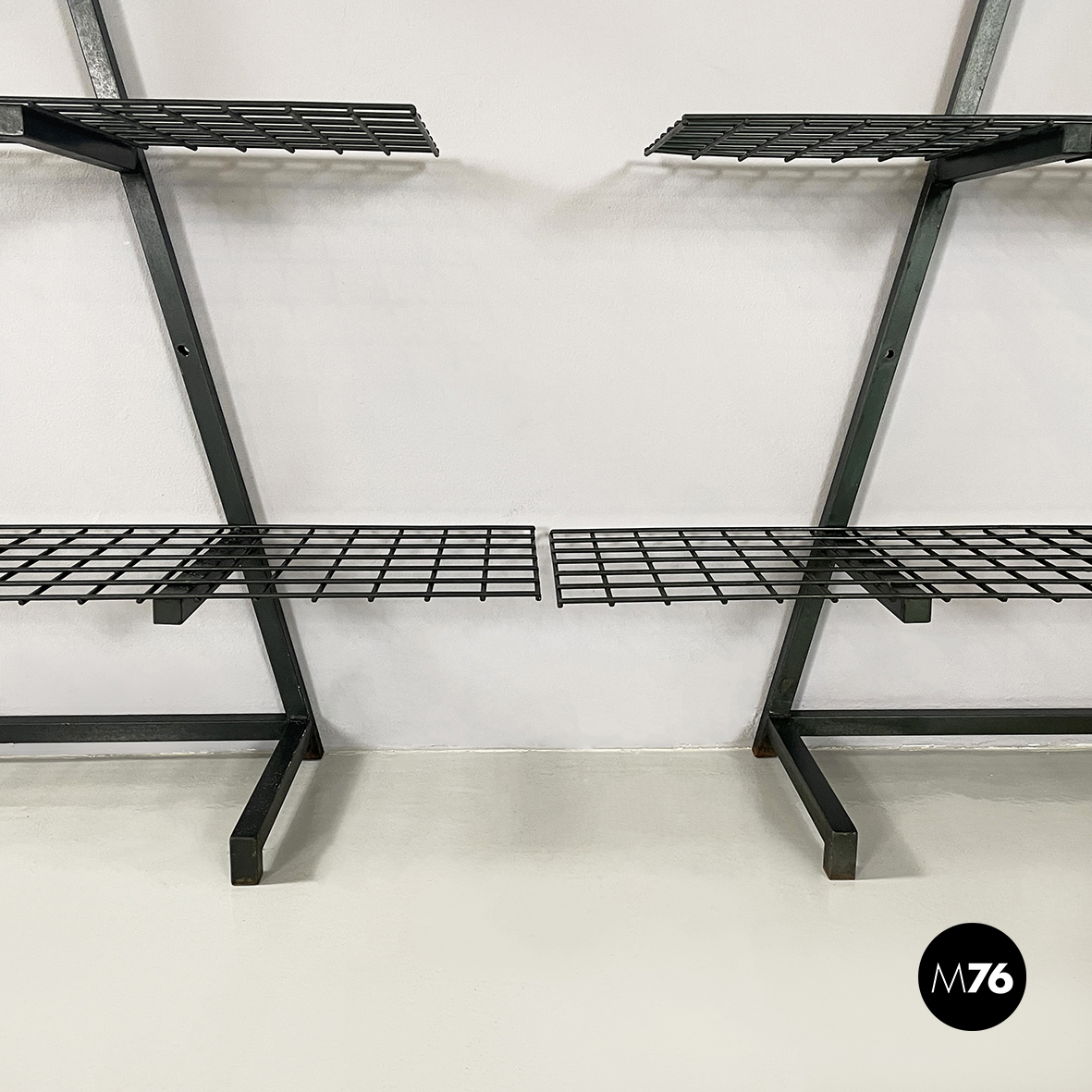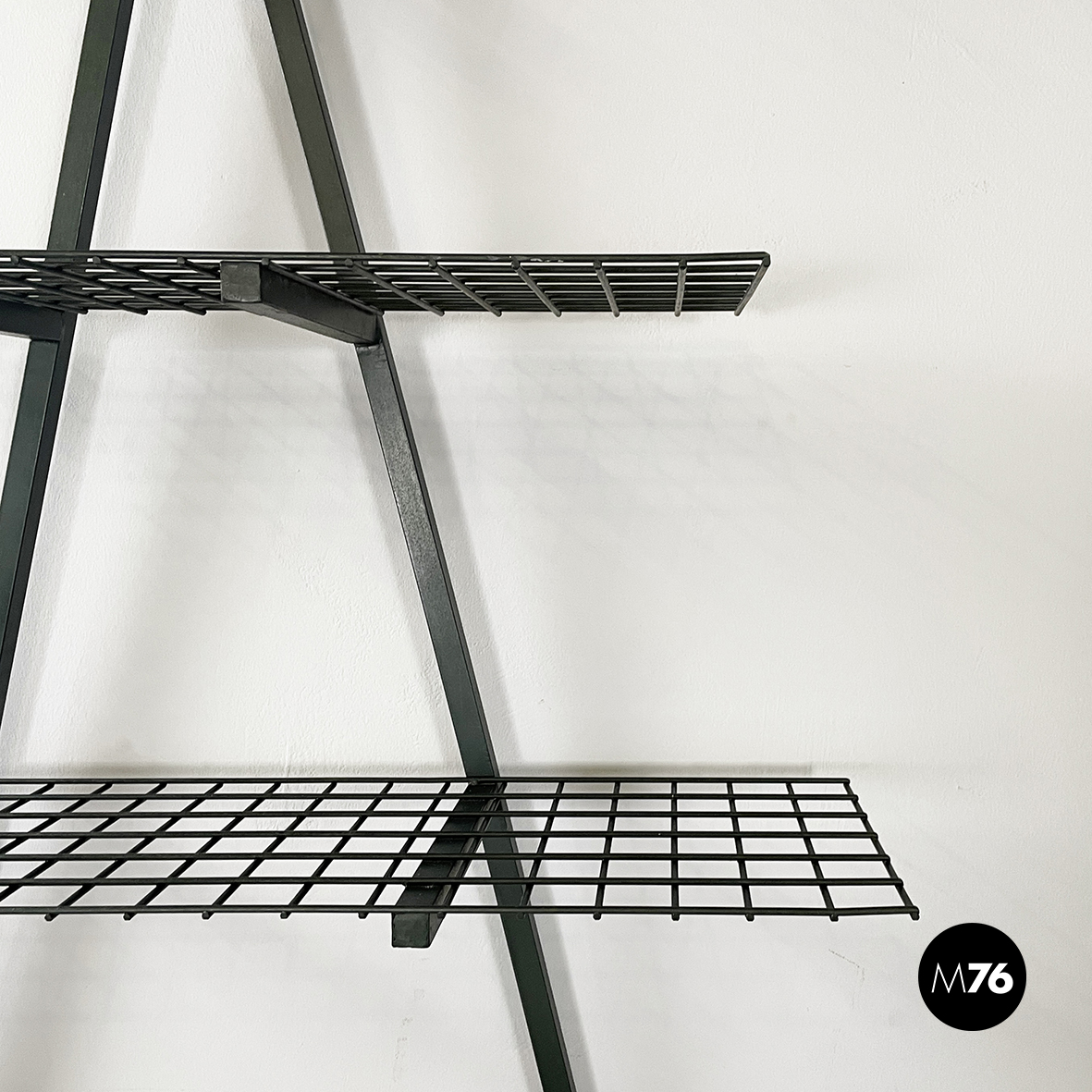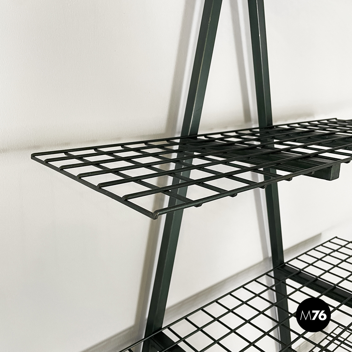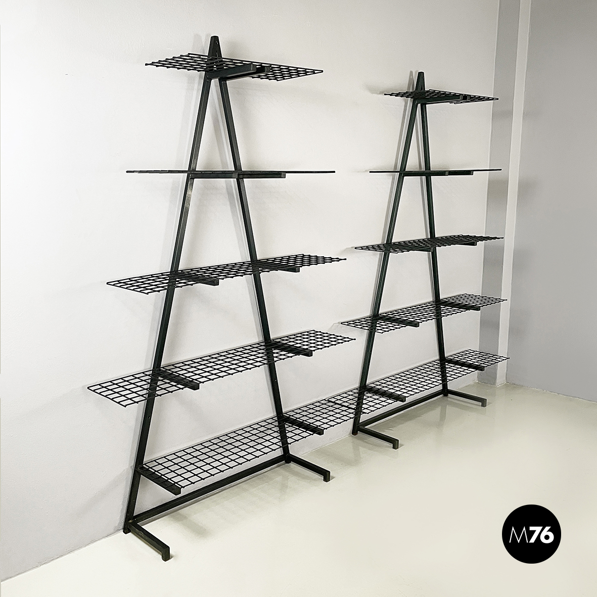 Coppia di librerie da parete con struttura triangolare in metallo verniciato verde scuro. Ogni libreria presenta 5 ripiani in rete metallica verniciata anche essa in verde scuro. Le due librerie possono essere unite, formando un unica libreria autoportante.