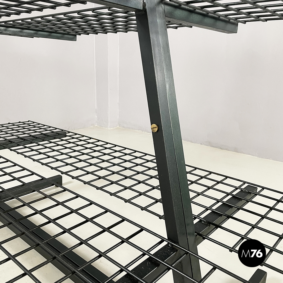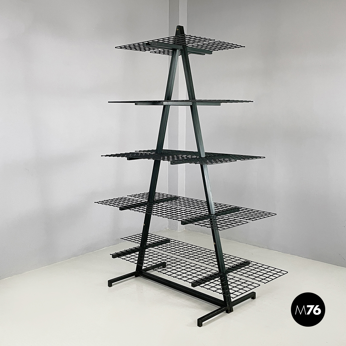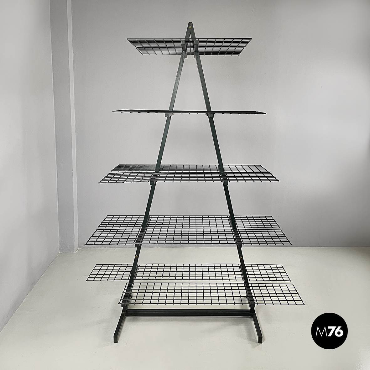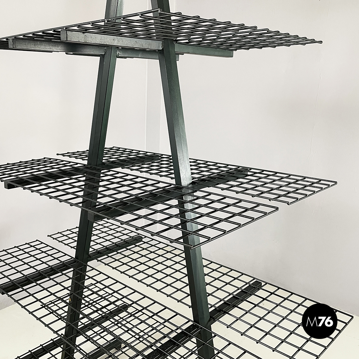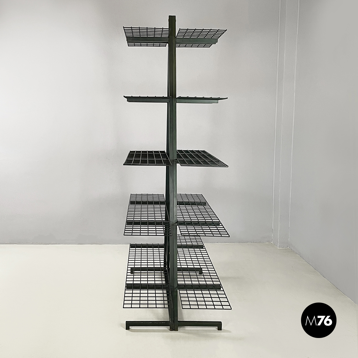 Coppia di librerie da parete con struttura triangolare in metallo verniciato verde scuro. Ogni libreria presenta 5 ripiani in rete metallica verniciata anche essa in verde scuro. Le due librerie possono essere unite, formando un unica libreria autoportante.