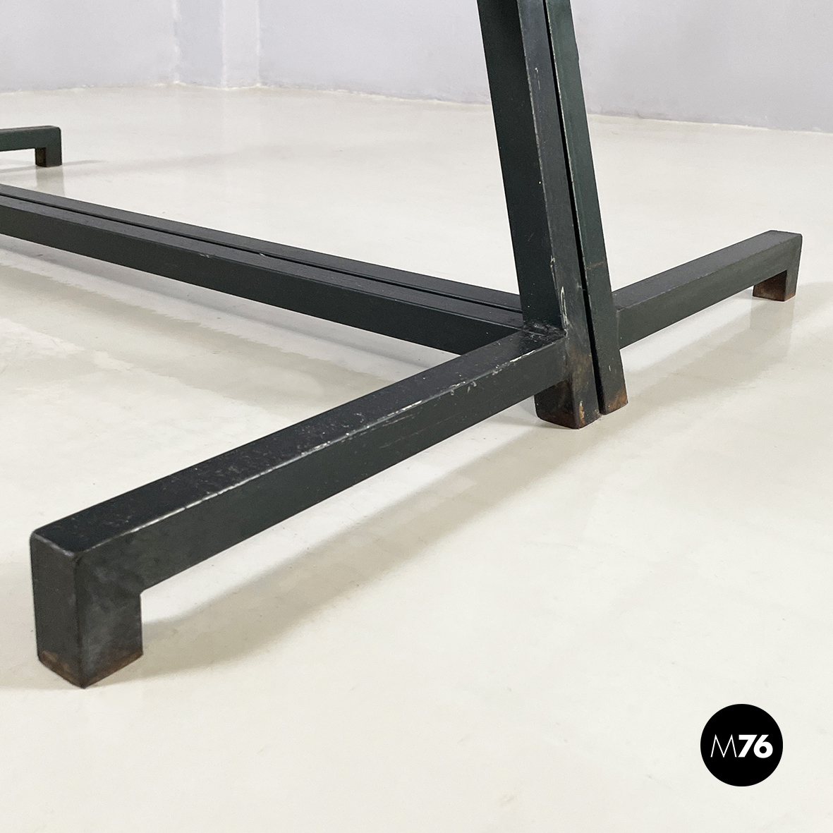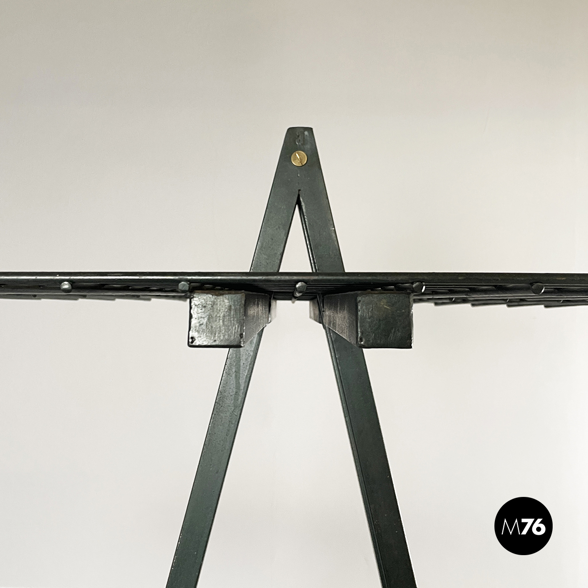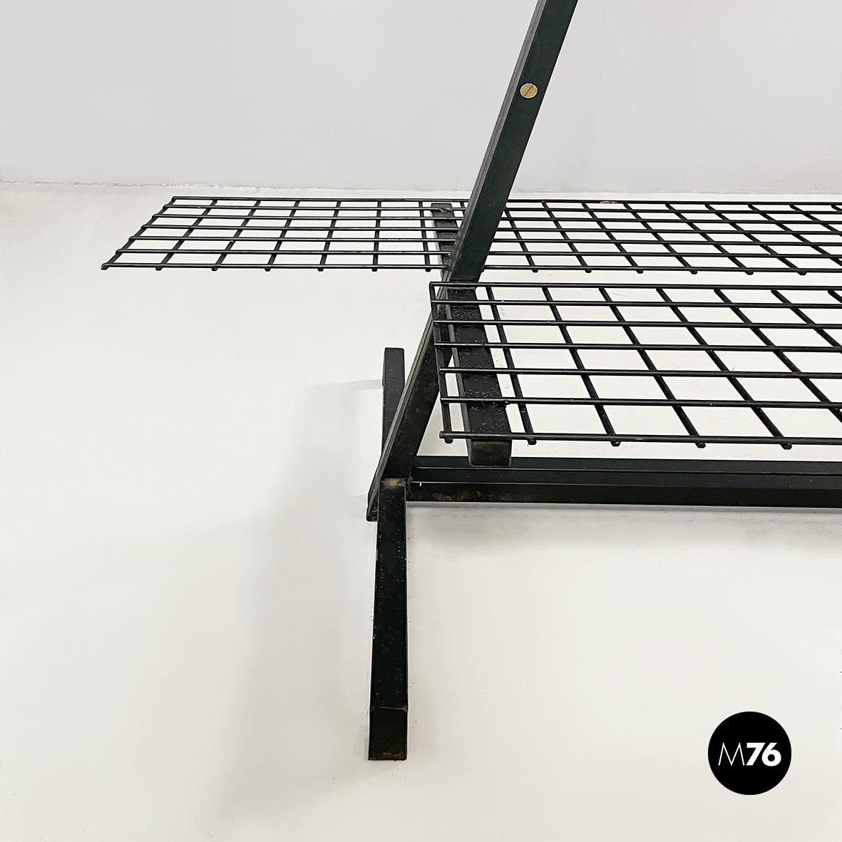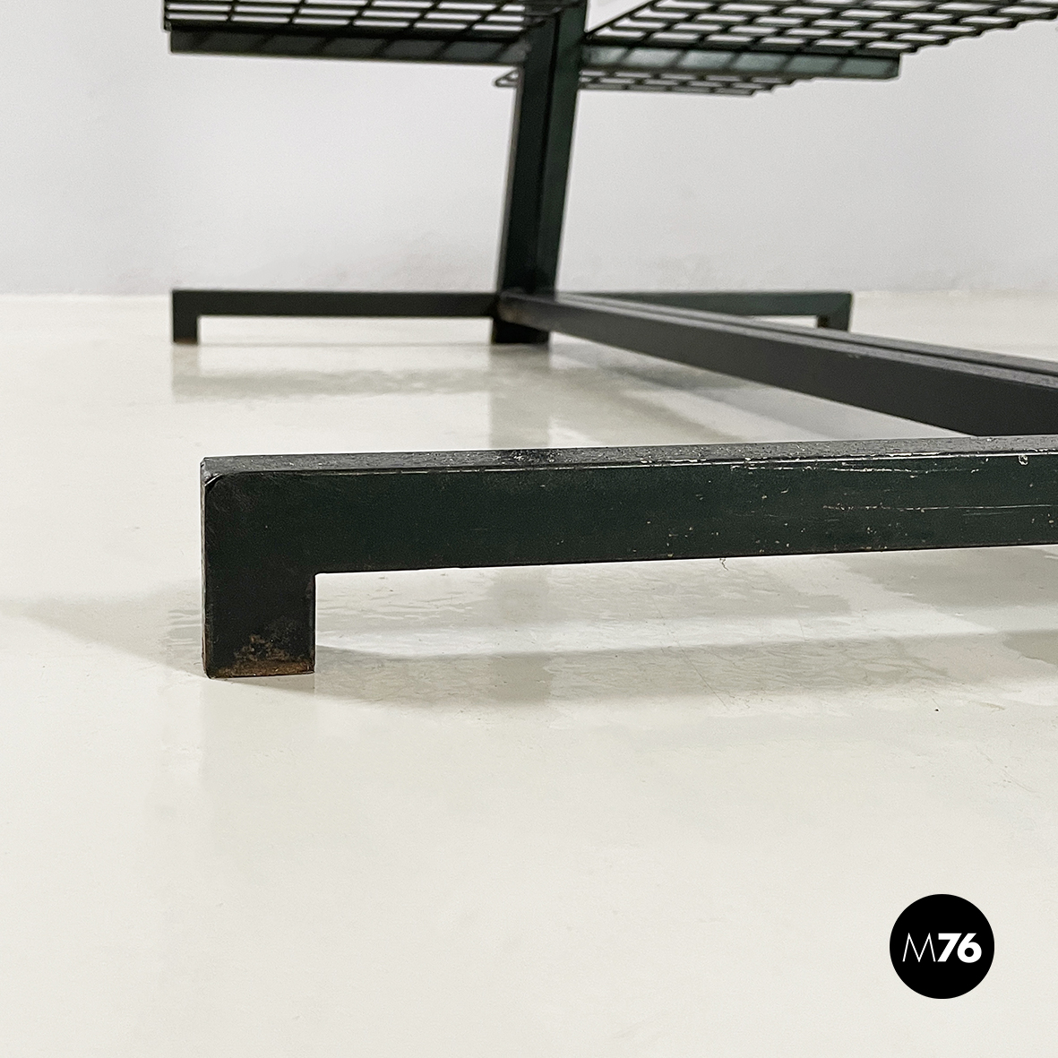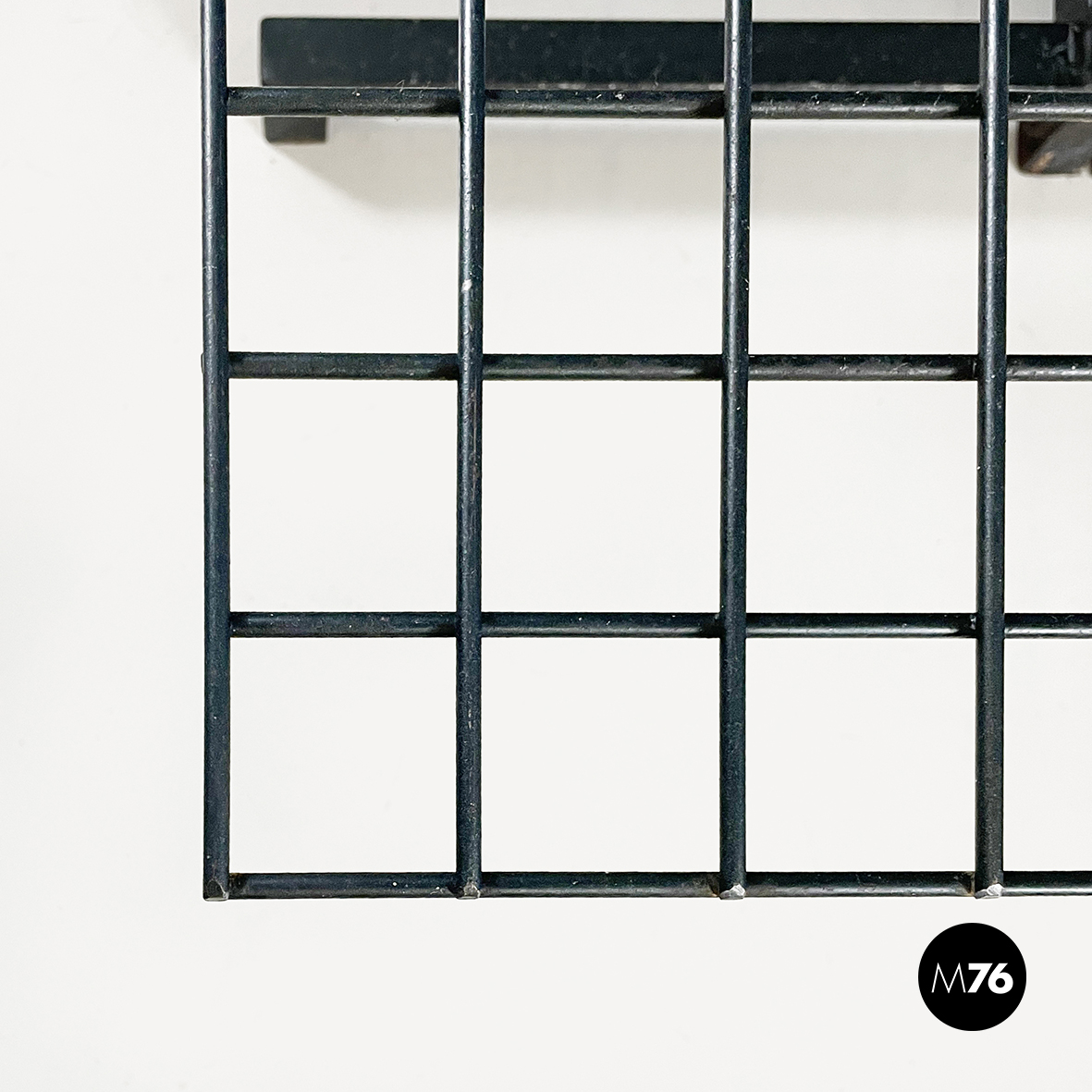 Coppia di librerie da parete con struttura triangolare in metallo verniciato verde scuro. Ogni libreria presenta 5 ripiani in rete metallica verniciata anche essa in verde scuro. Le due librerie possono essere unite, formando un unica libreria autoportante.