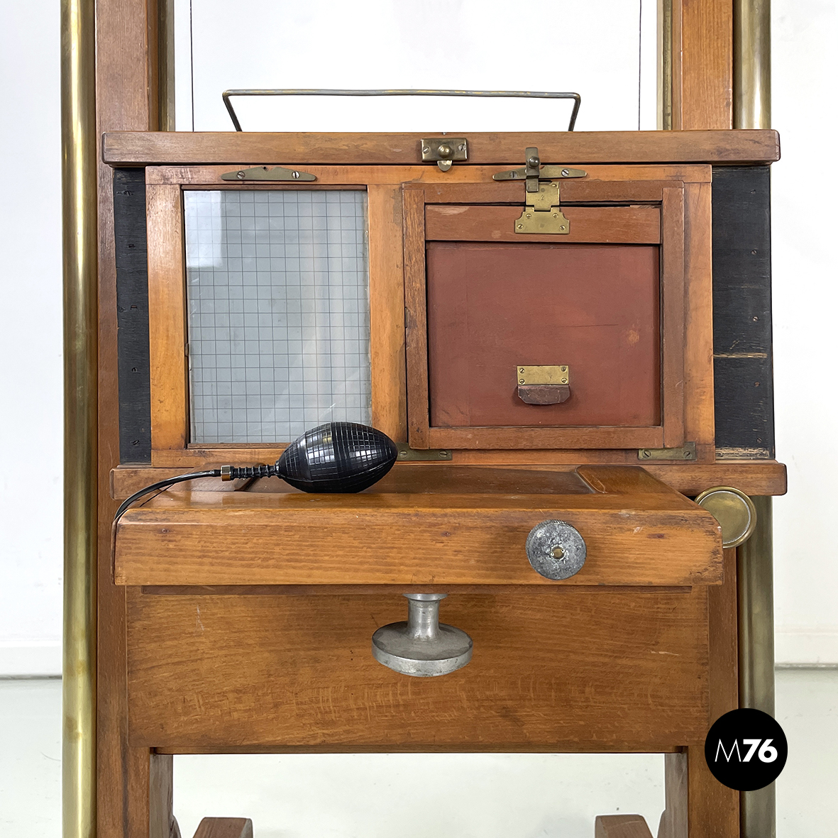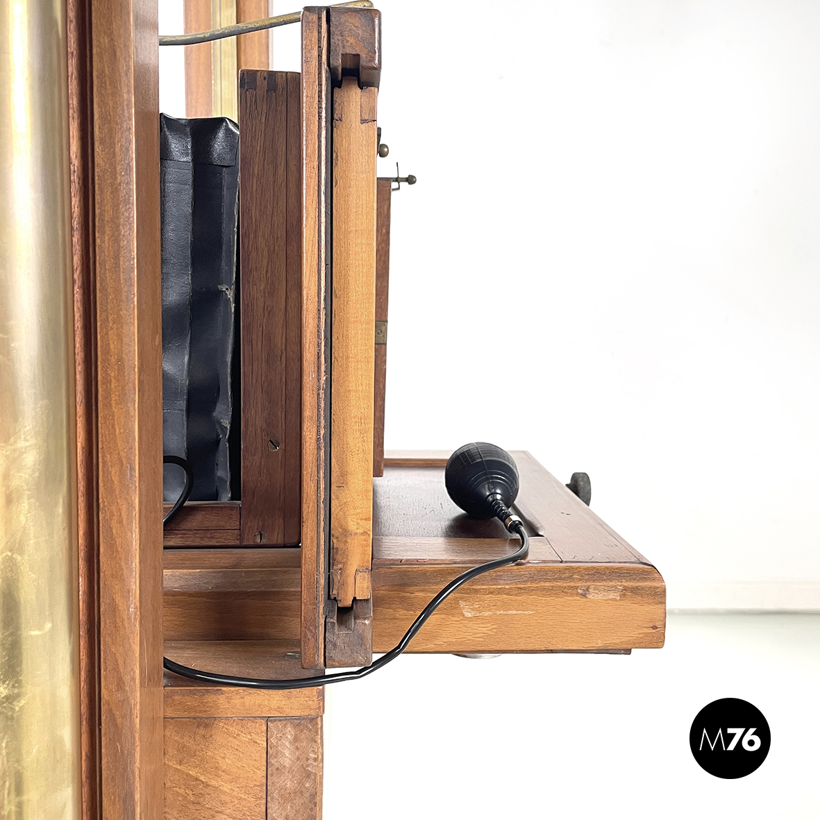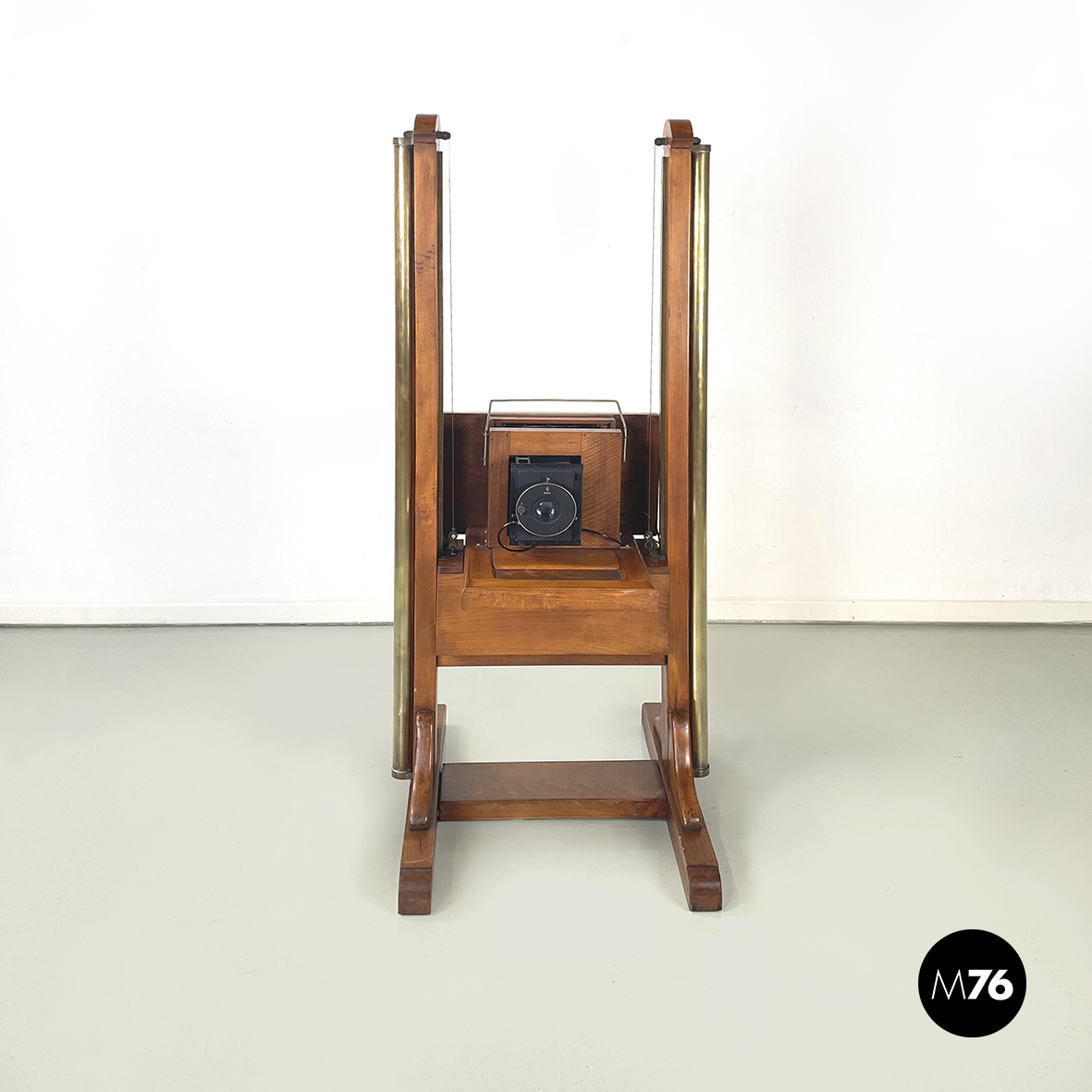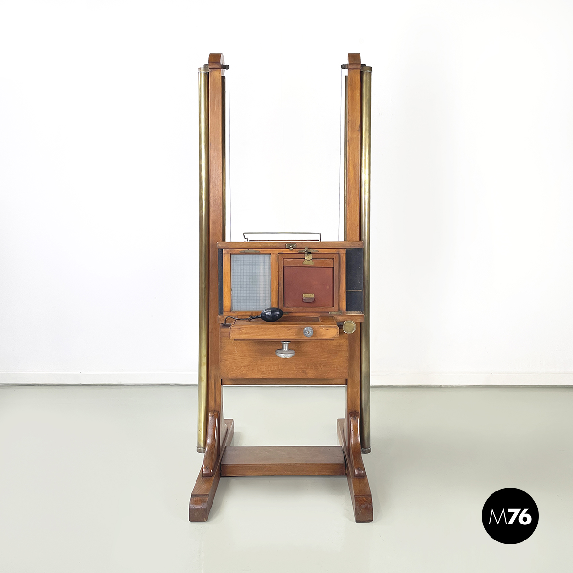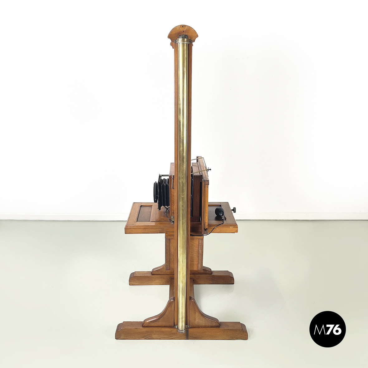 Macchina fotografica analogica da terra in legno e ottone. La struttura è composta da due montanti in legno massello con dei cilindri in ottone, i quali permettono attraverso dei cavi sottili all’obiettivo di alzarsi e abbassarsi. Il banco ottico è composto dalla lente posta sul fronte, delle parti in pelle nera e un vano a scorrimento per posizionare la lastra fotografica sul retro. Zampe in legno unite al centro da una trave a sezione rettangolare.