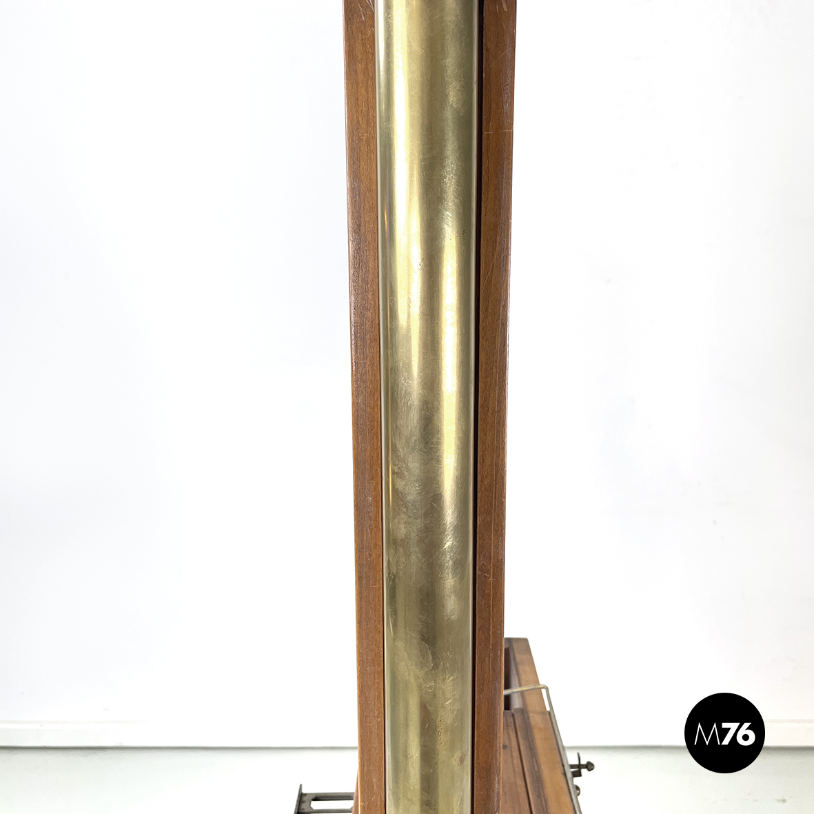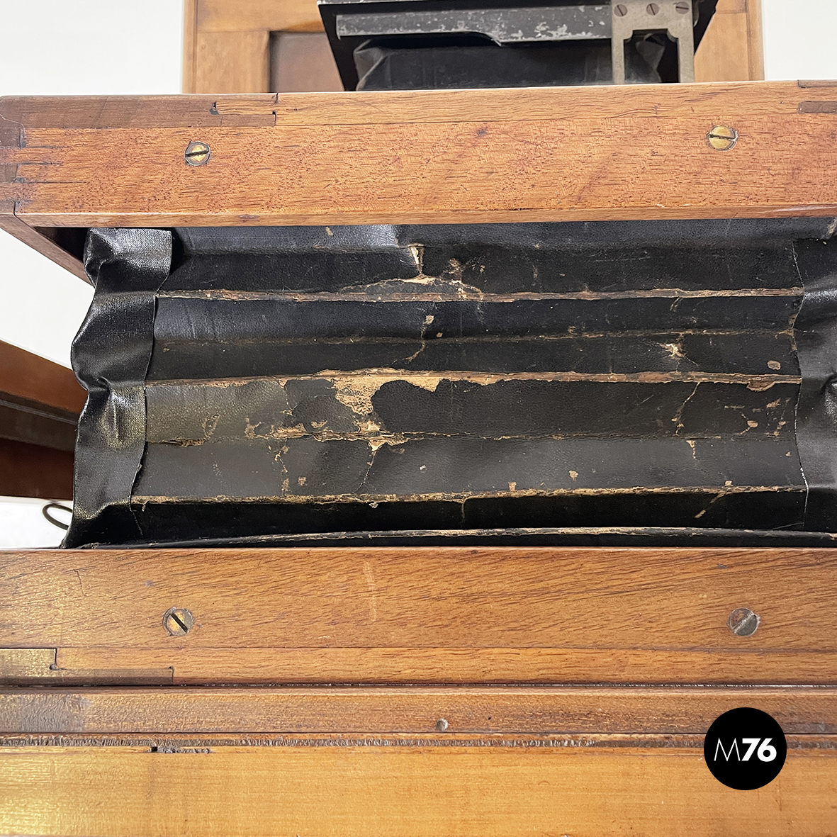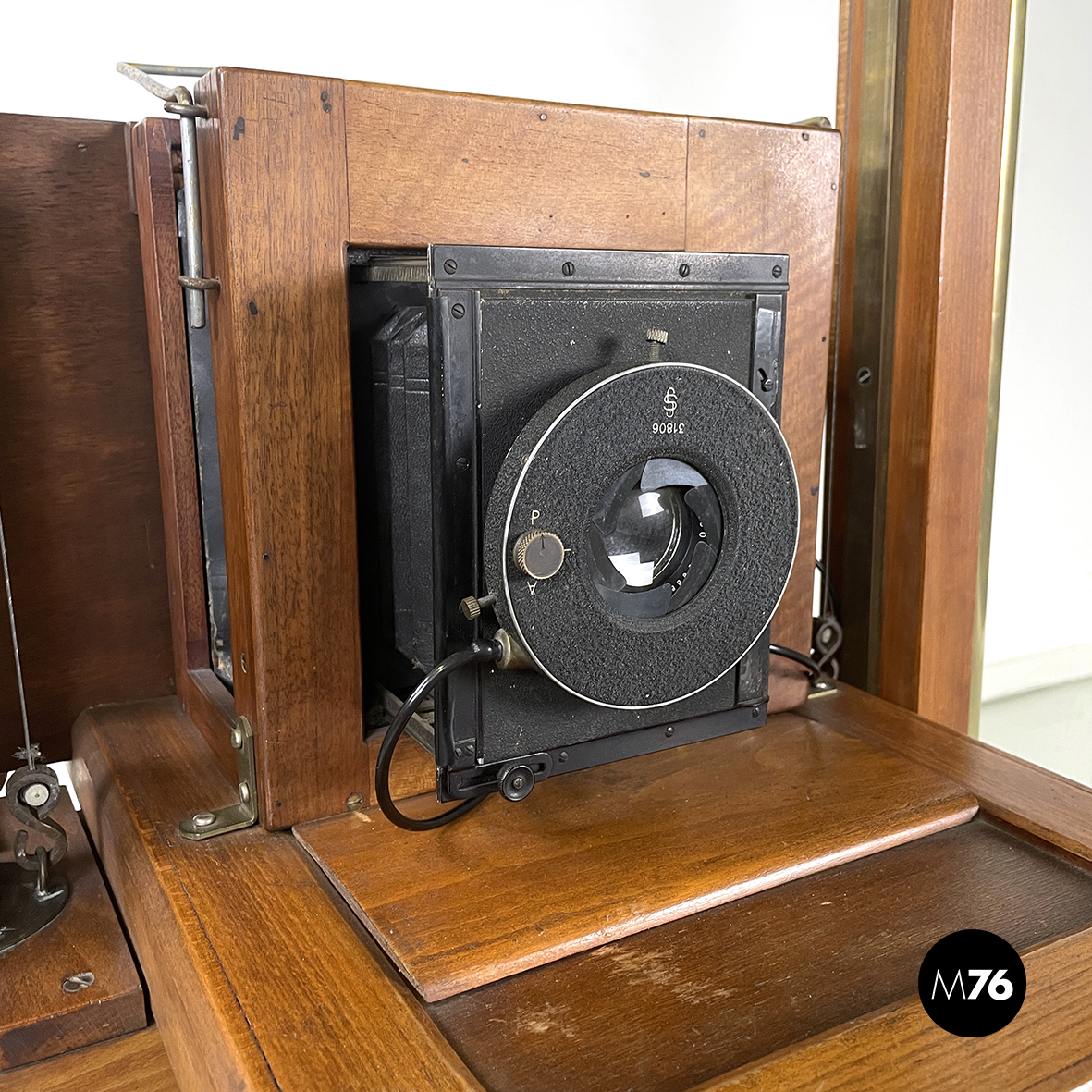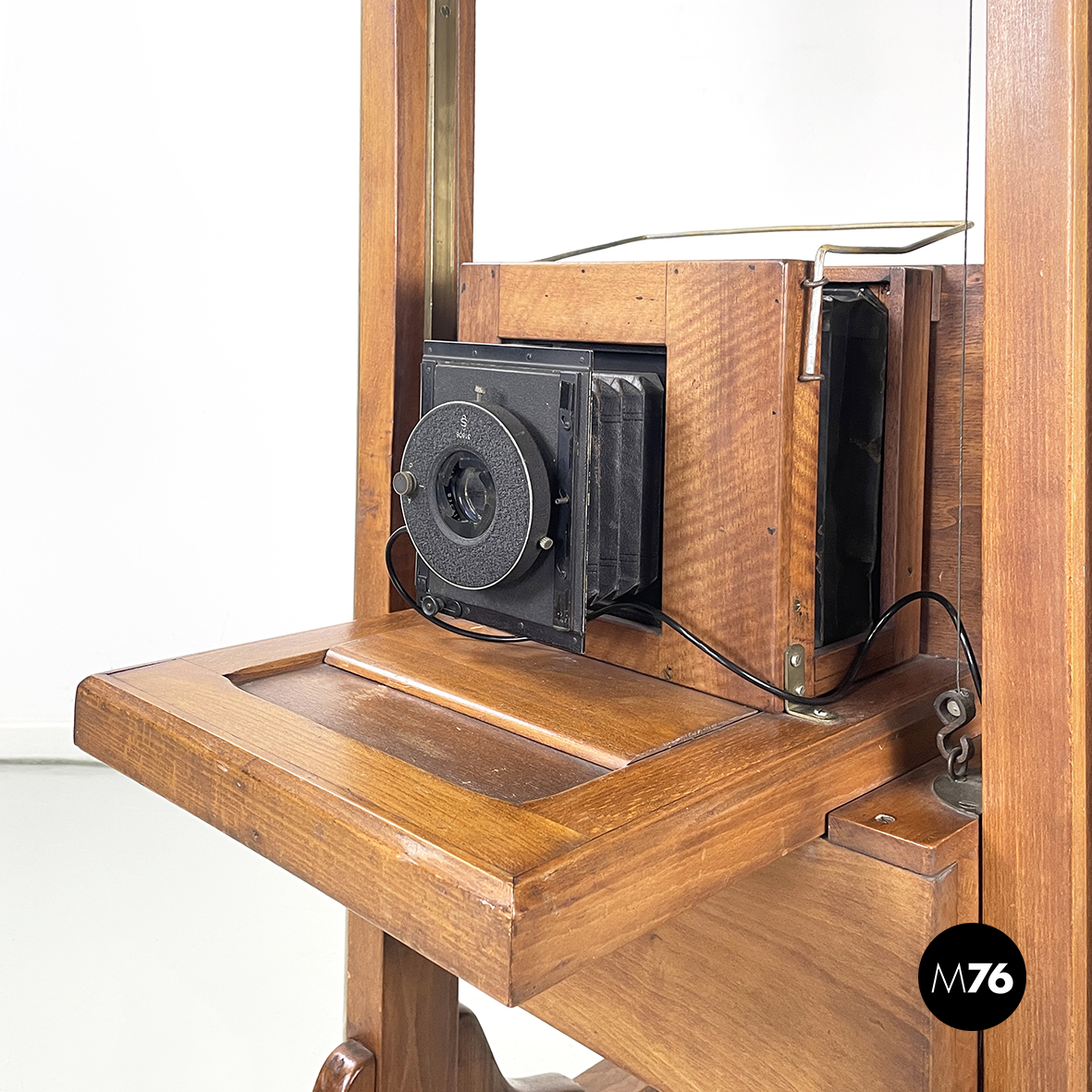 Macchina fotografica analogica da terra in legno e ottone. La struttura è composta da due montanti in legno massello con dei cilindri in ottone, i quali permettono attraverso dei cavi sottili all’obiettivo di alzarsi e abbassarsi. Il banco ottico è composto dalla lente posta sul fronte, delle parti in pelle nera e un vano a scorrimento per posizionare la lastra fotografica sul retro. Zampe in legno unite al centro da una trave a sezione rettangolare.