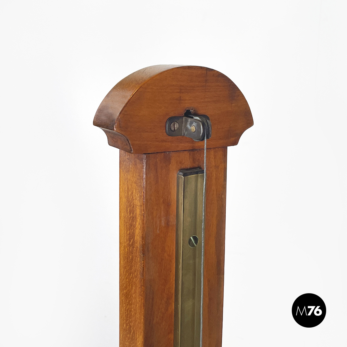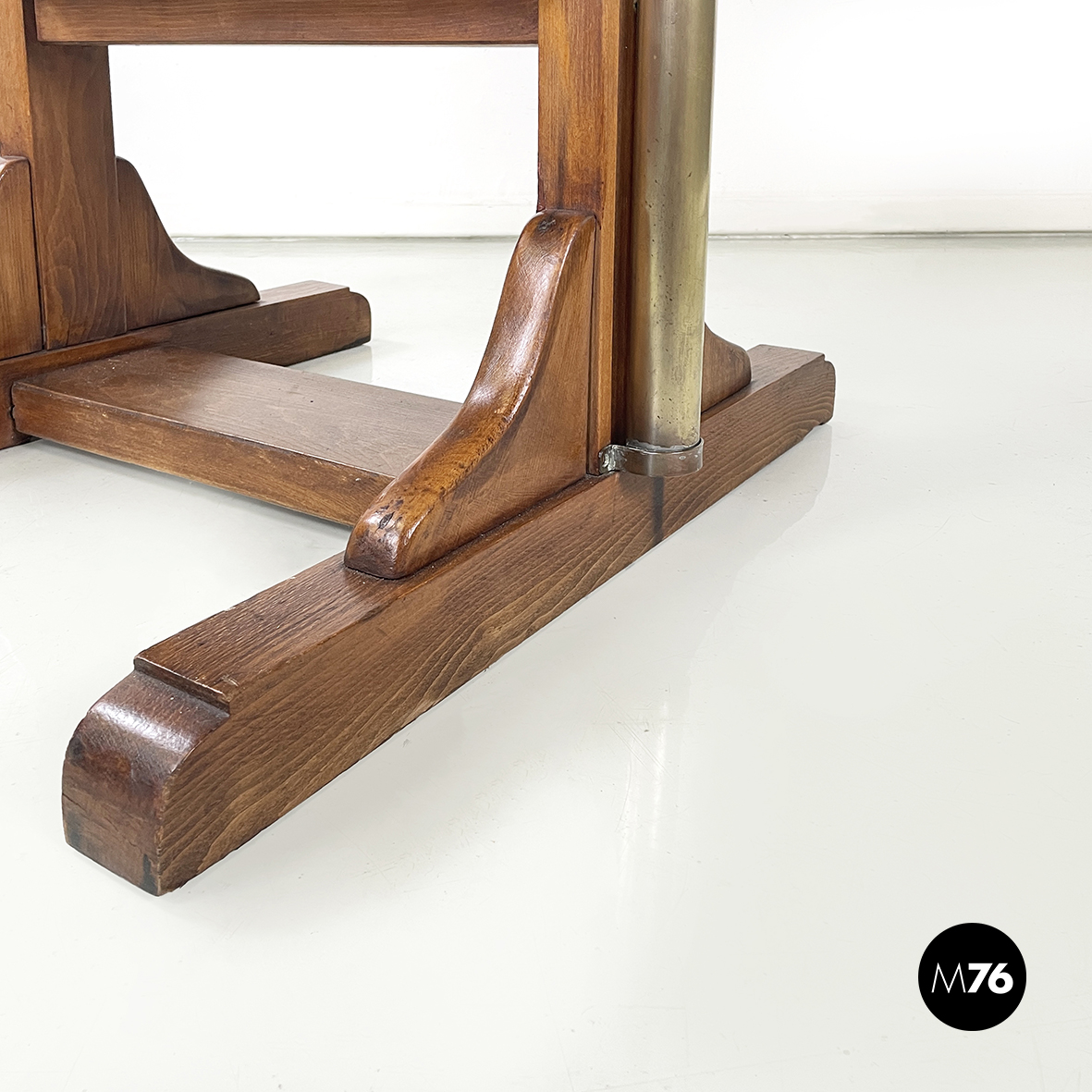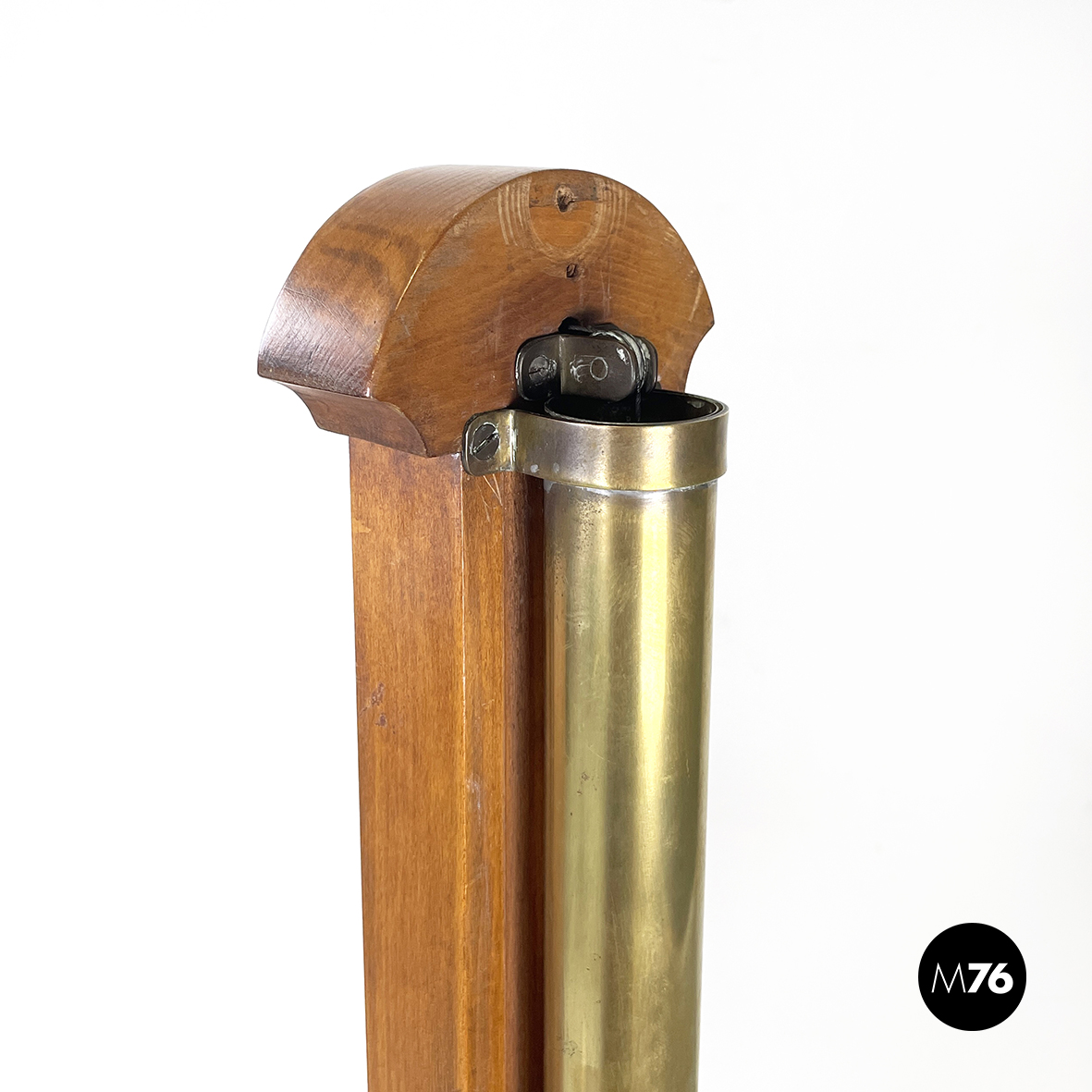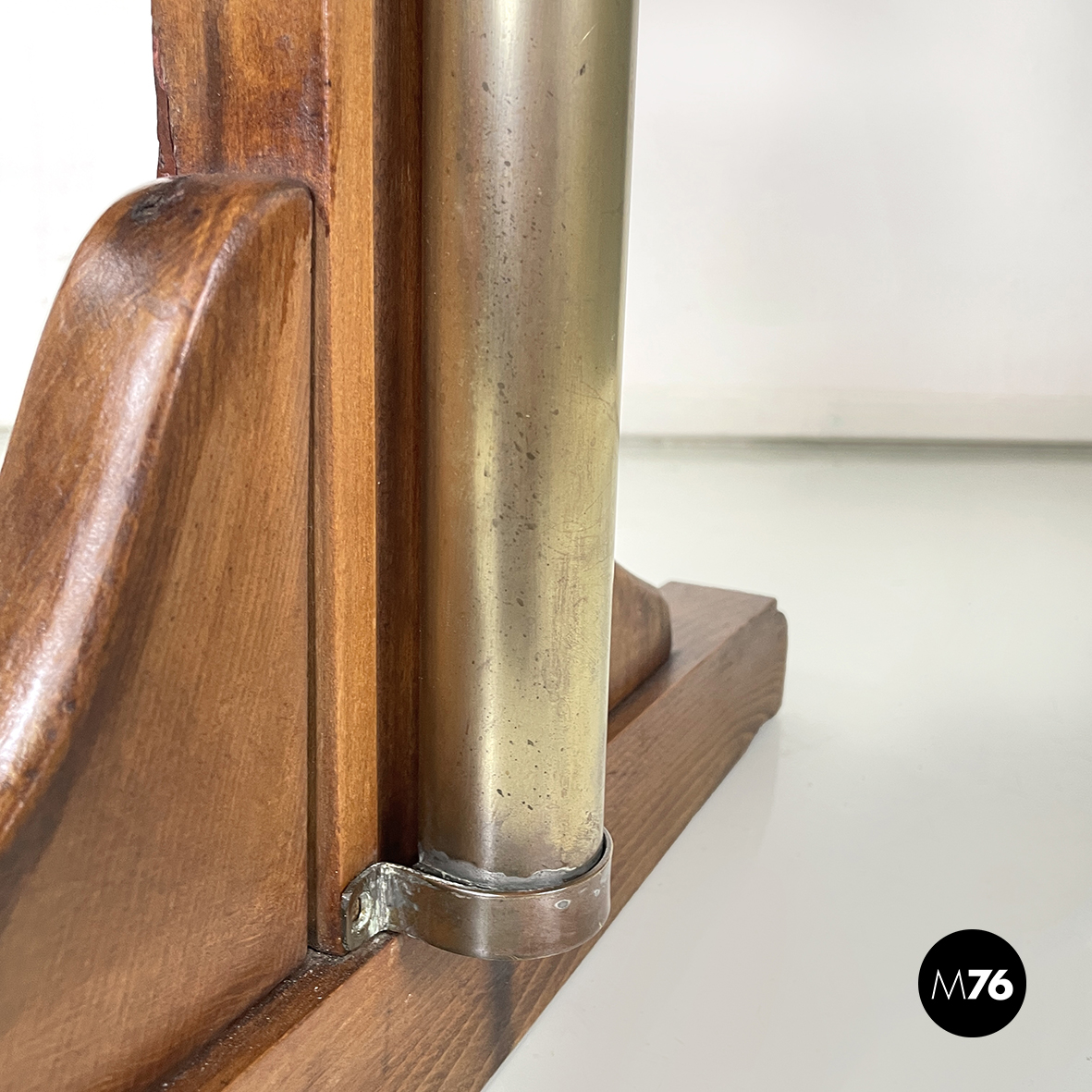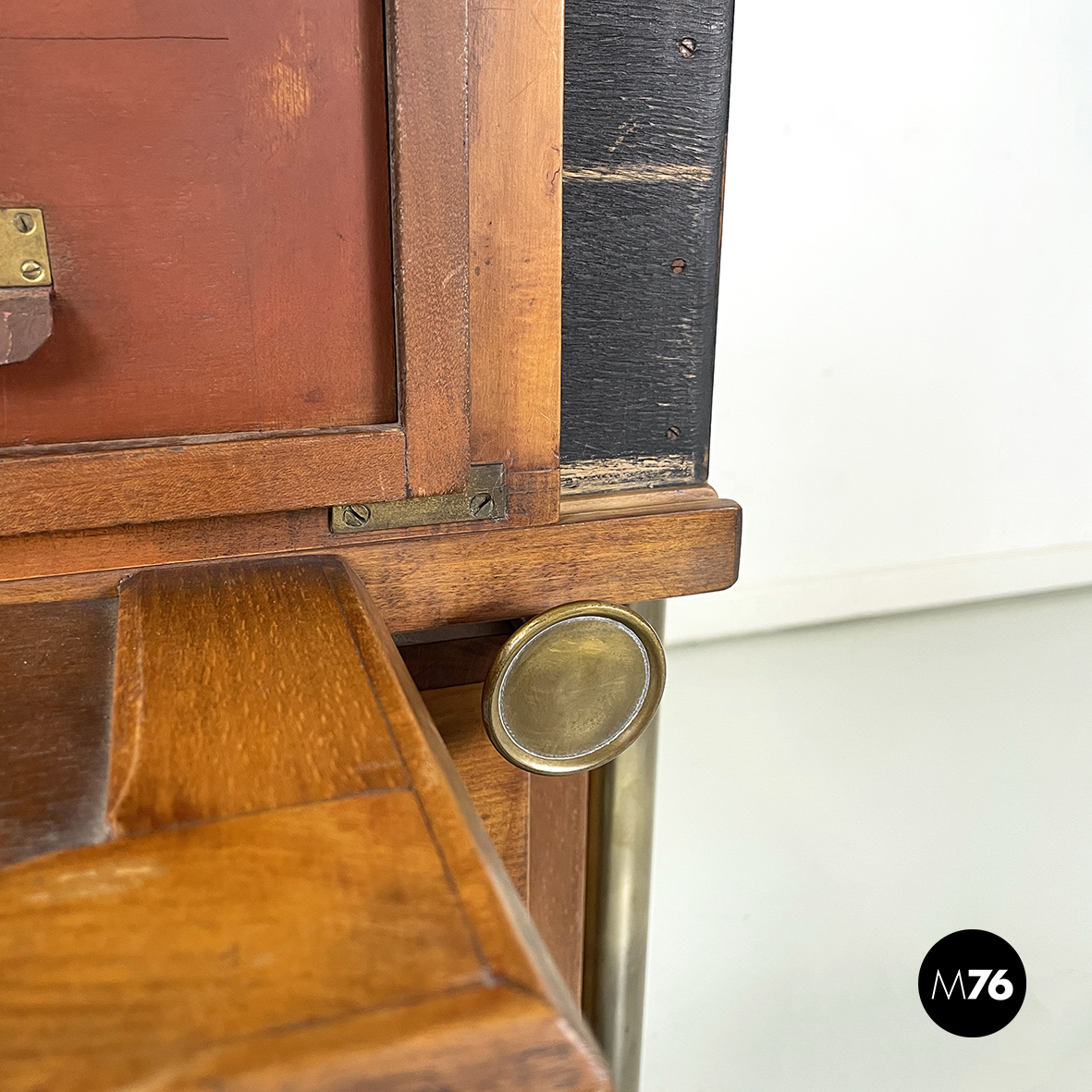 Macchina fotografica analogica da terra in legno e ottone. La struttura è composta da due montanti in legno massello con dei cilindri in ottone, i quali permettono attraverso dei cavi sottili all’obiettivo di alzarsi e abbassarsi. Il banco ottico è composto dalla lente posta sul fronte, delle parti in pelle nera e un vano a scorrimento per posizionare la lastra fotografica sul retro. Zampe in legno unite al centro da una trave a sezione rettangolare.
