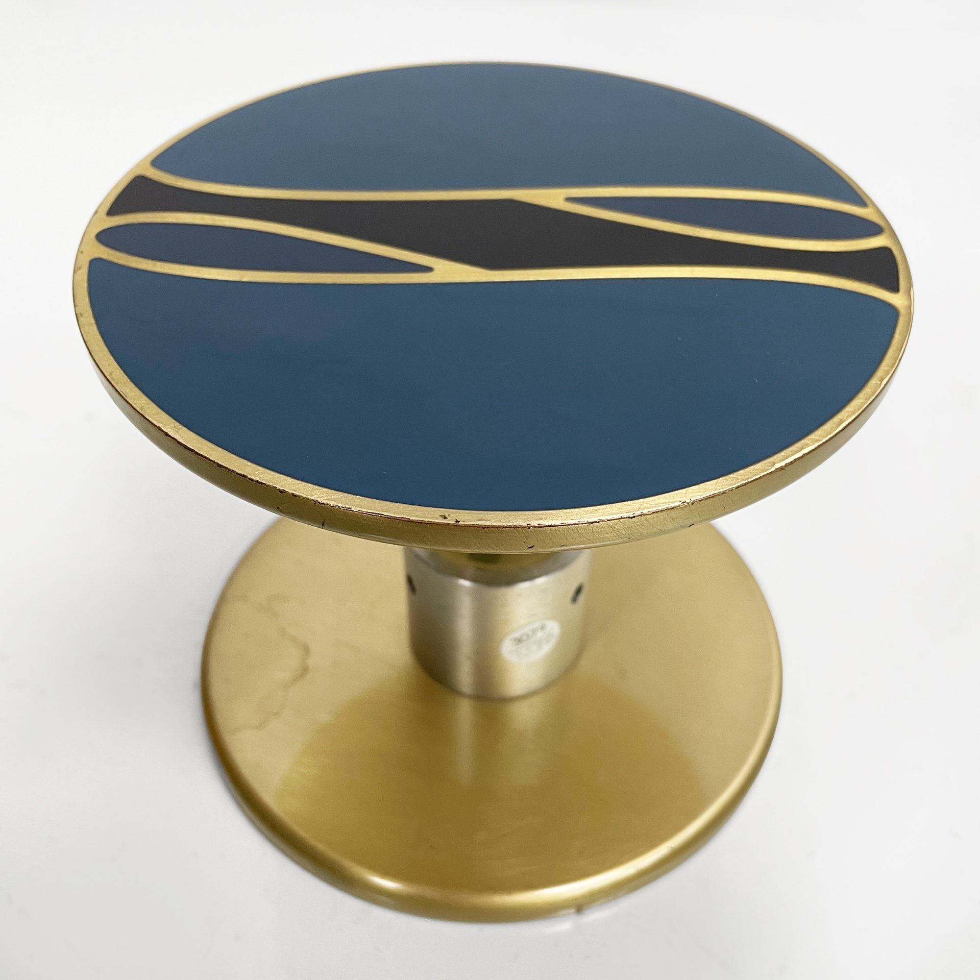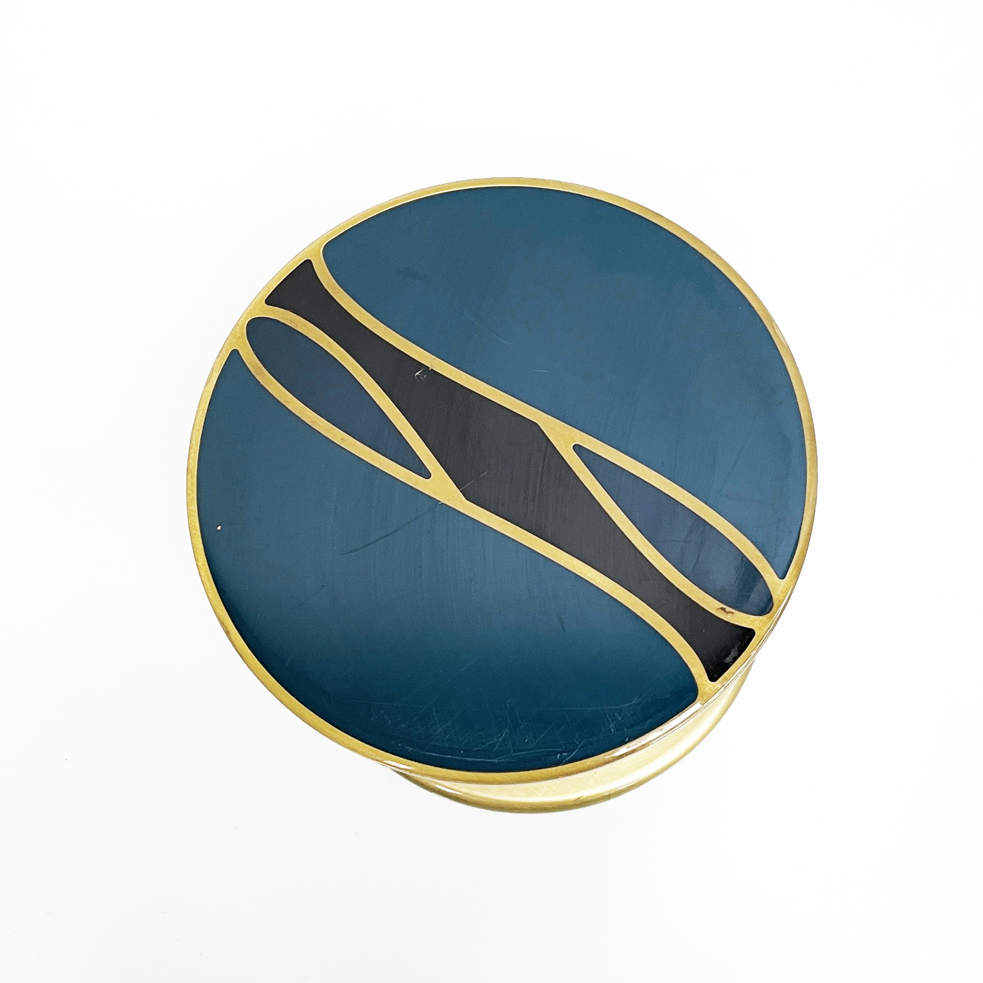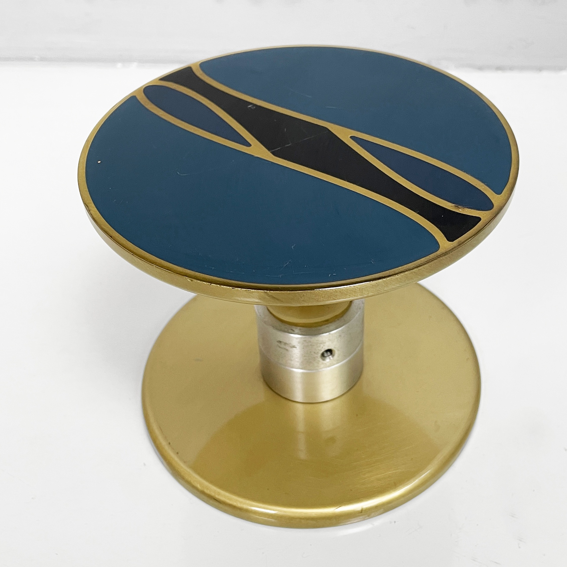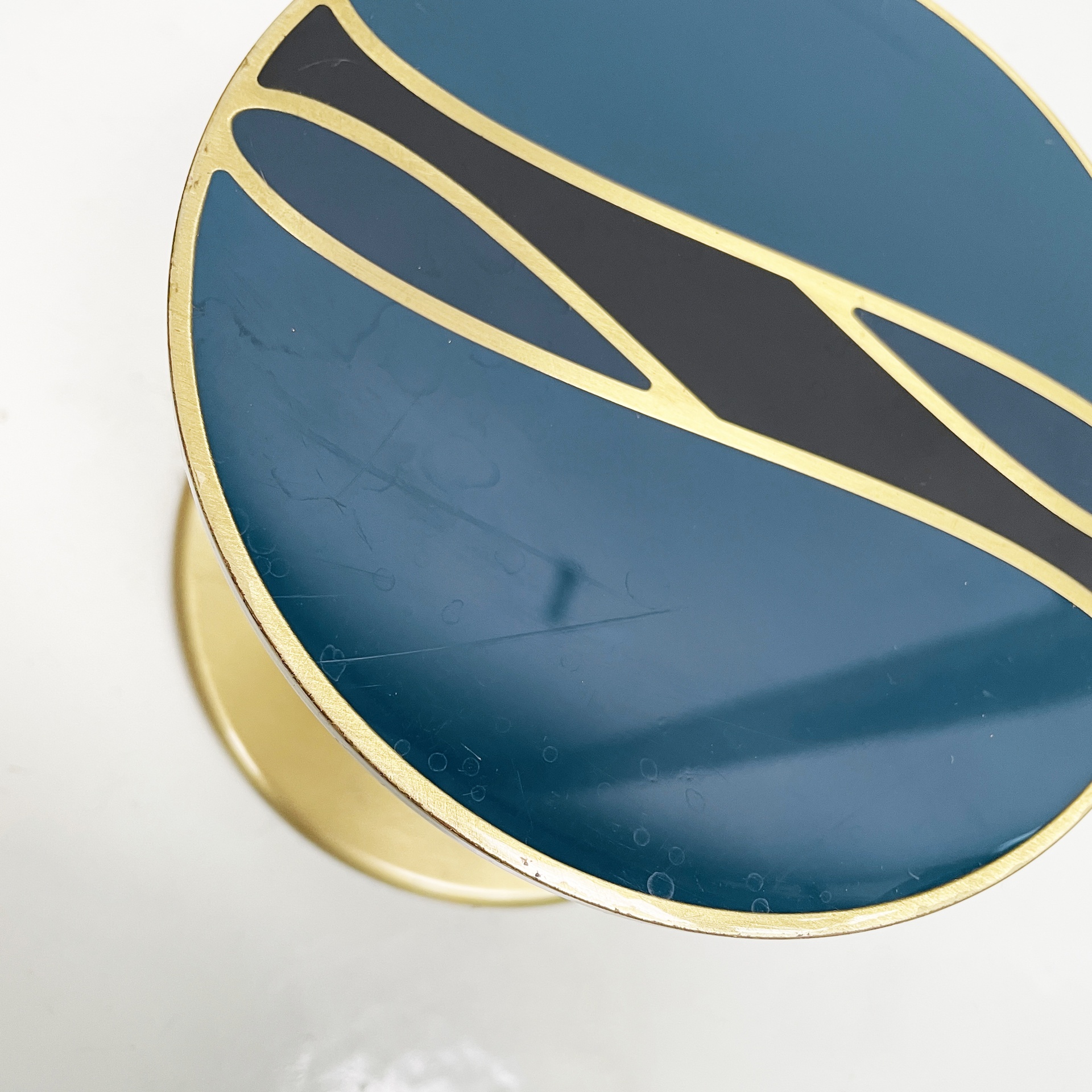 Maniglia tonda in alluminio anodizzato e smaltato. Sui lati è presente una decorazione in blu, oro e nero.
