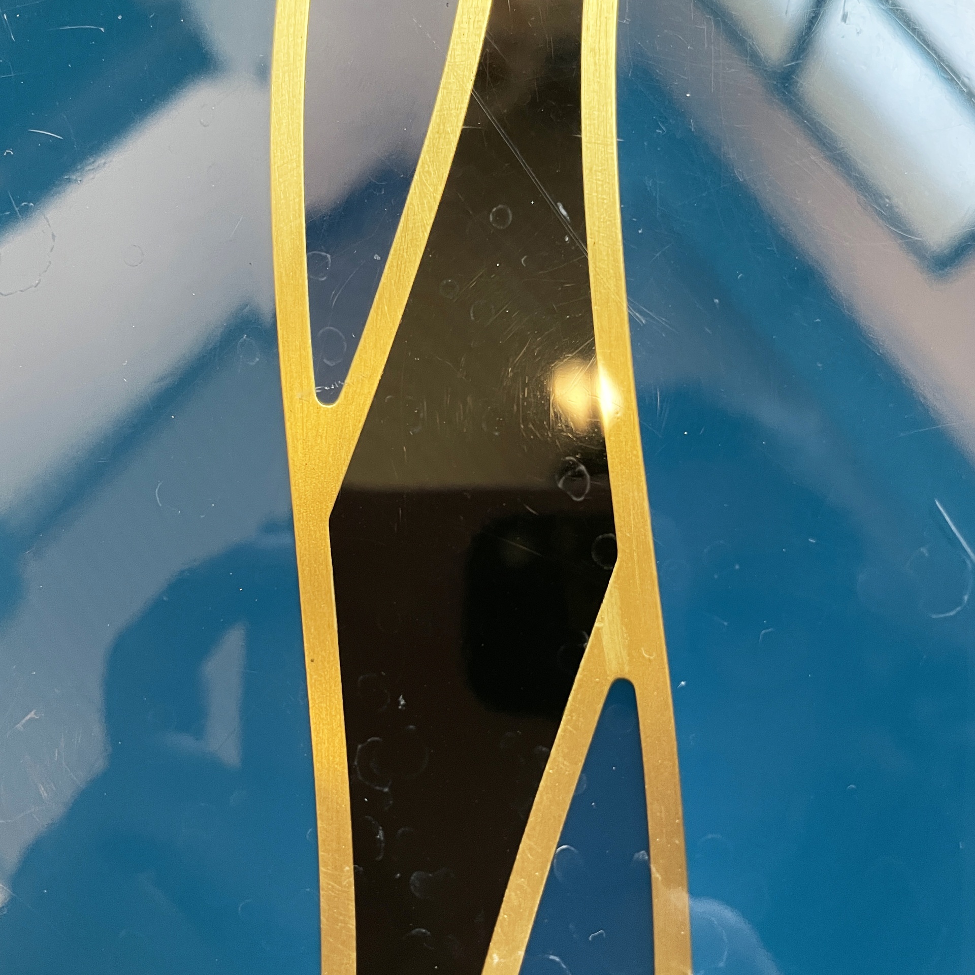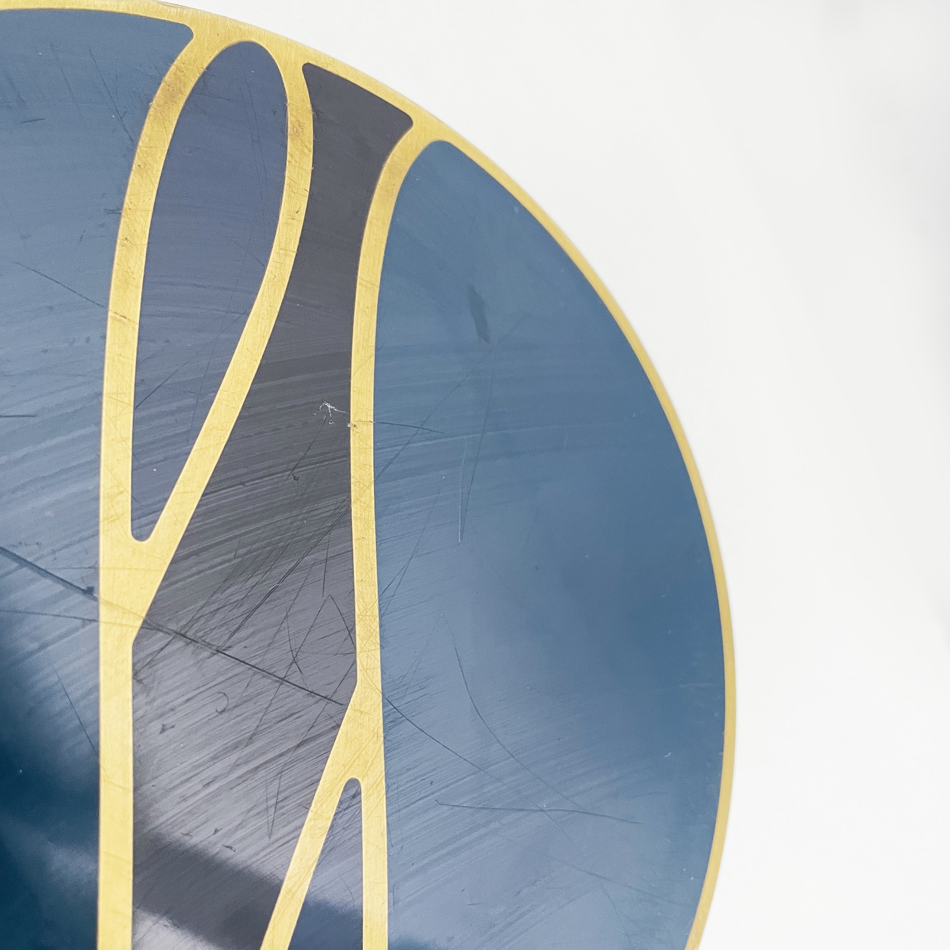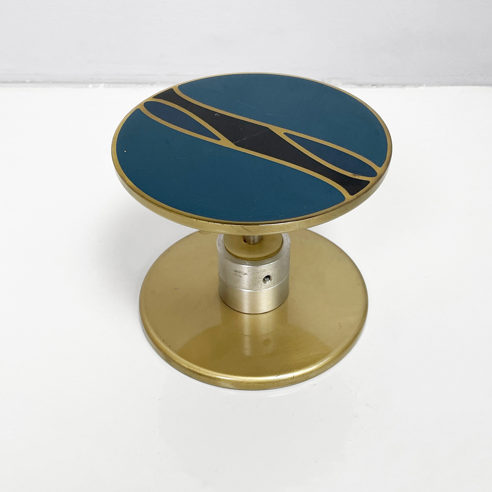Maniglia tonda in alluminio anodizzato e smaltato. Sui lati è presente una decorazione in blu, oro e nero.