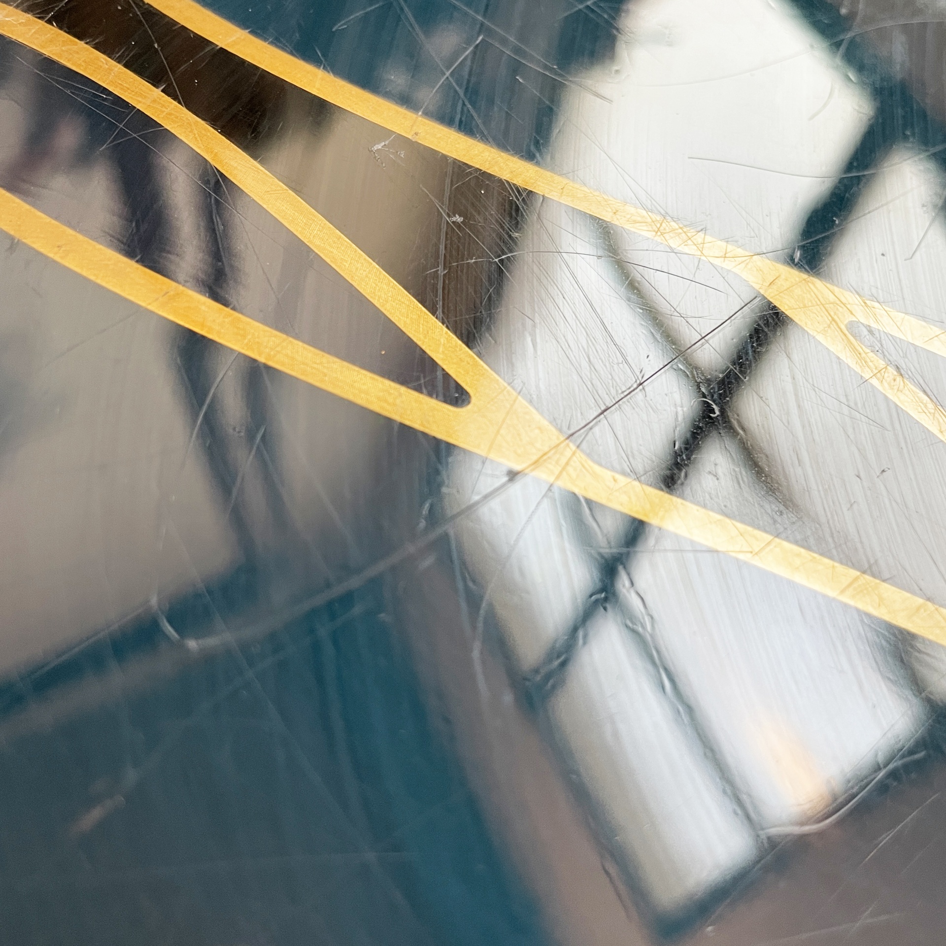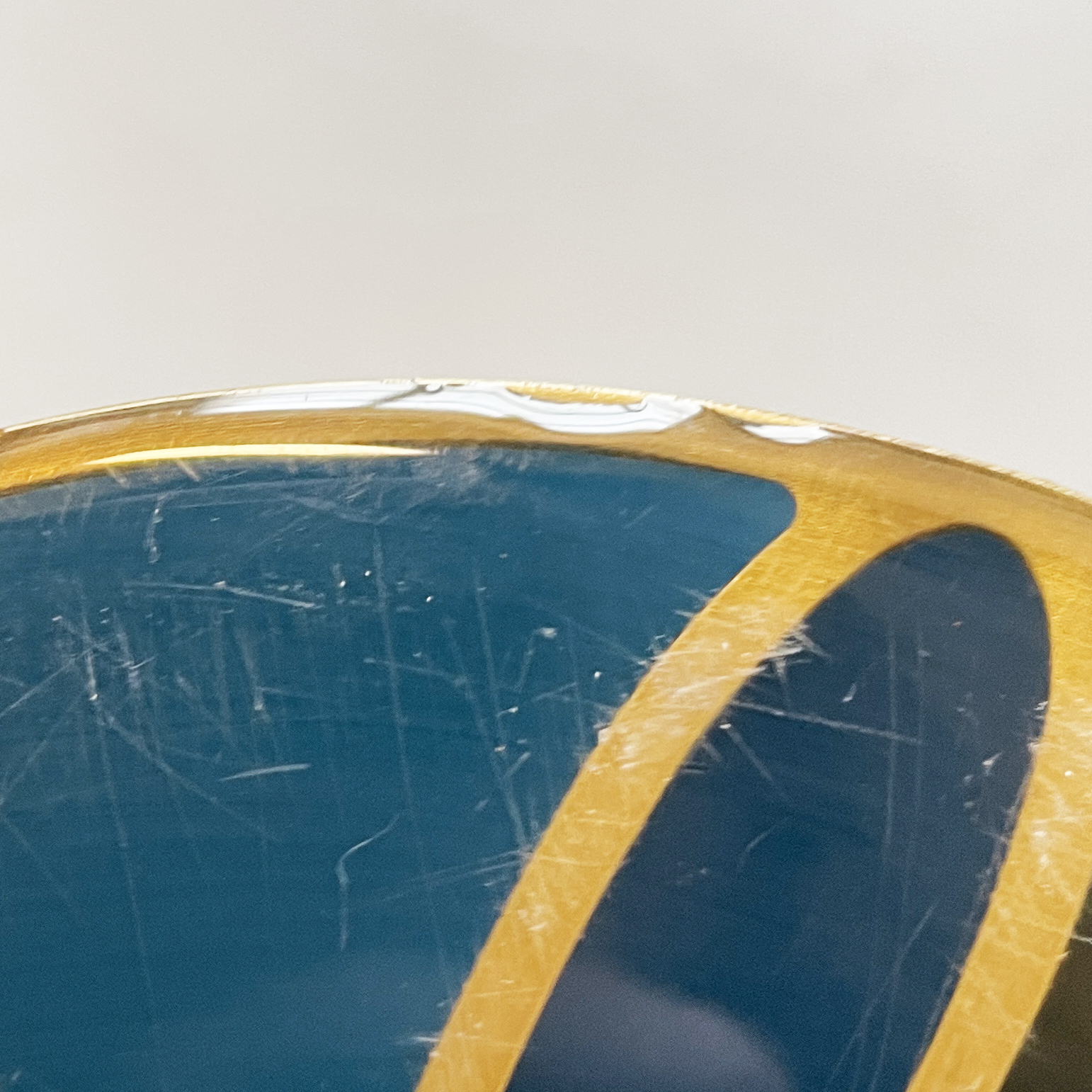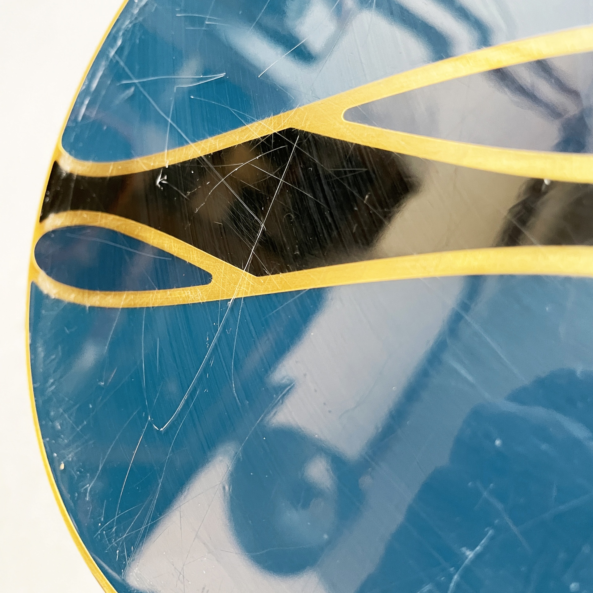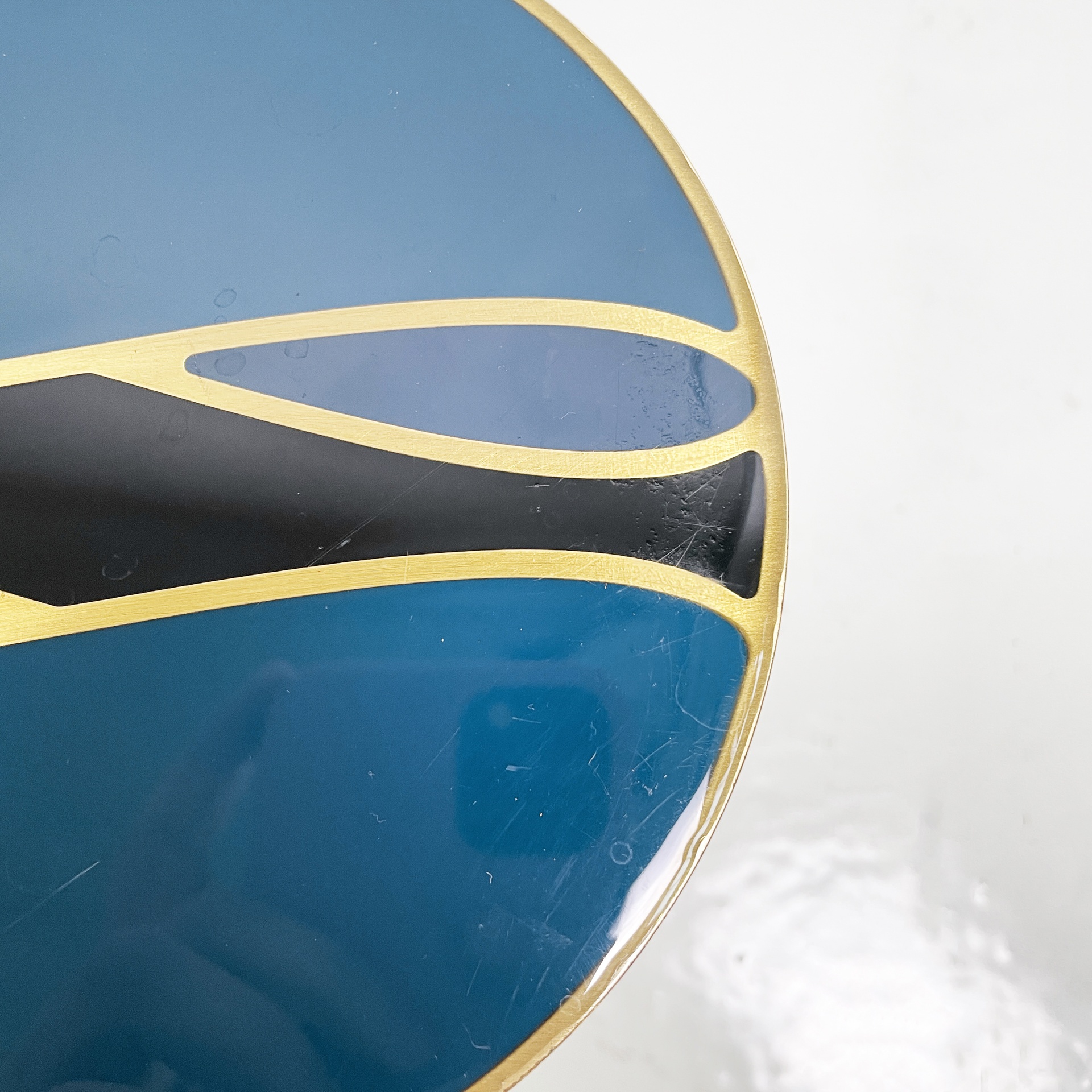 Maniglia tonda in alluminio anodizzato e smaltato. Sui lati è presente una decorazione in blu, oro e nero.