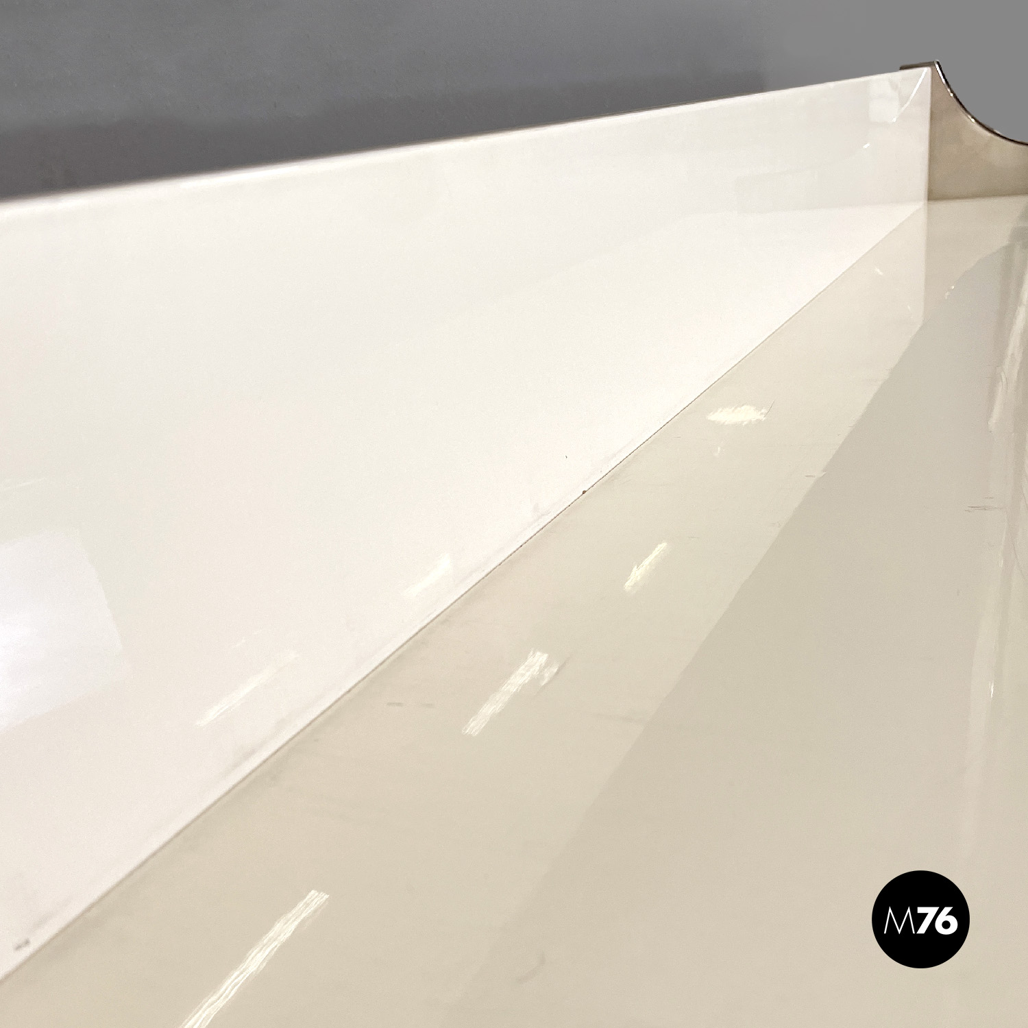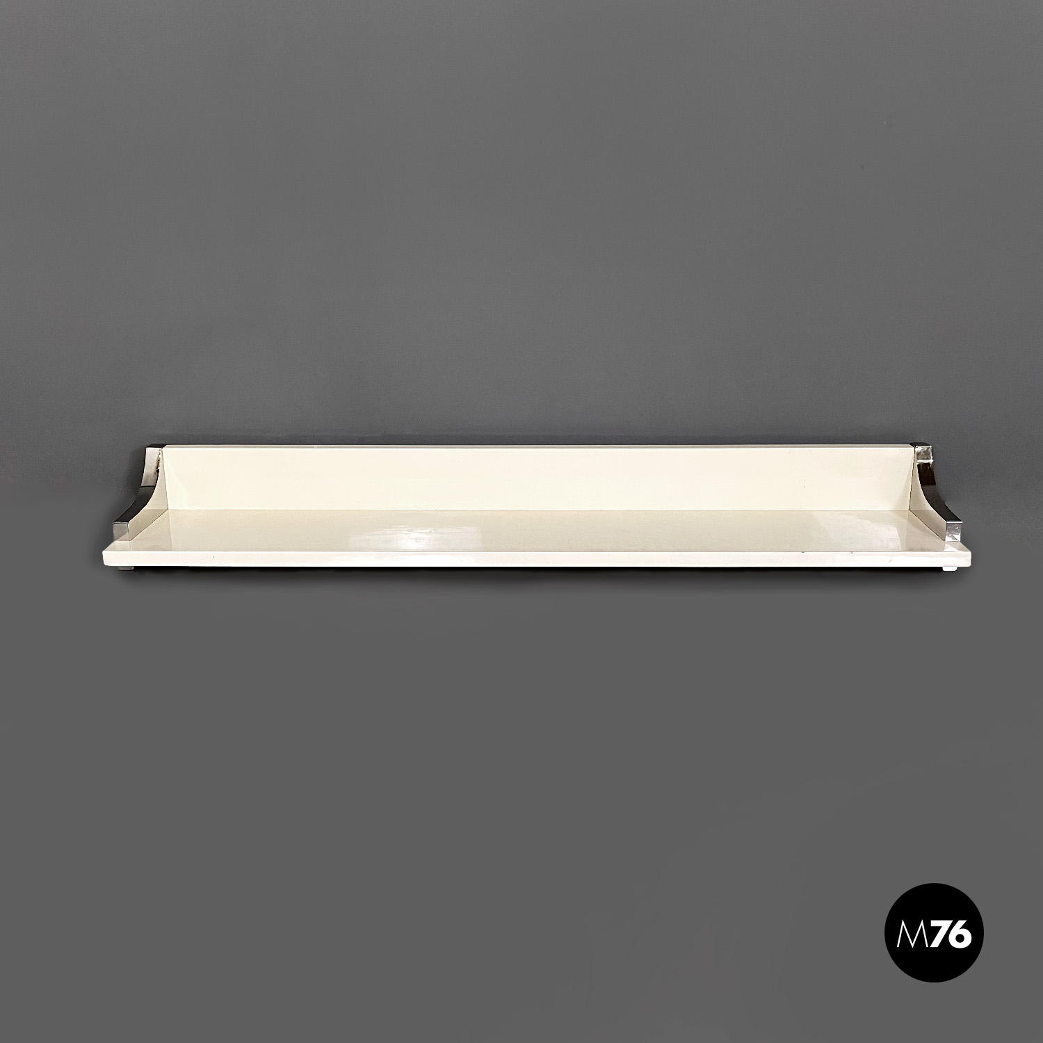 Mensola rettangolare, la struttura è in legno laccato bianco con finitura lucida. Ai due lati si trova un rivestimento decorativo in metallo cromato che ne segue la forma trapezoidale.