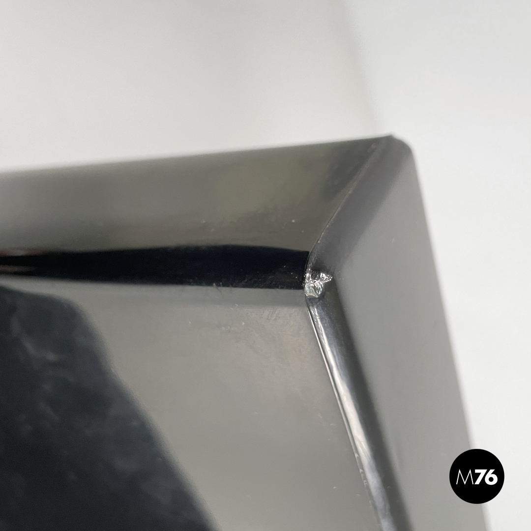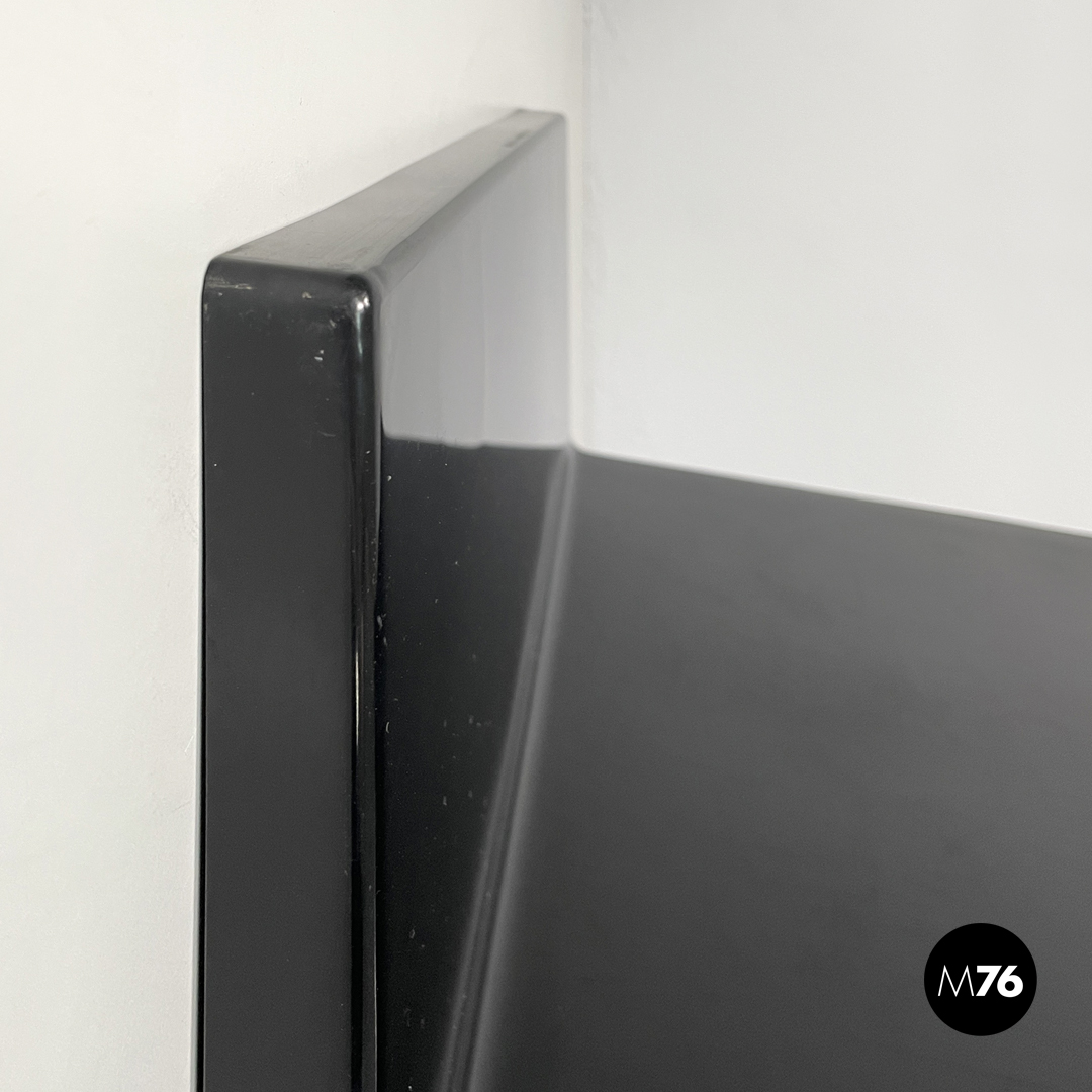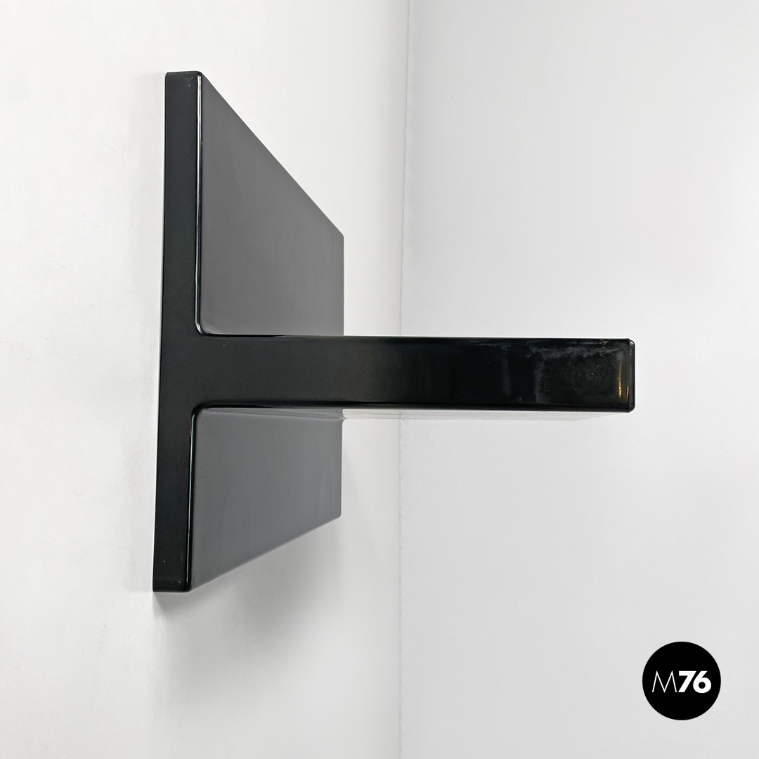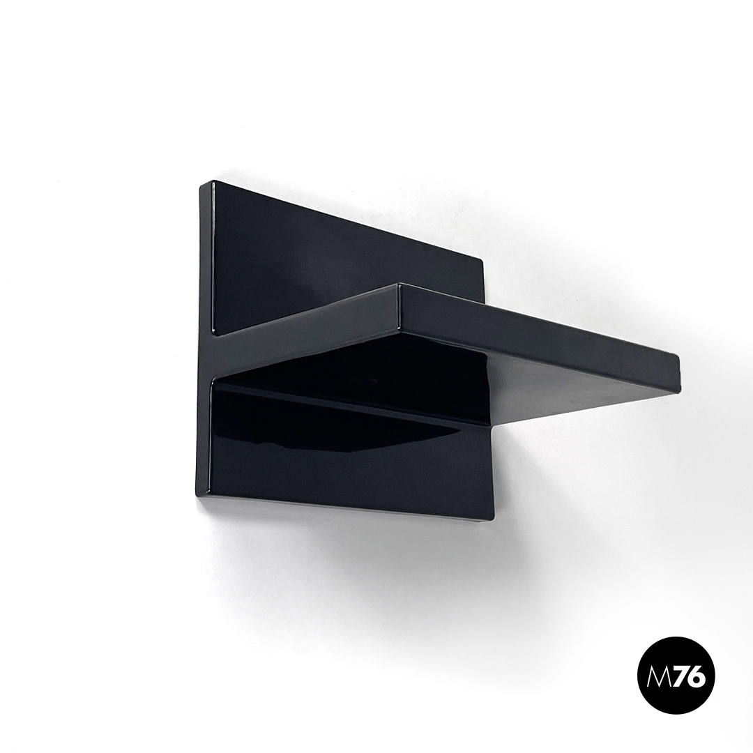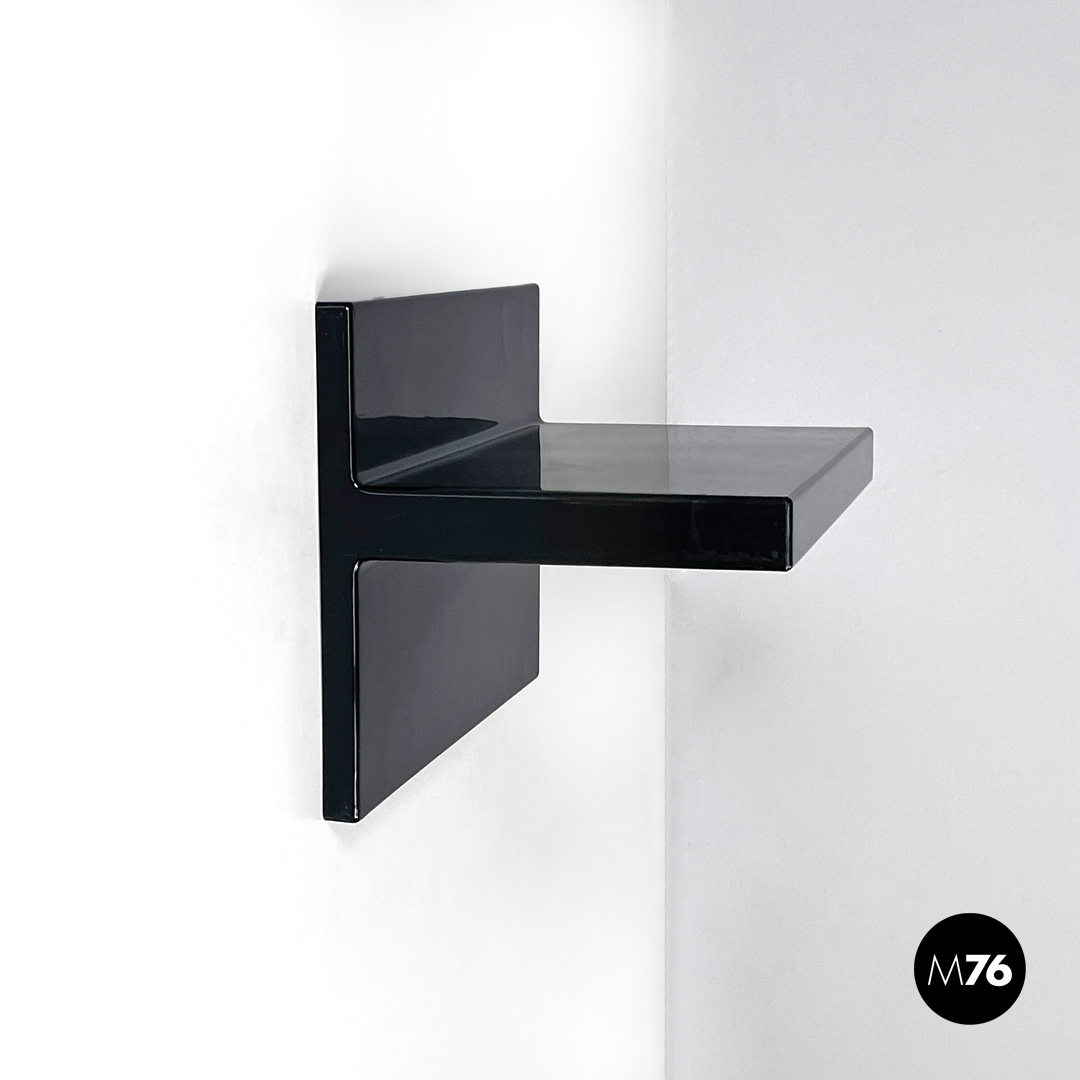 Mensola in plastica nera lucida con profilo geometrico. La mensola non è centrale alla struttura, in modo da poter essere appesa in due versi.