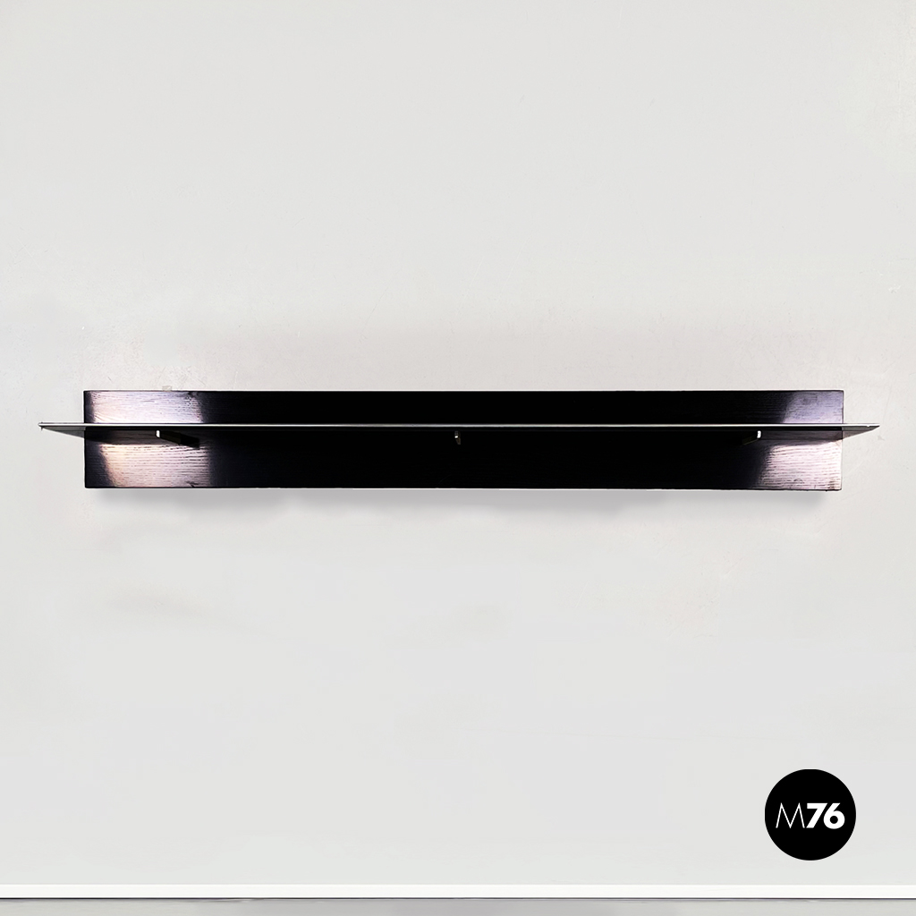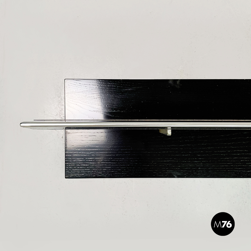 Mensola rettangolare in legno verniciato nero e rifiniture in acciaio. La mensola presenta un’asse verticale su cui sono posti i 3 sostegni in acciaio.
