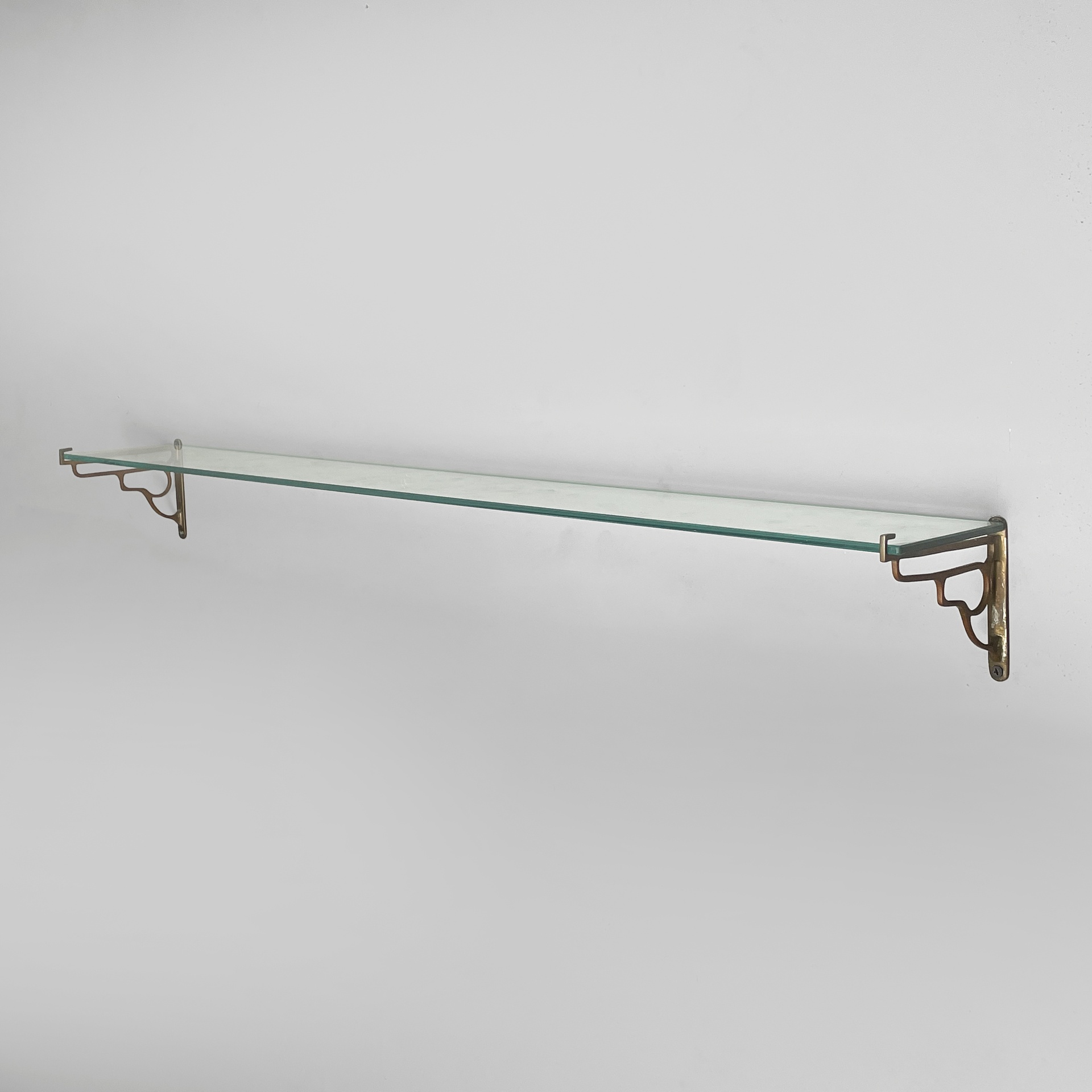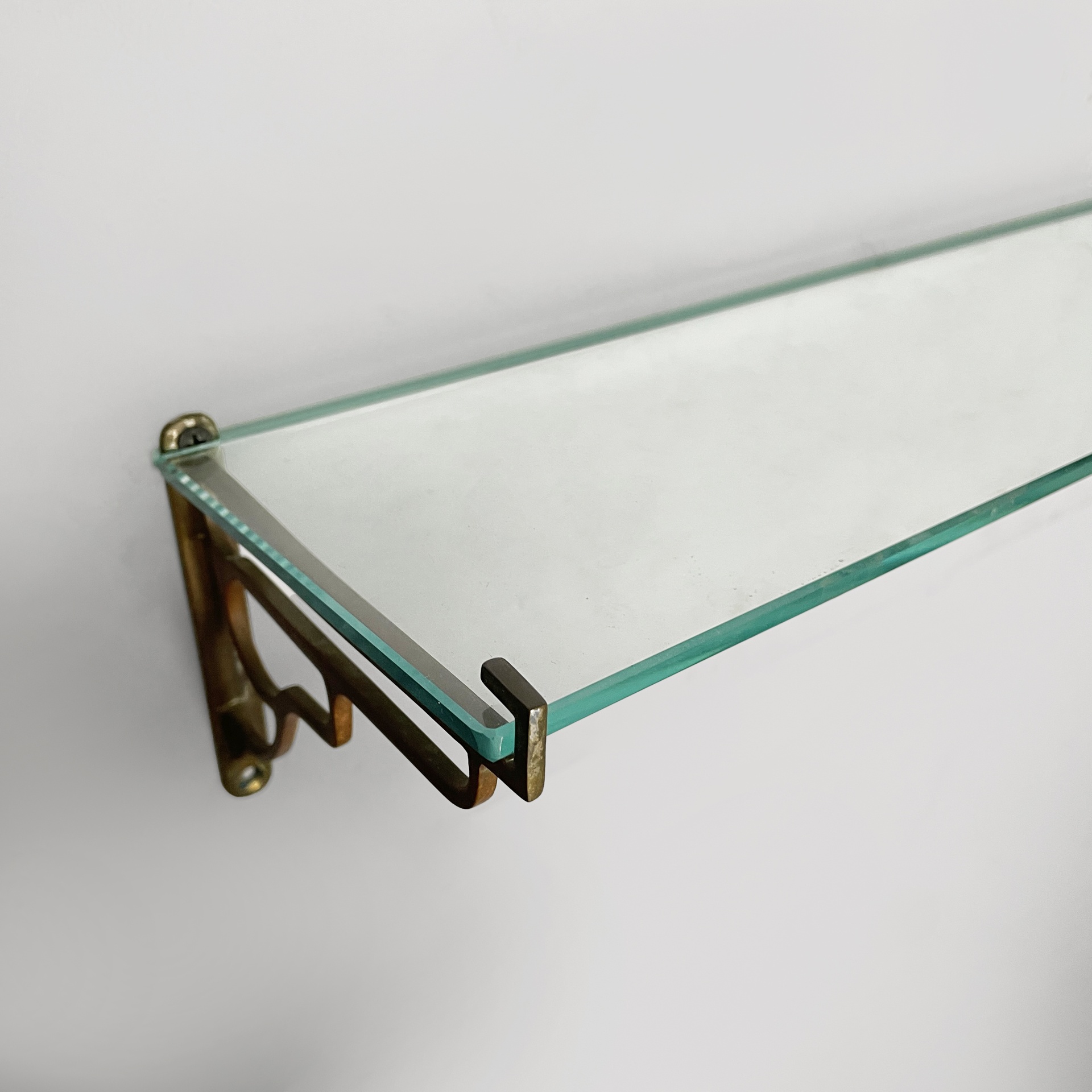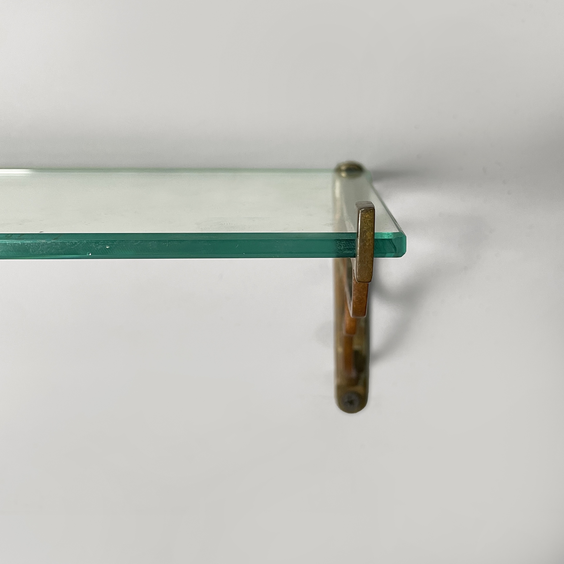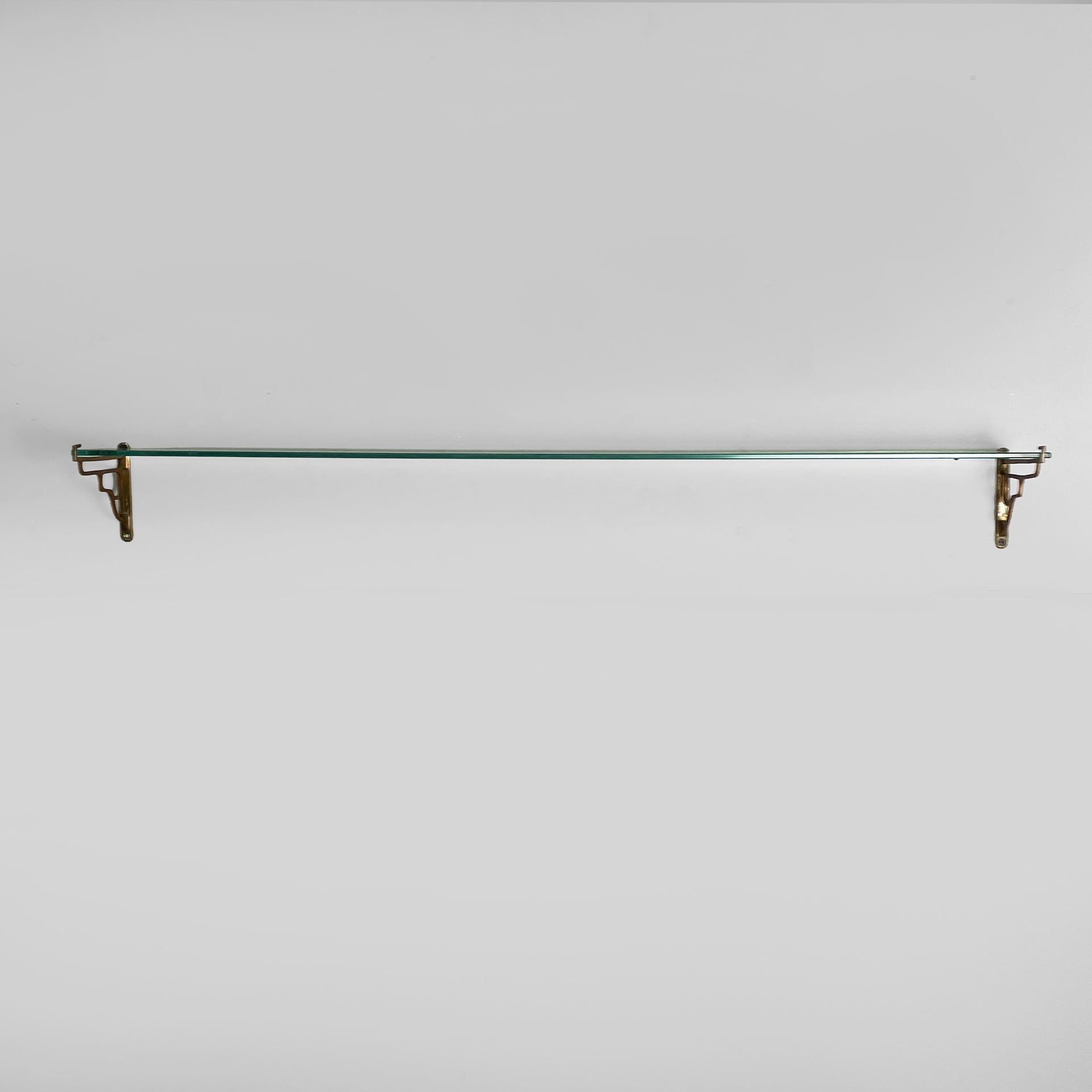 Mensola da parete rettangolare in vetro. I montanti sono in tondino di ottone curvato. Art Deco.