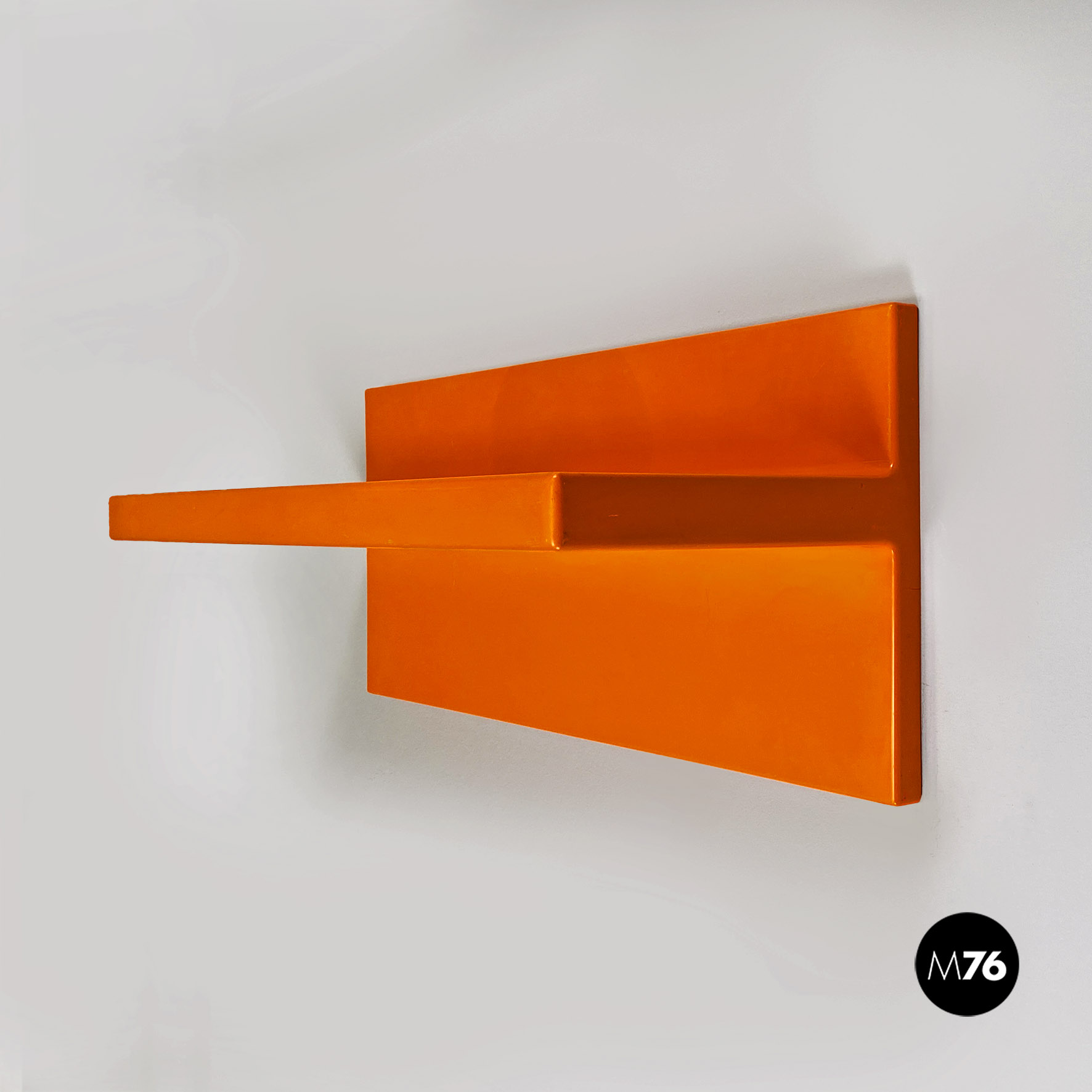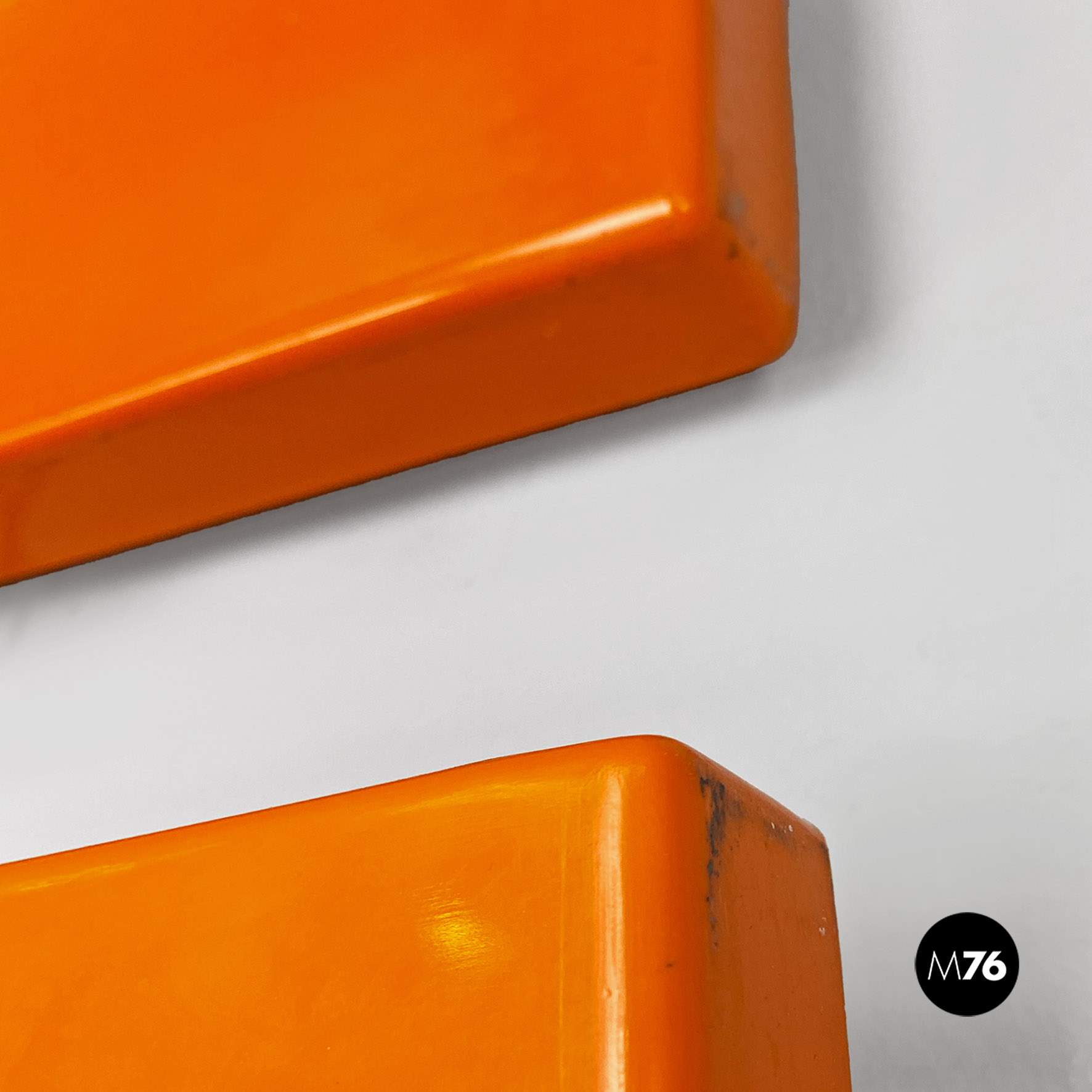 Set di tre mensole con profilo asimmetrico in plastica arancione lucida. Sono presenti due tipi di misure: una piccola e una grande ed è possibile montarle in entrambi i sensi.