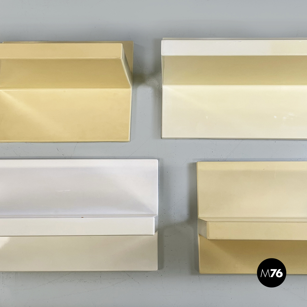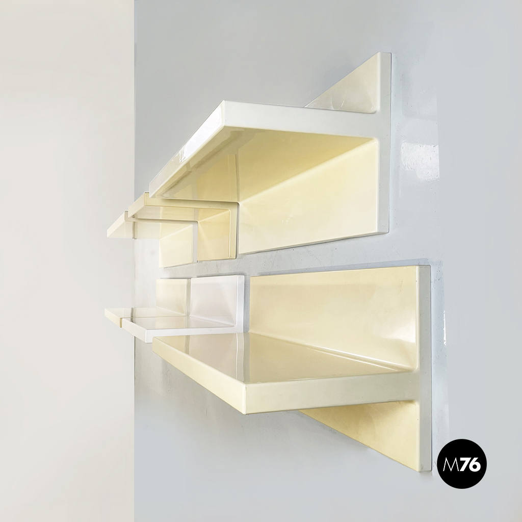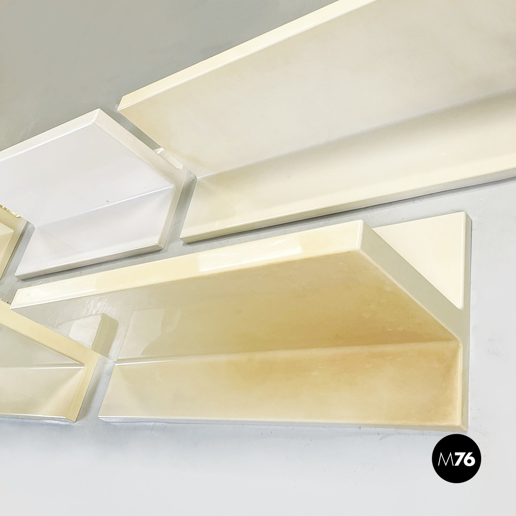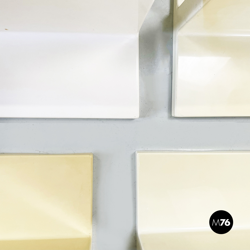 Set di sei mensole con profilo asimmetrico in plastica di colorazione che varia dal bianco al crema. È possibile montarle in entrambi i sensi.