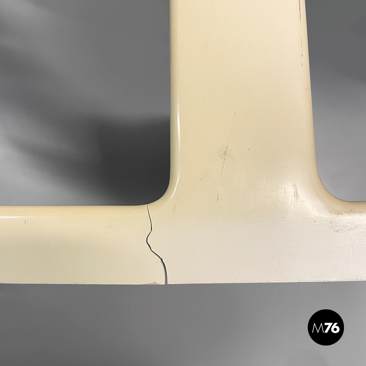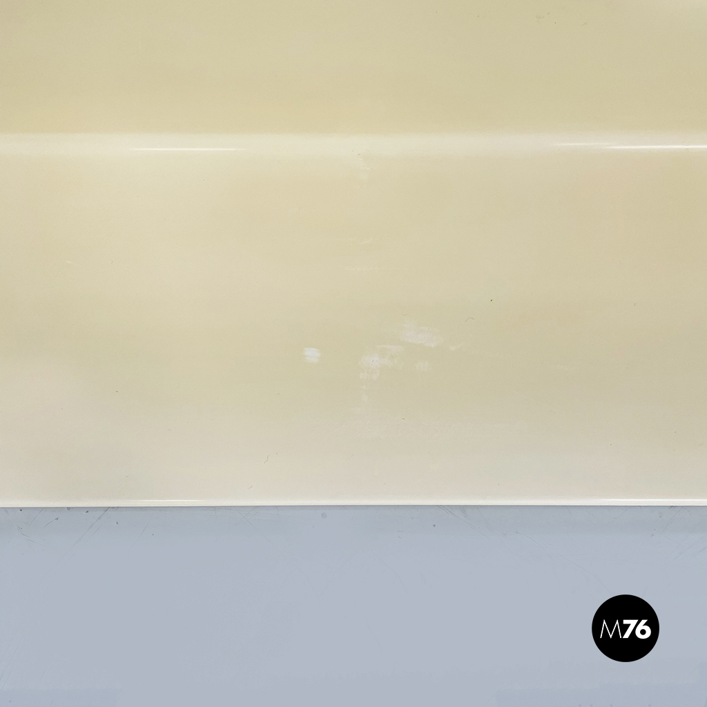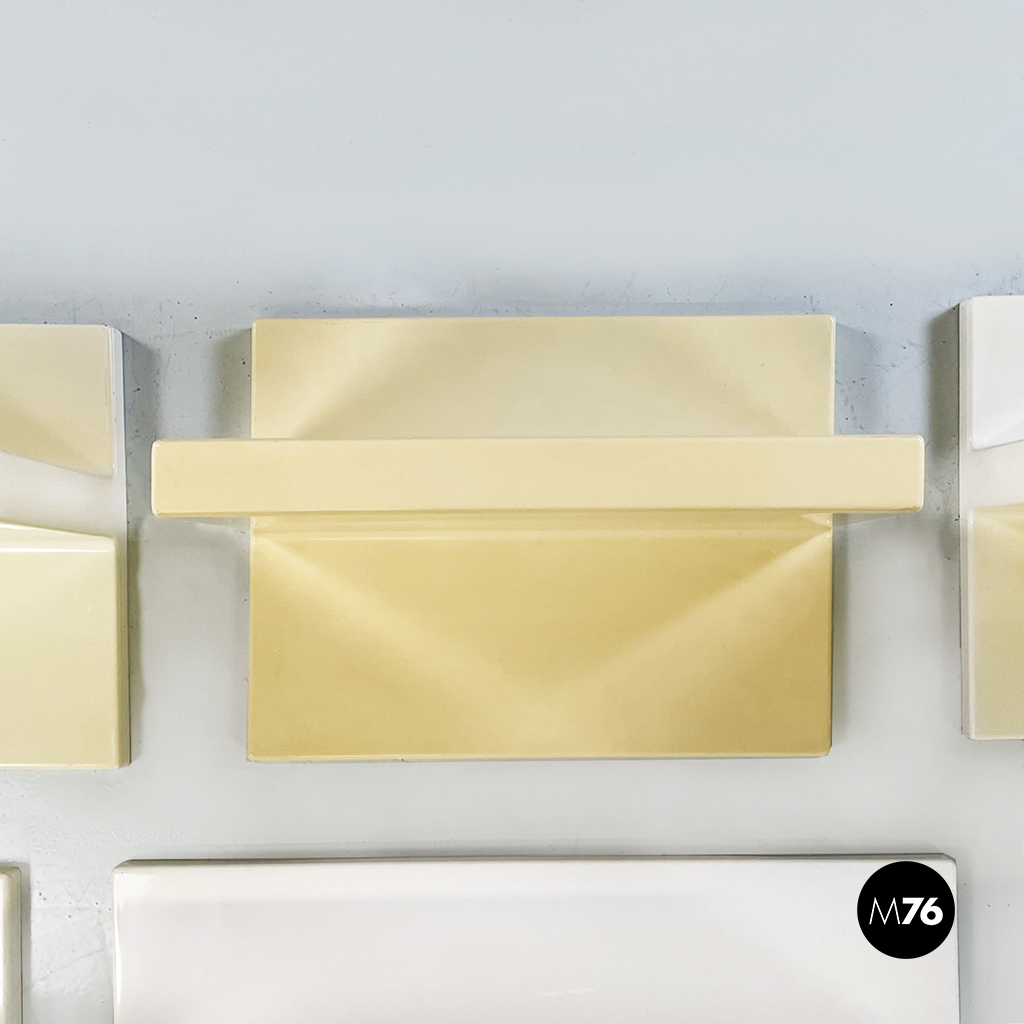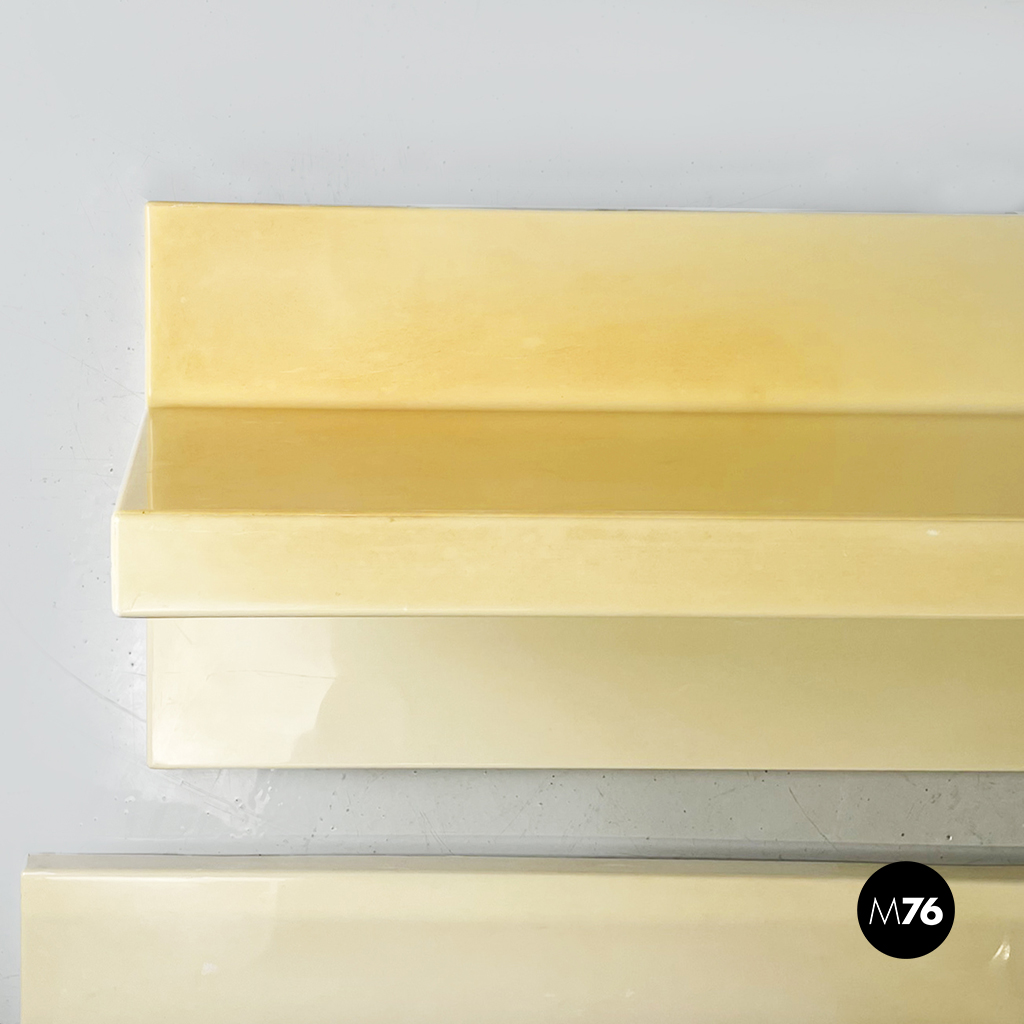 Set di sei mensole con profilo asimmetrico in plastica di colorazione che varia dal bianco al crema. È possibile montarle in entrambi i sensi.