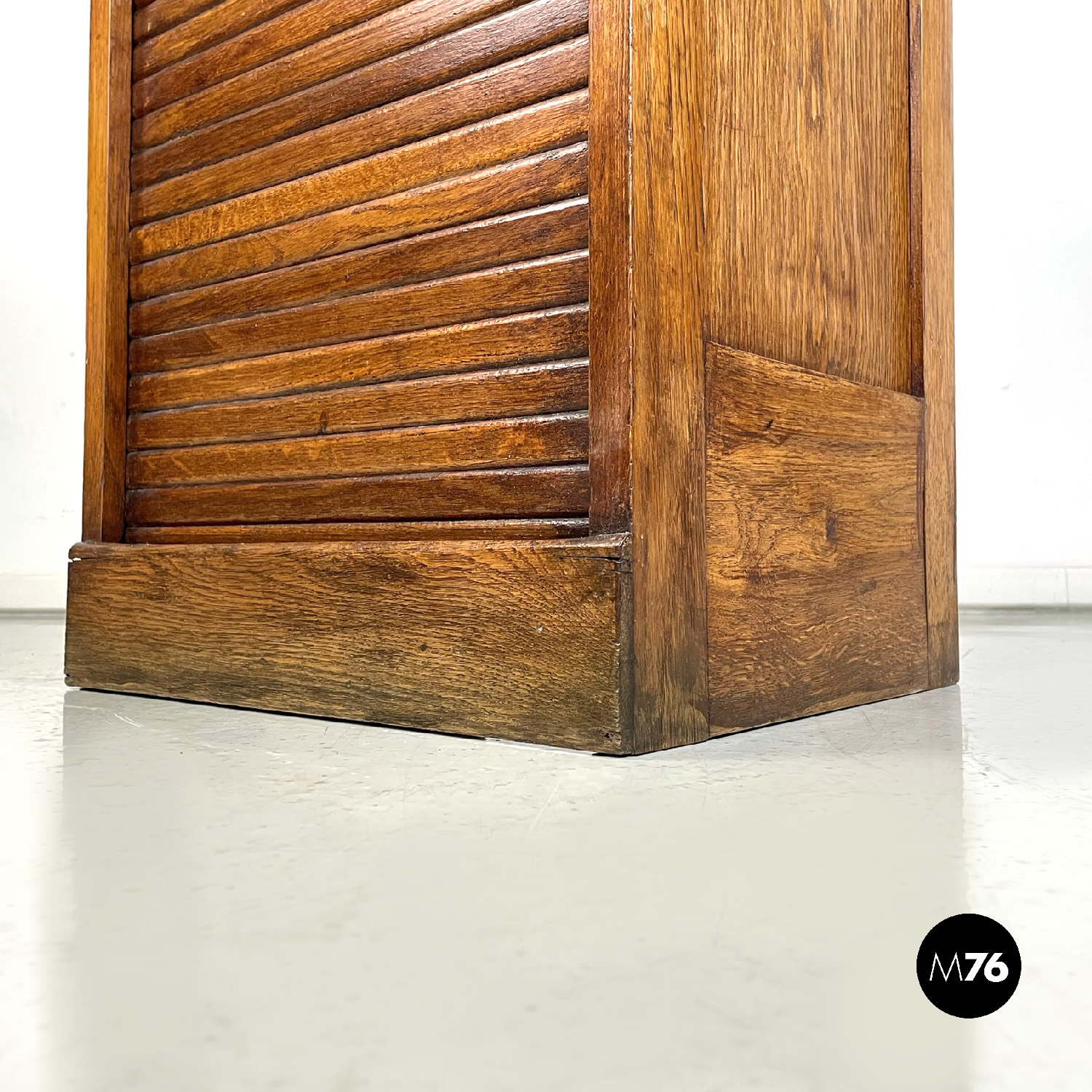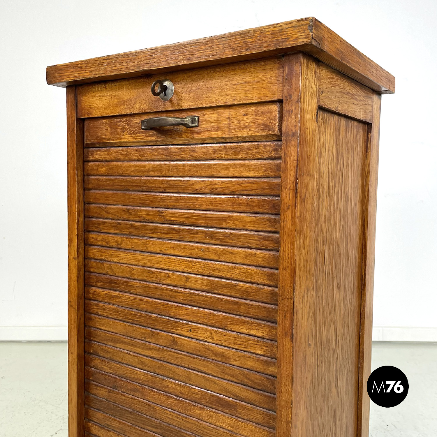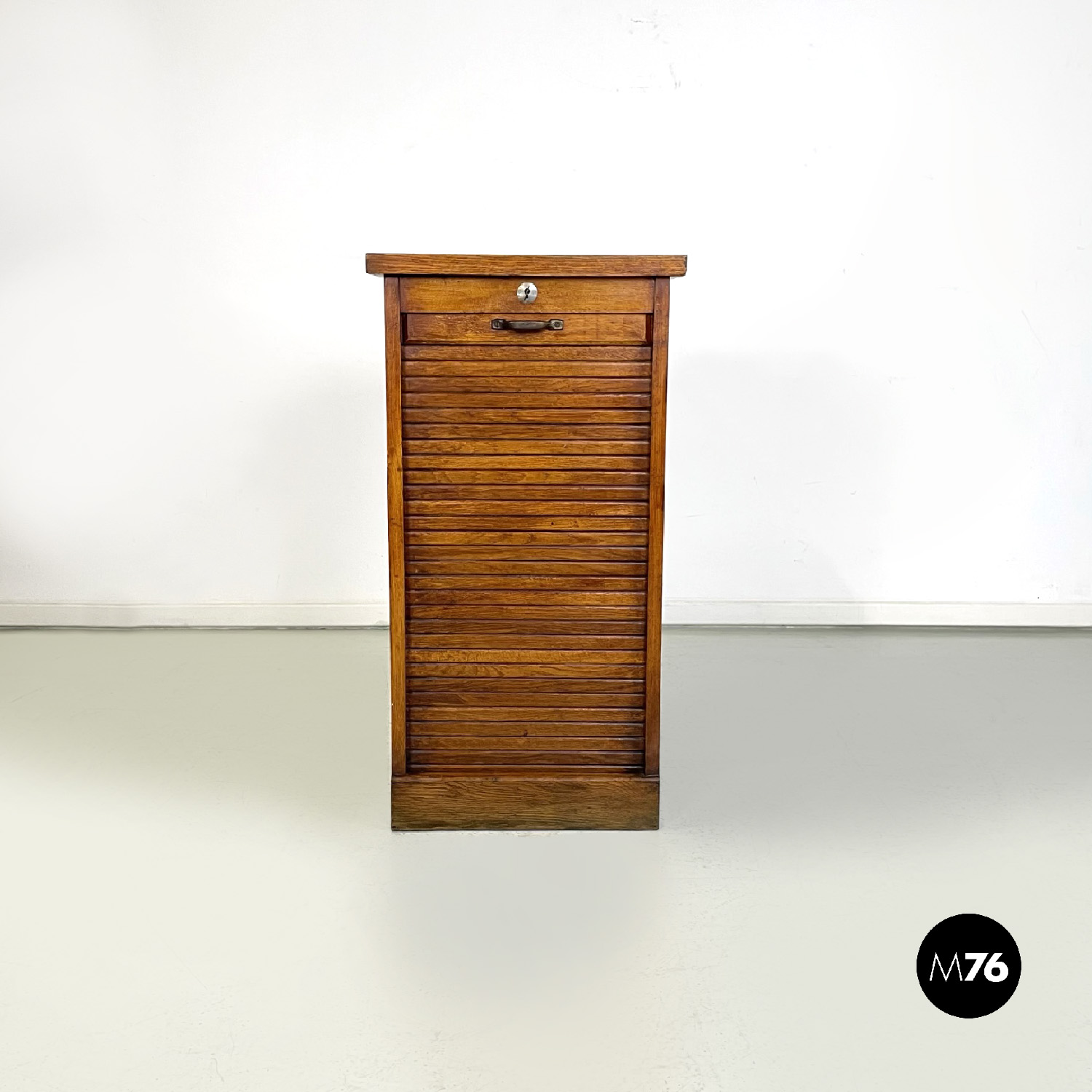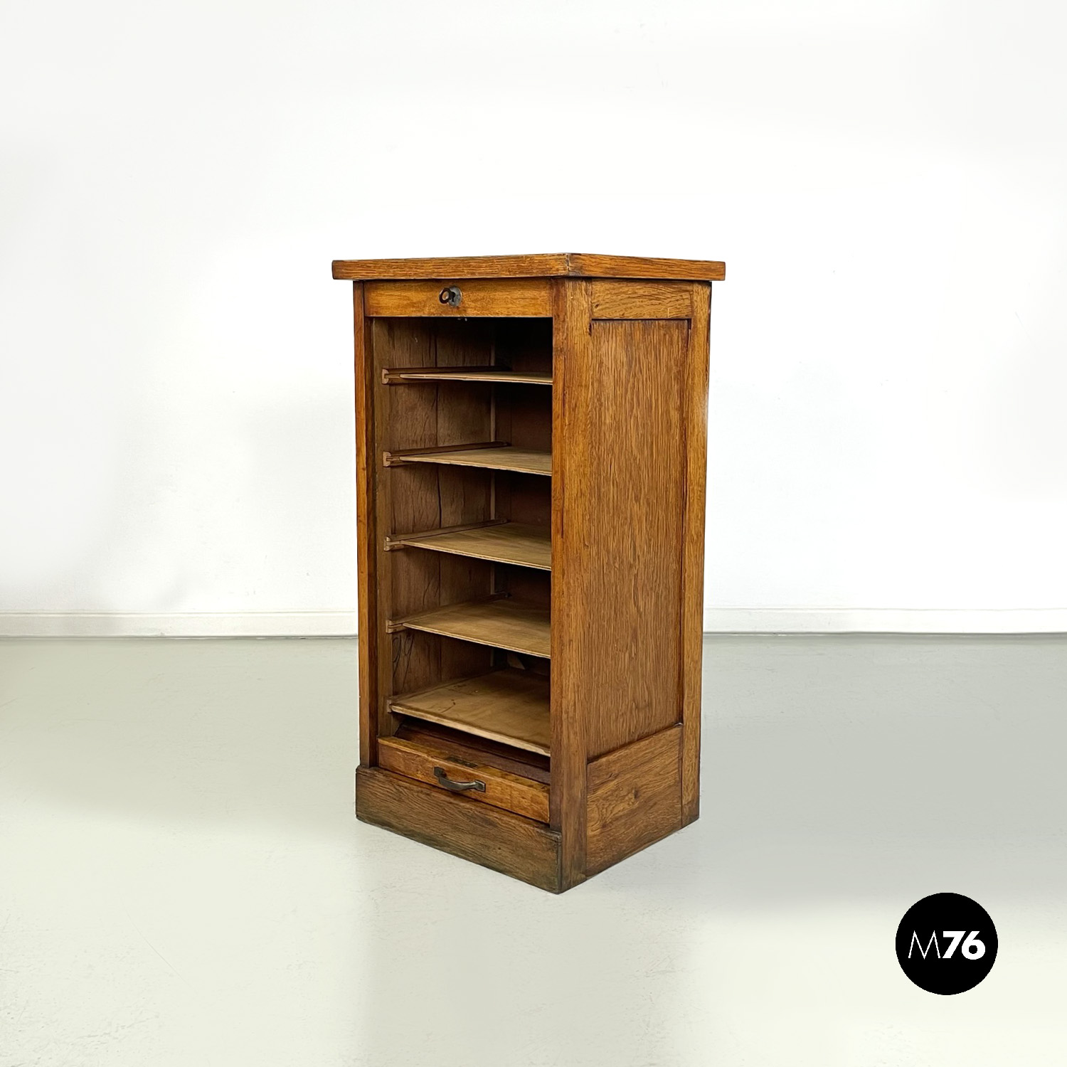 Mobile archivio da ufficio a base rettangolare in legno. Presenta un’apertura a serrandina, nella parte interna ci sono diversi ripiani. La maniglia per l’apertura è in metallo. Chiave presente.