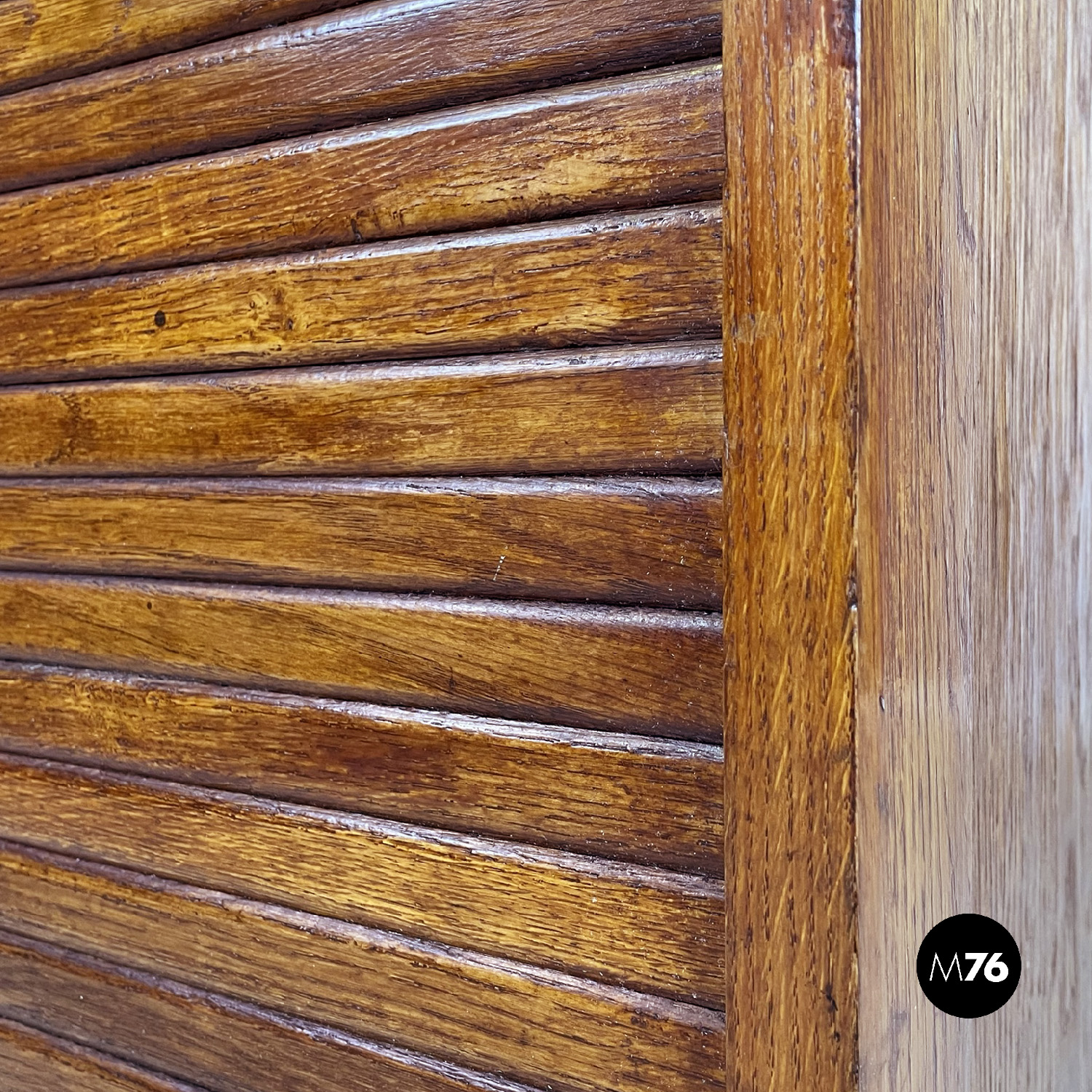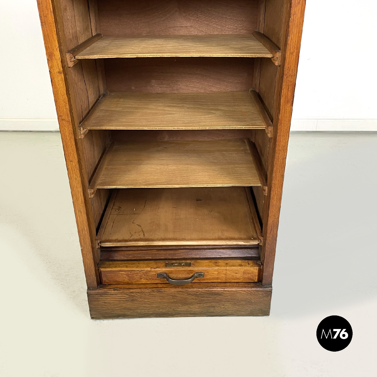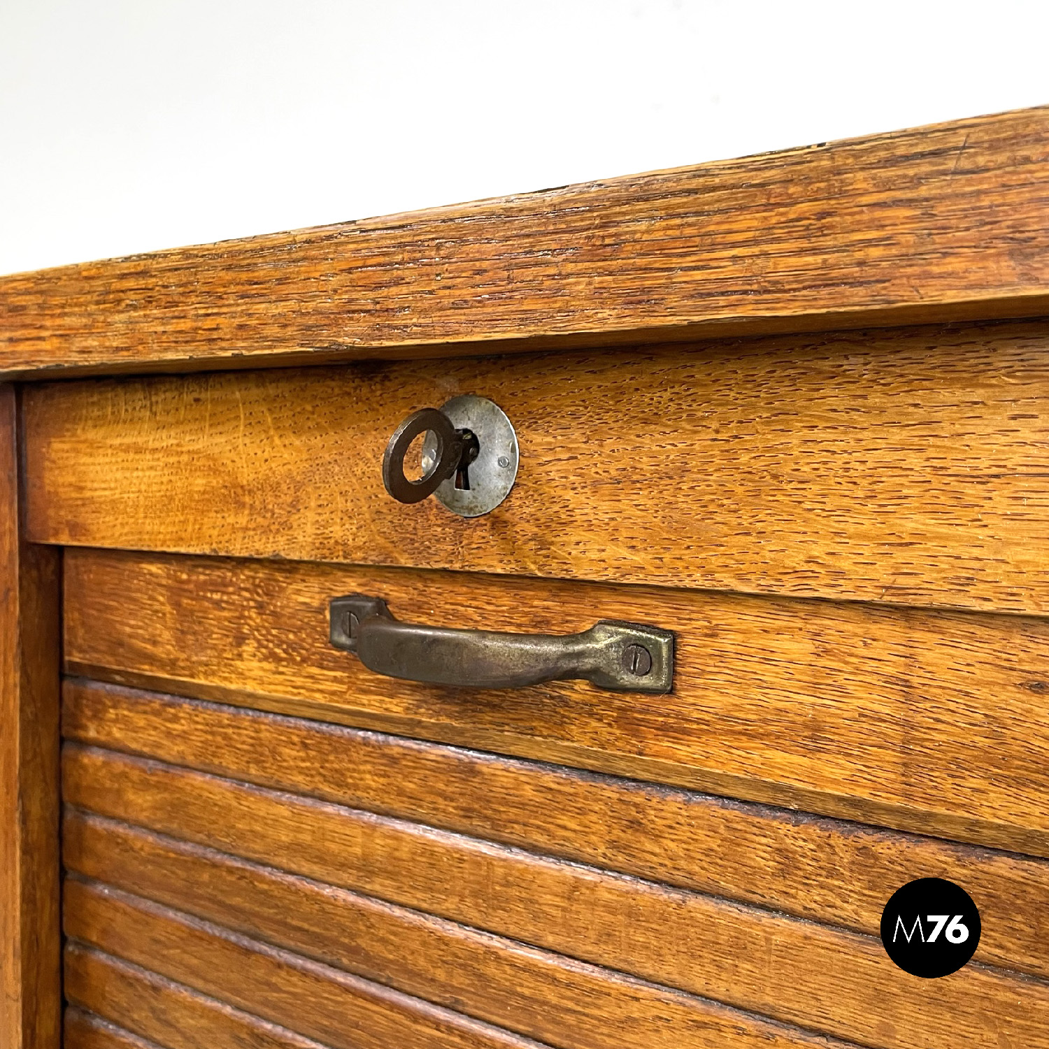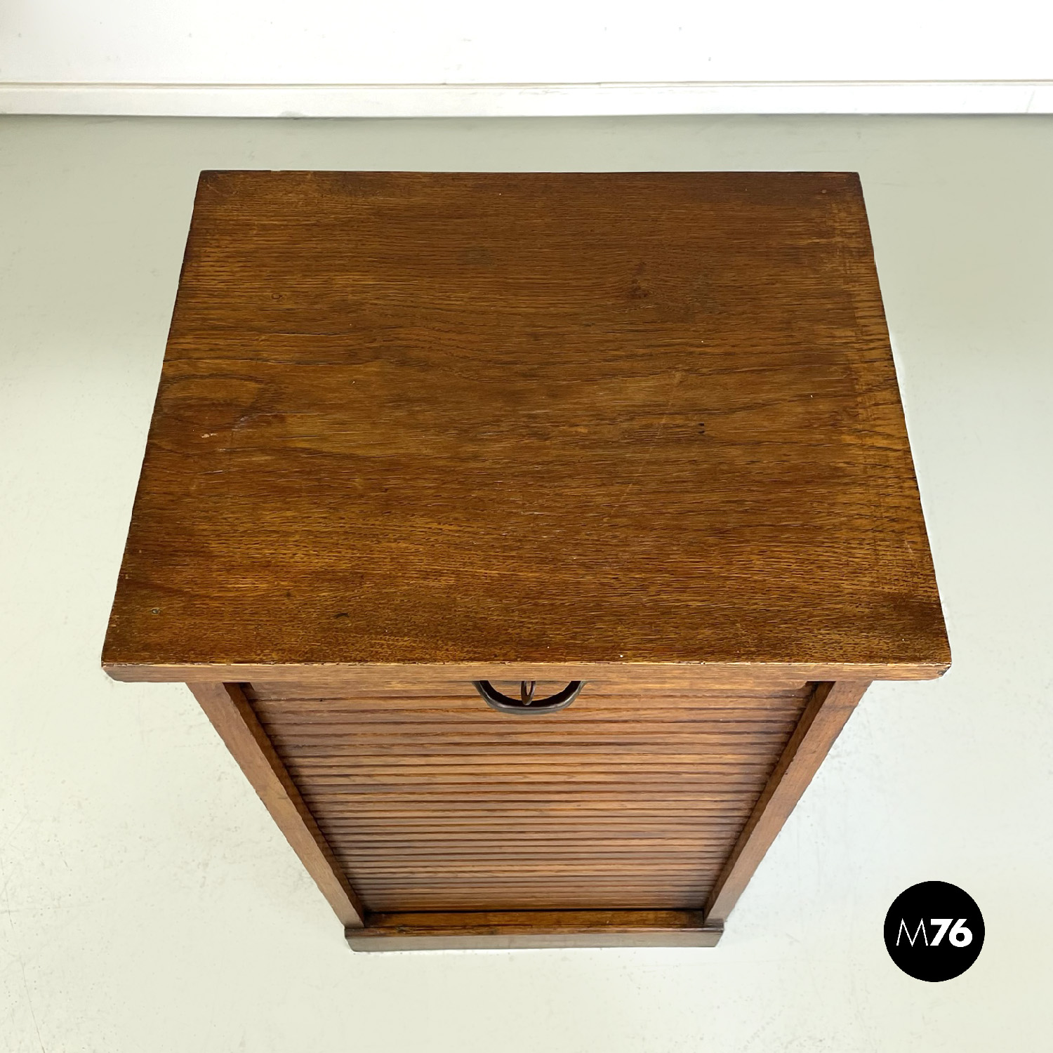 Mobile archivio da ufficio a base rettangolare in legno. Presenta un’apertura a serrandina, nella parte interna ci sono diversi ripiani. La maniglia per l’apertura è in metallo. Chiave presente.