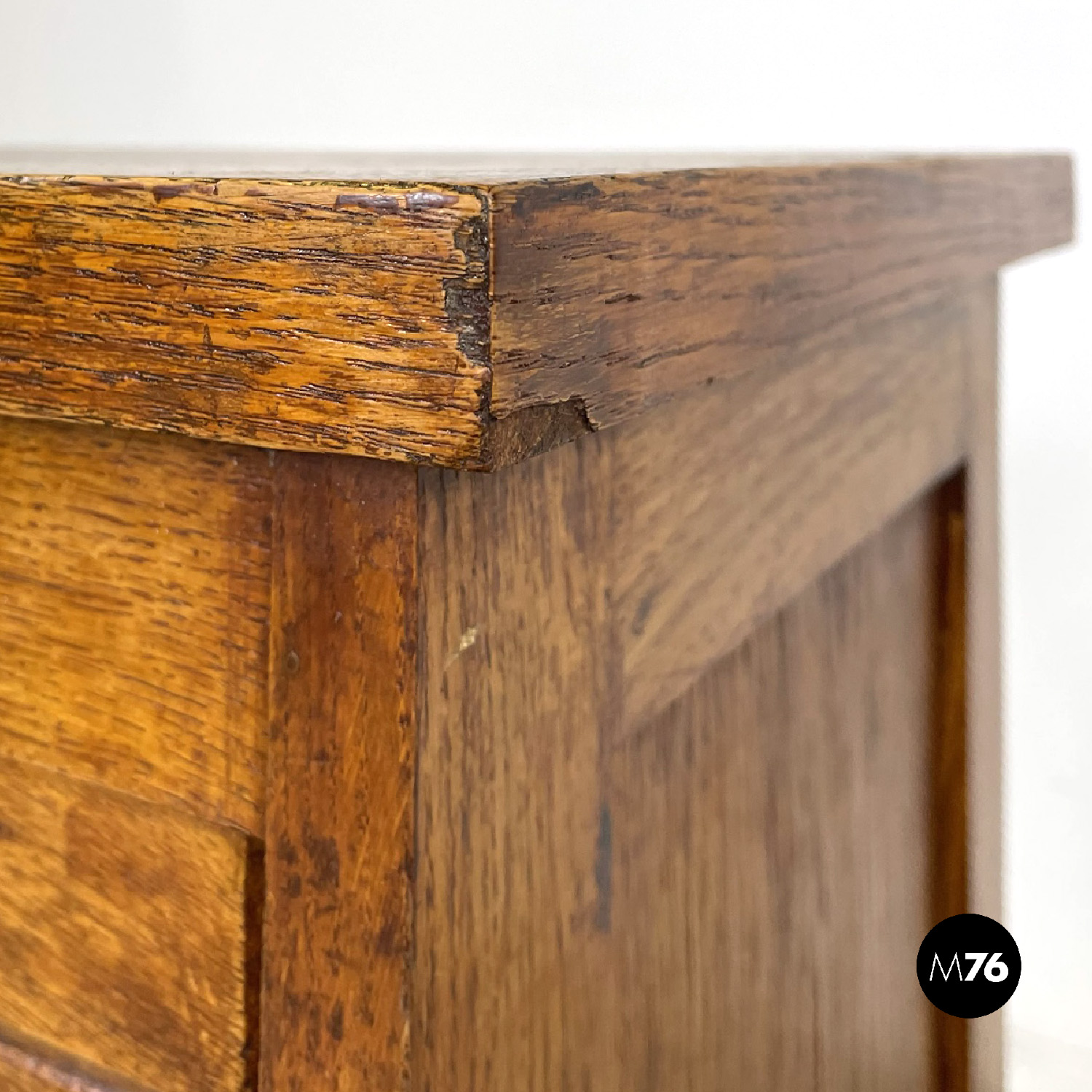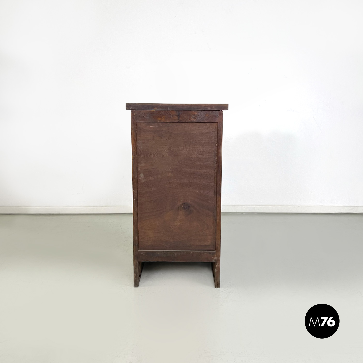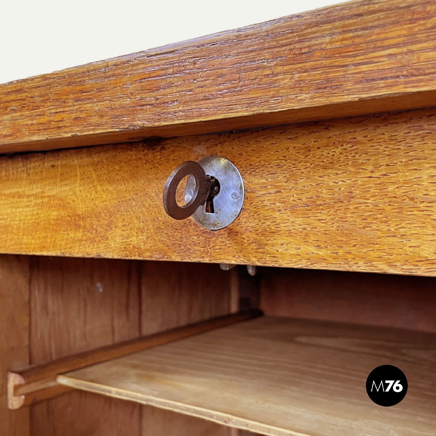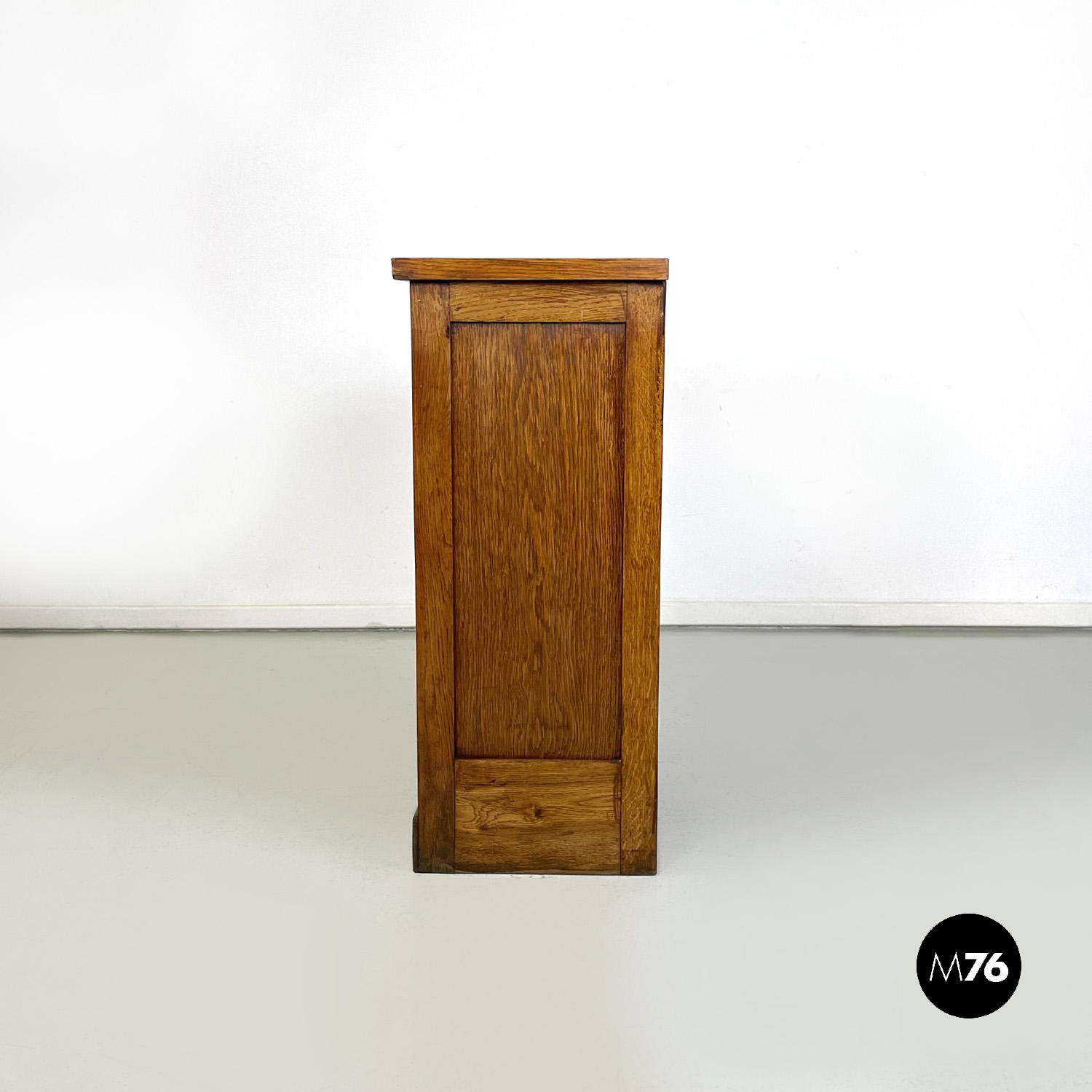 Mobile archivio da ufficio a base rettangolare in legno. Presenta un’apertura a serrandina, nella parte interna ci sono diversi ripiani. La maniglia per l’apertura è in metallo. Chiave presente.