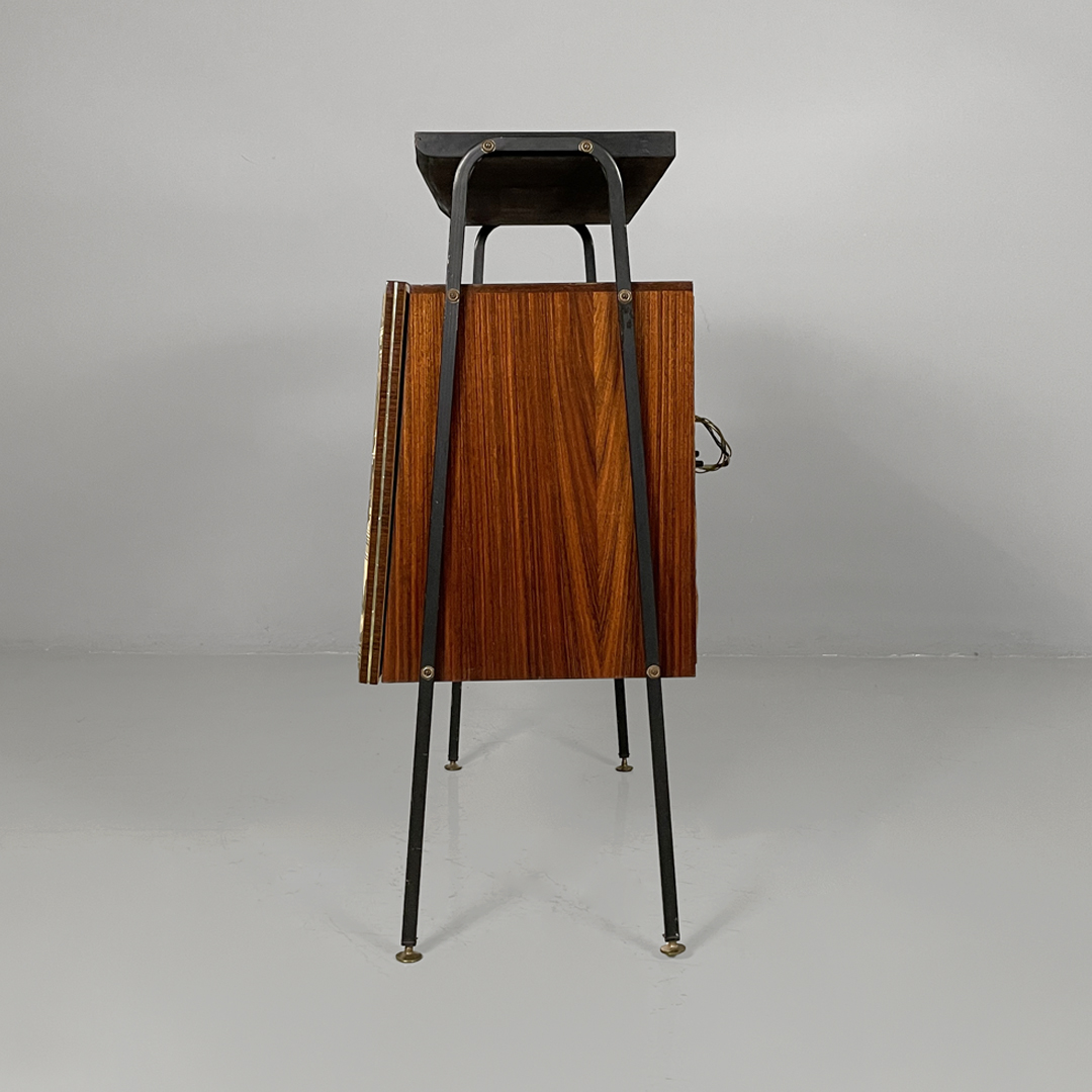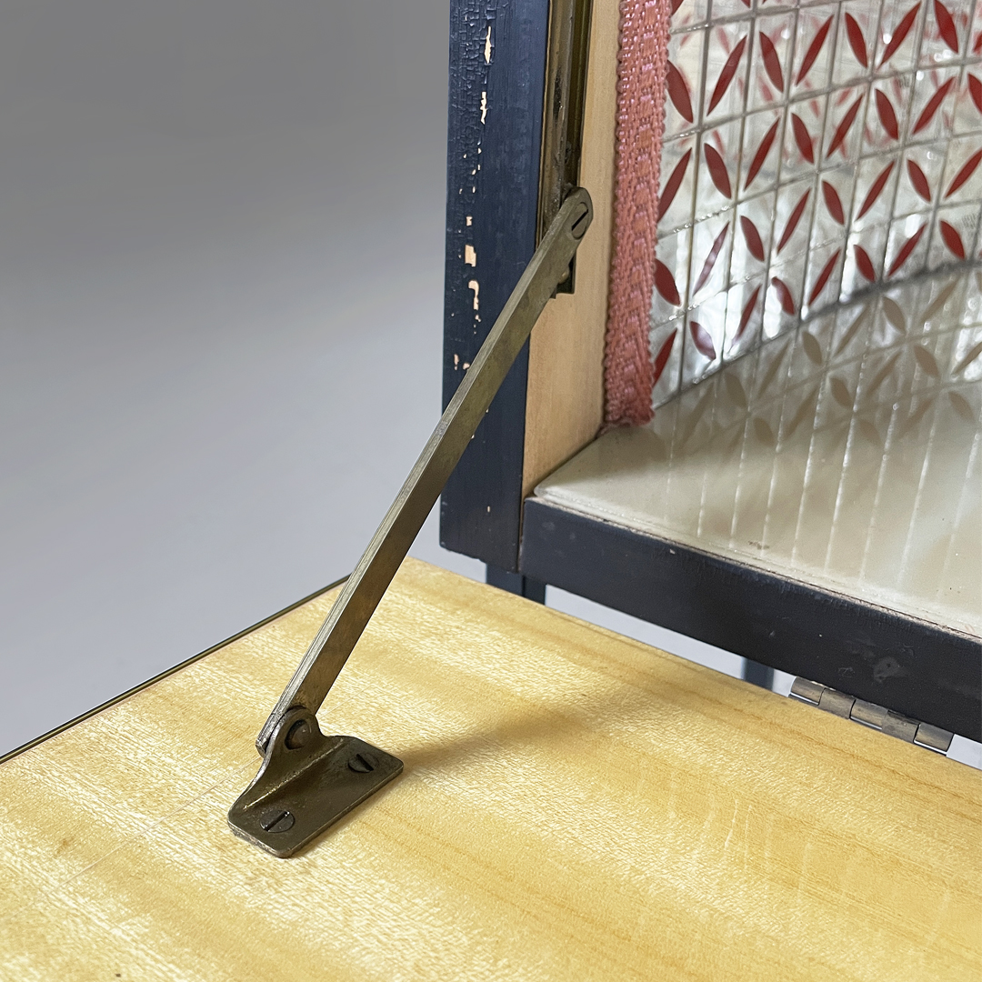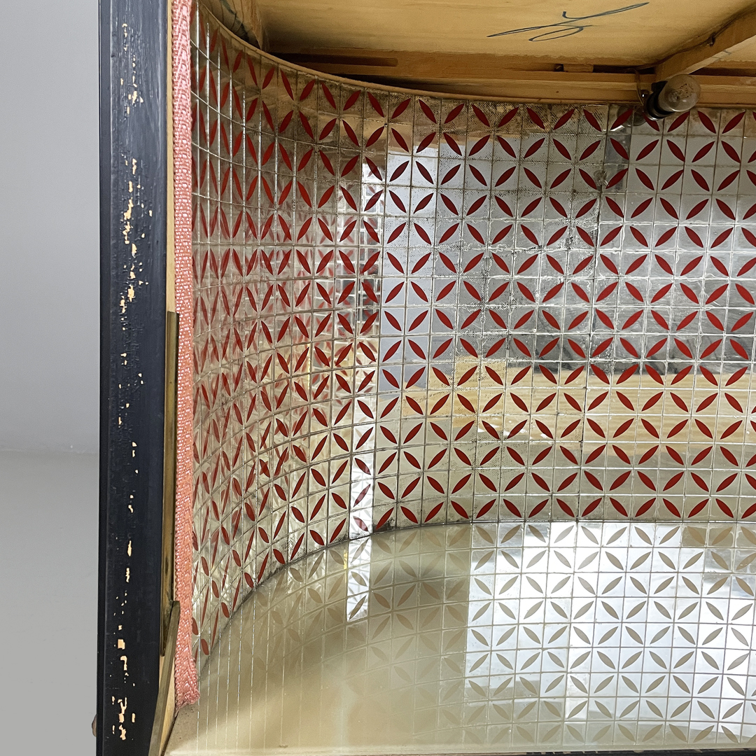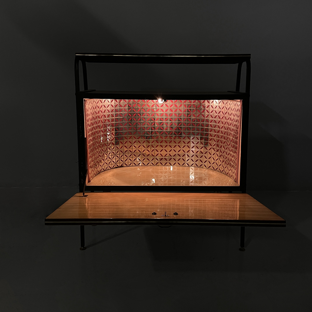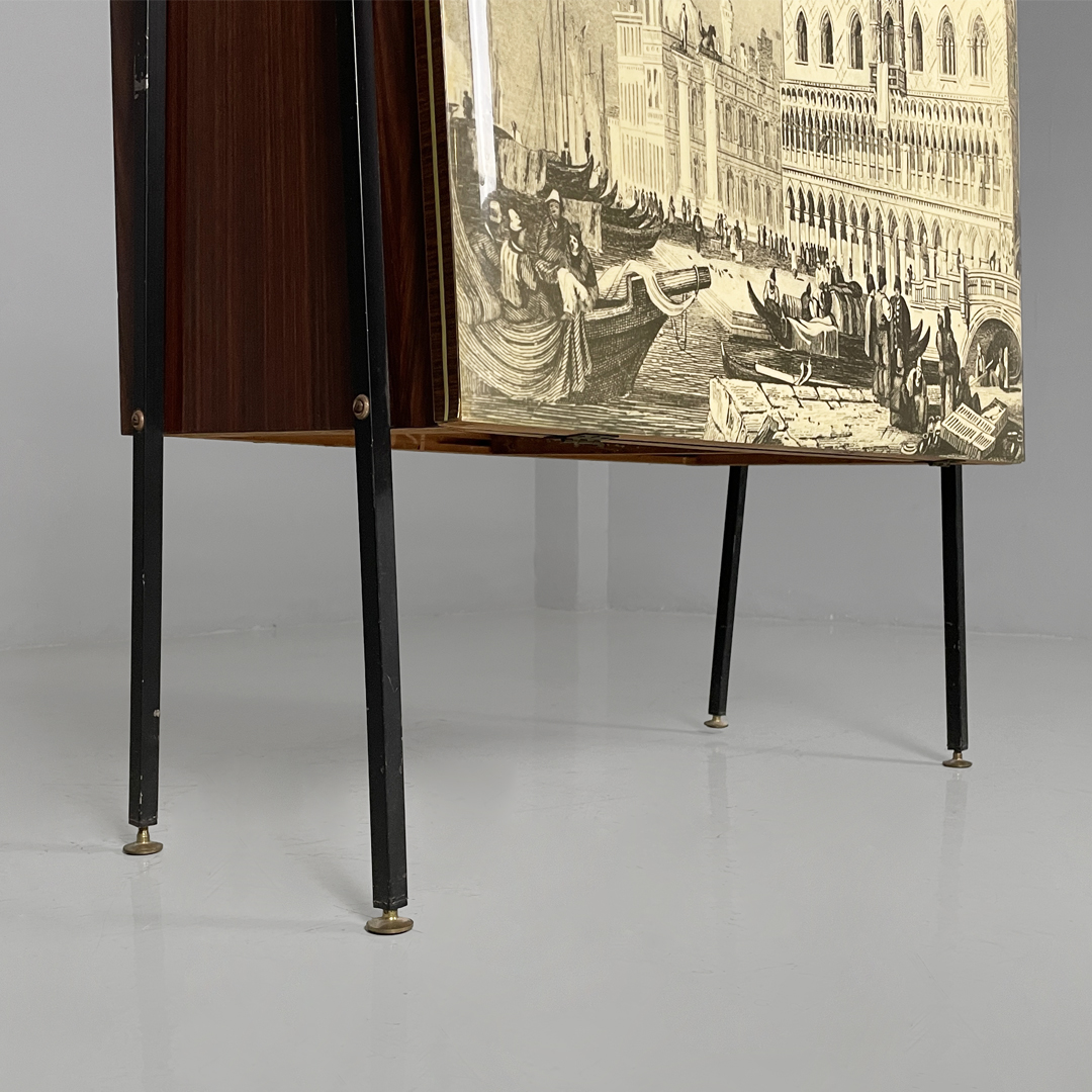 Mobile bar rettangolare interamente in legno. Presenta una struttura in metallo nero con piedini tondi in ottone regolabili. Il corpo è realizzato in legno, il fronte presenta un pannello decorativo illustrato, con un ambientazione veneziana. L’interno è rifinito con una grafica geometrica specchiata dai toni rossi e presenta una passamaneria di colore rosa. Il mobile è provvisto di illuminazione interna automatica all’apertura dello sportello.
